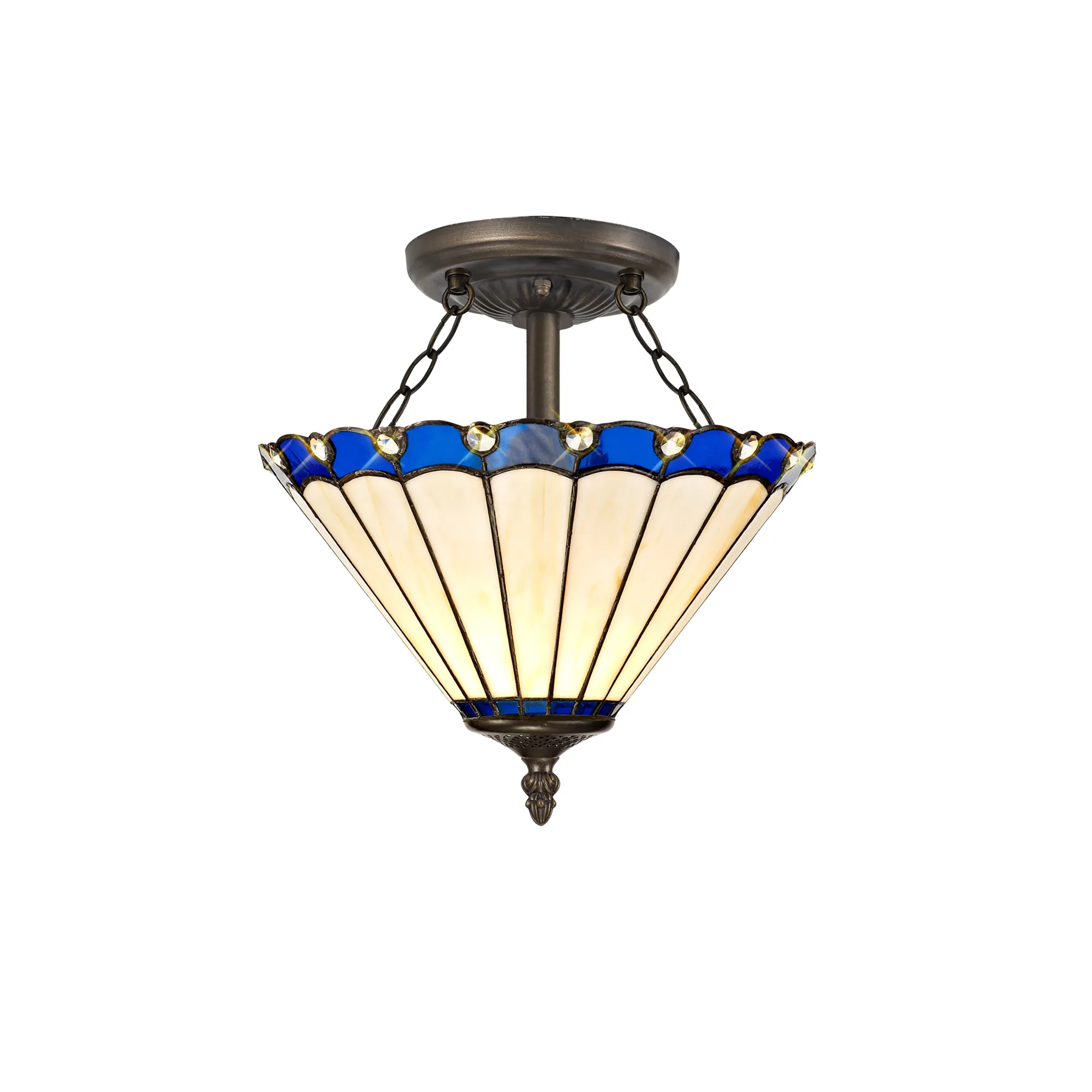 Farquhar 40.5cm 3 Light Semi Flush E27 With 40cm Tiffany Shade, Amber/Cream/Crystal/Aged Antique Brass
