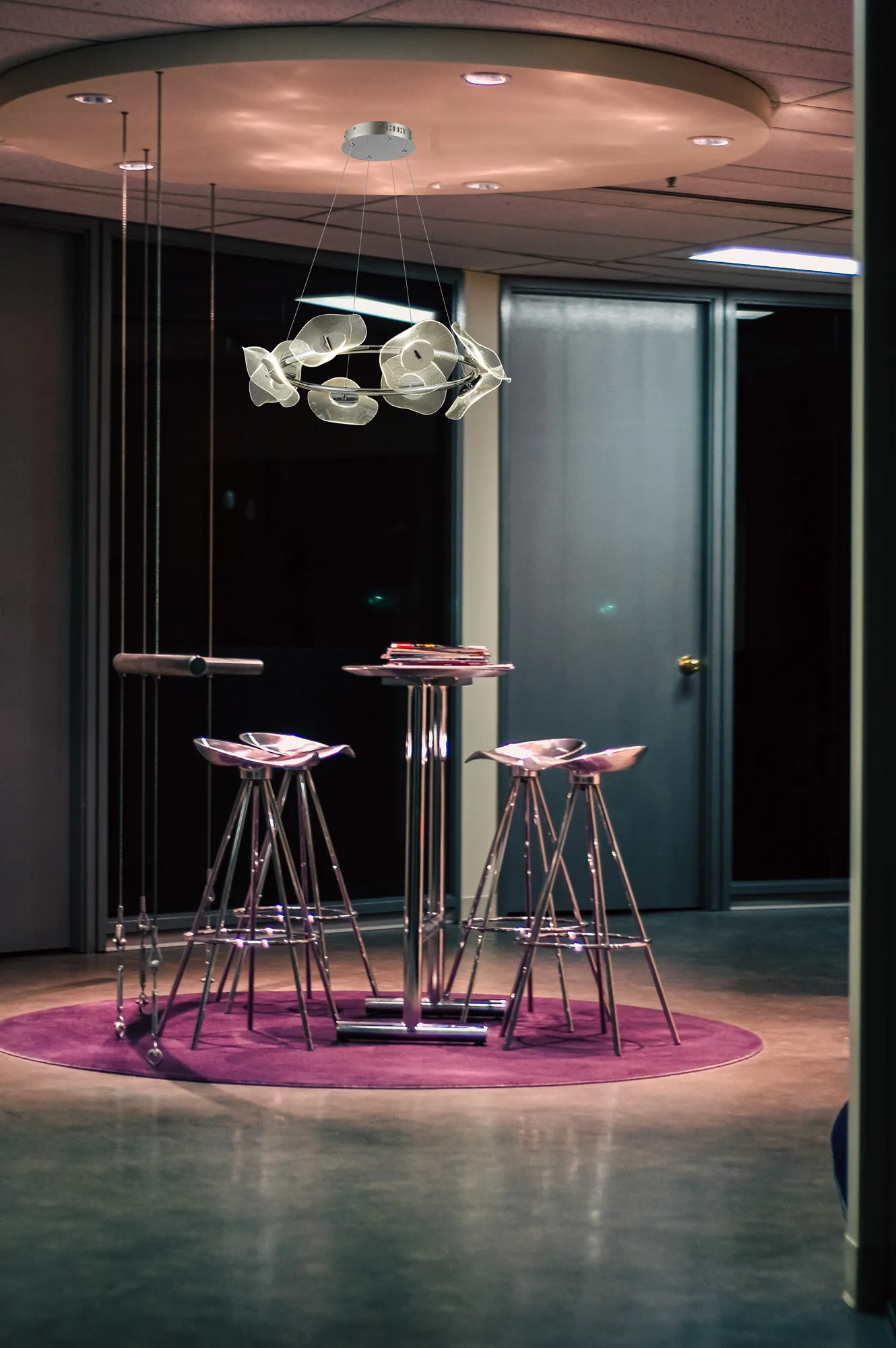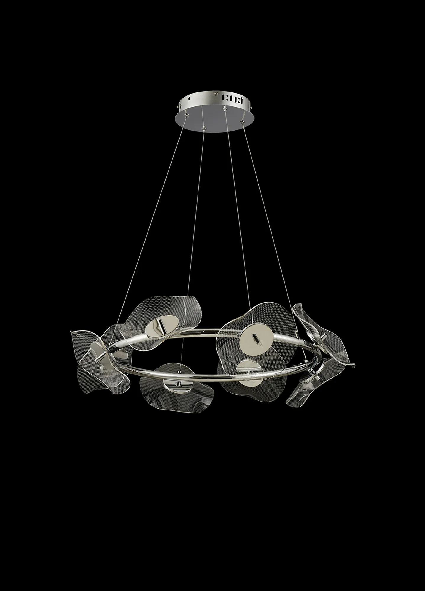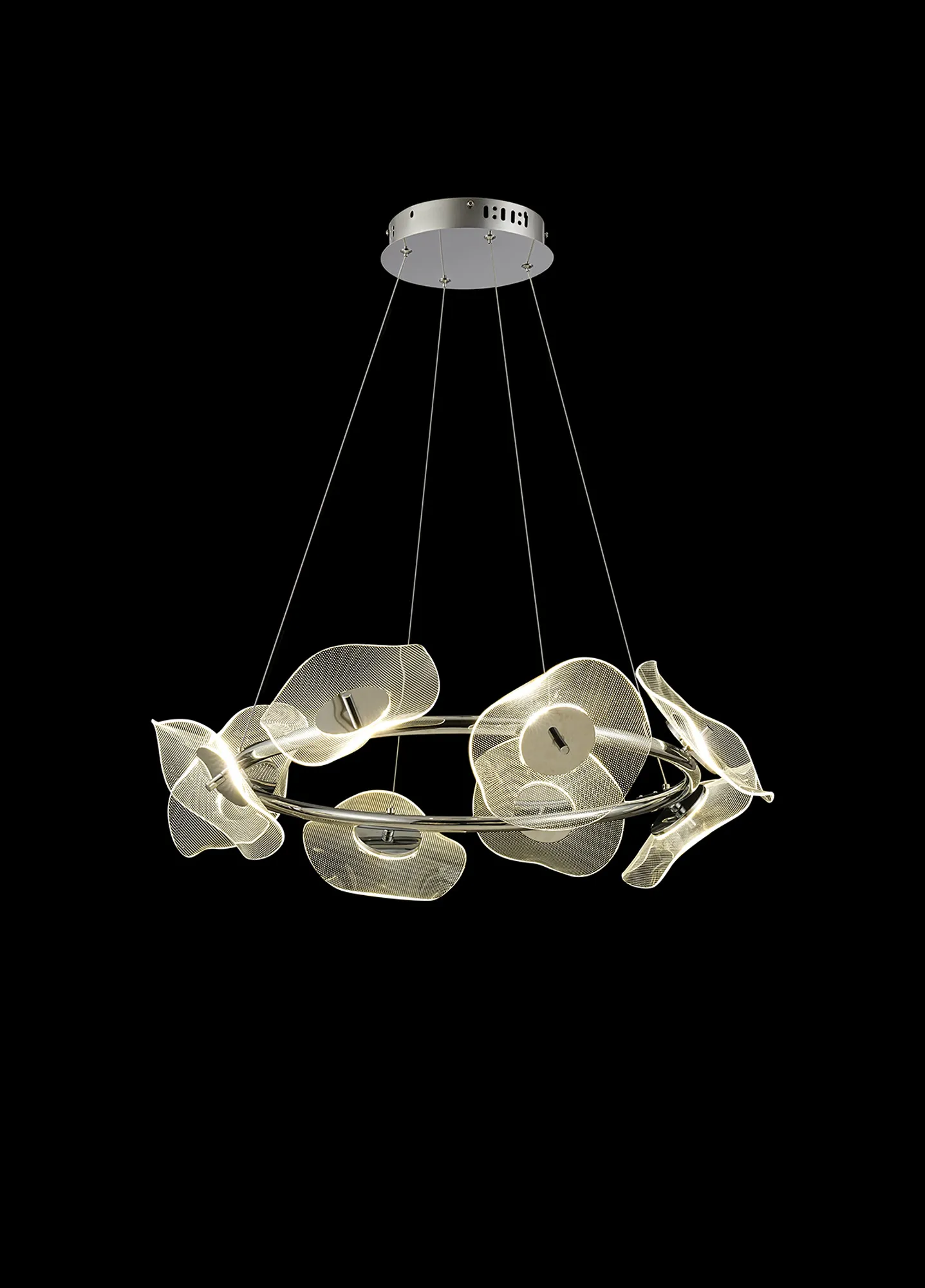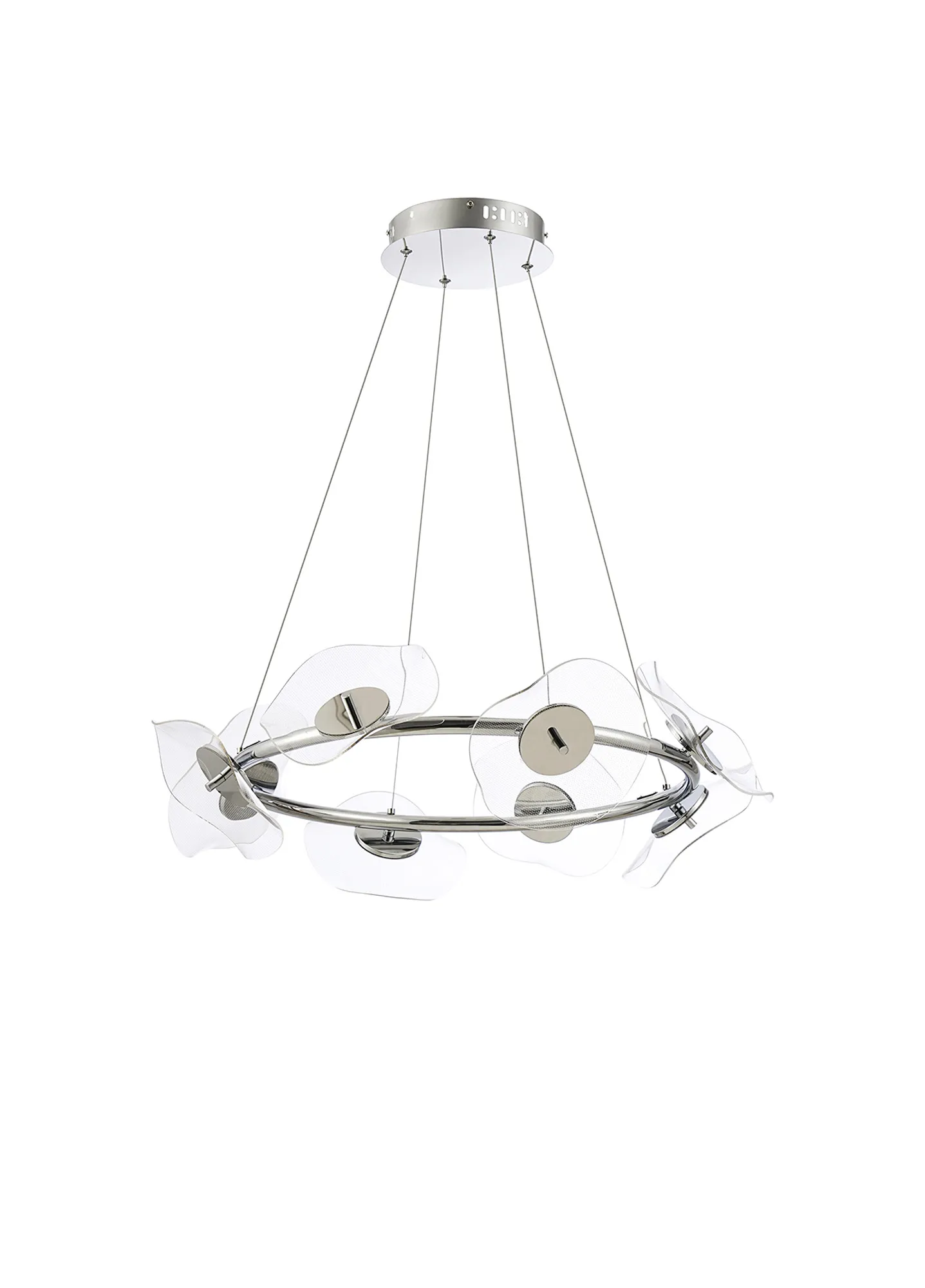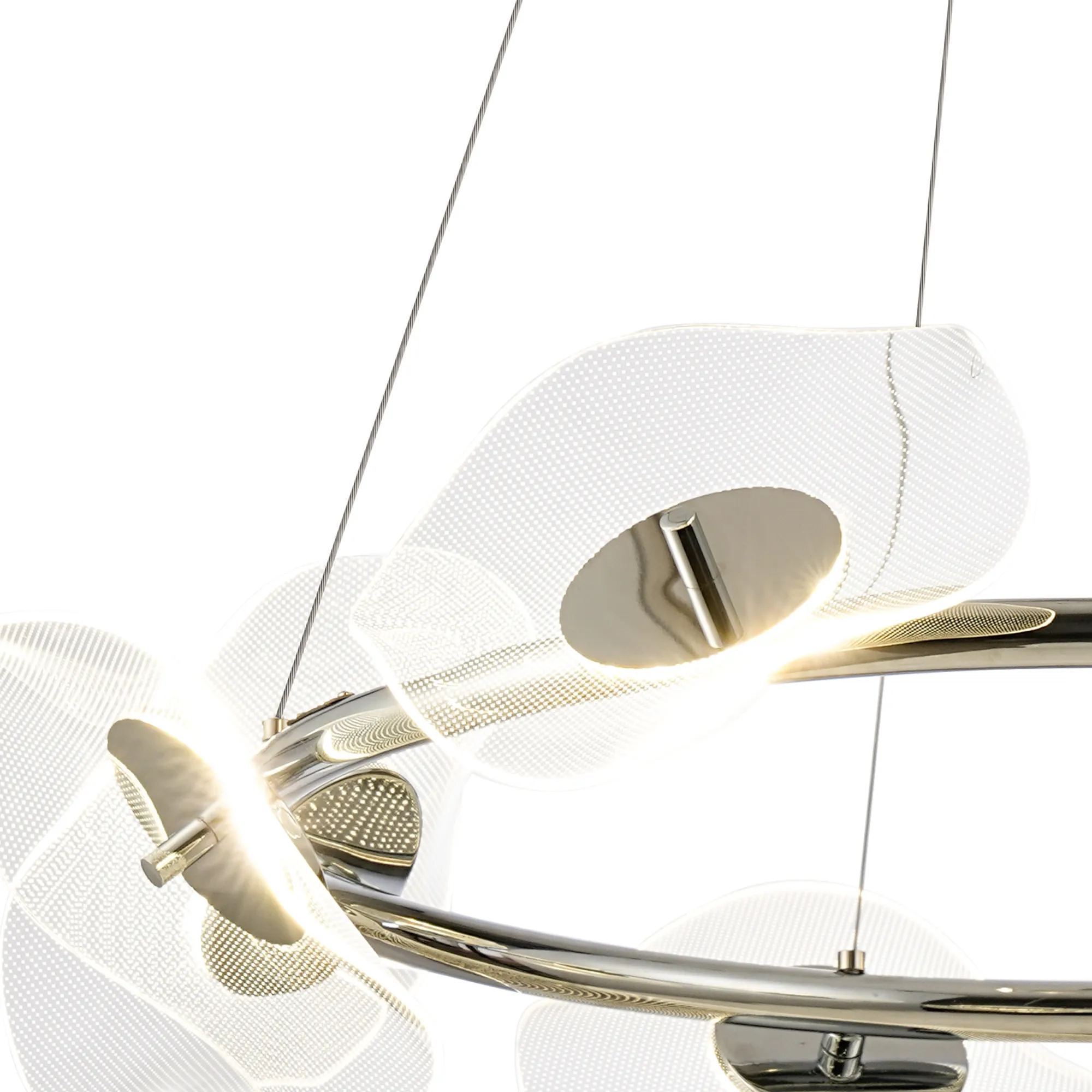 The Windsor collection offers a variation of polished chrome pendant constructs which play host to the key feature of the design. The unique waves of the acrylic disks produce an interesting dispersal of light from the 4000K integral LEDs. The minute dot pattern found on each disk combines with the illumination, forming an imitated pixelated effect. Also available in this range are a complementing wall, table and floor lamp.
