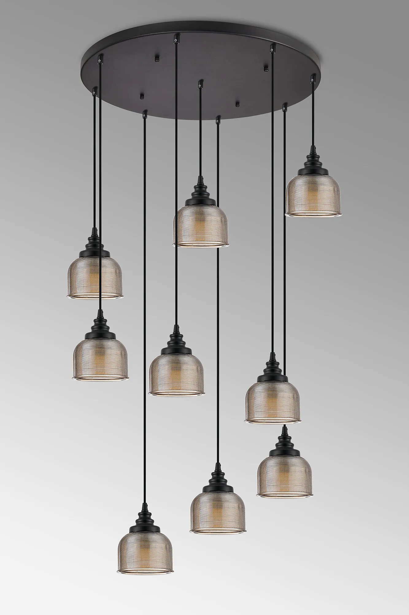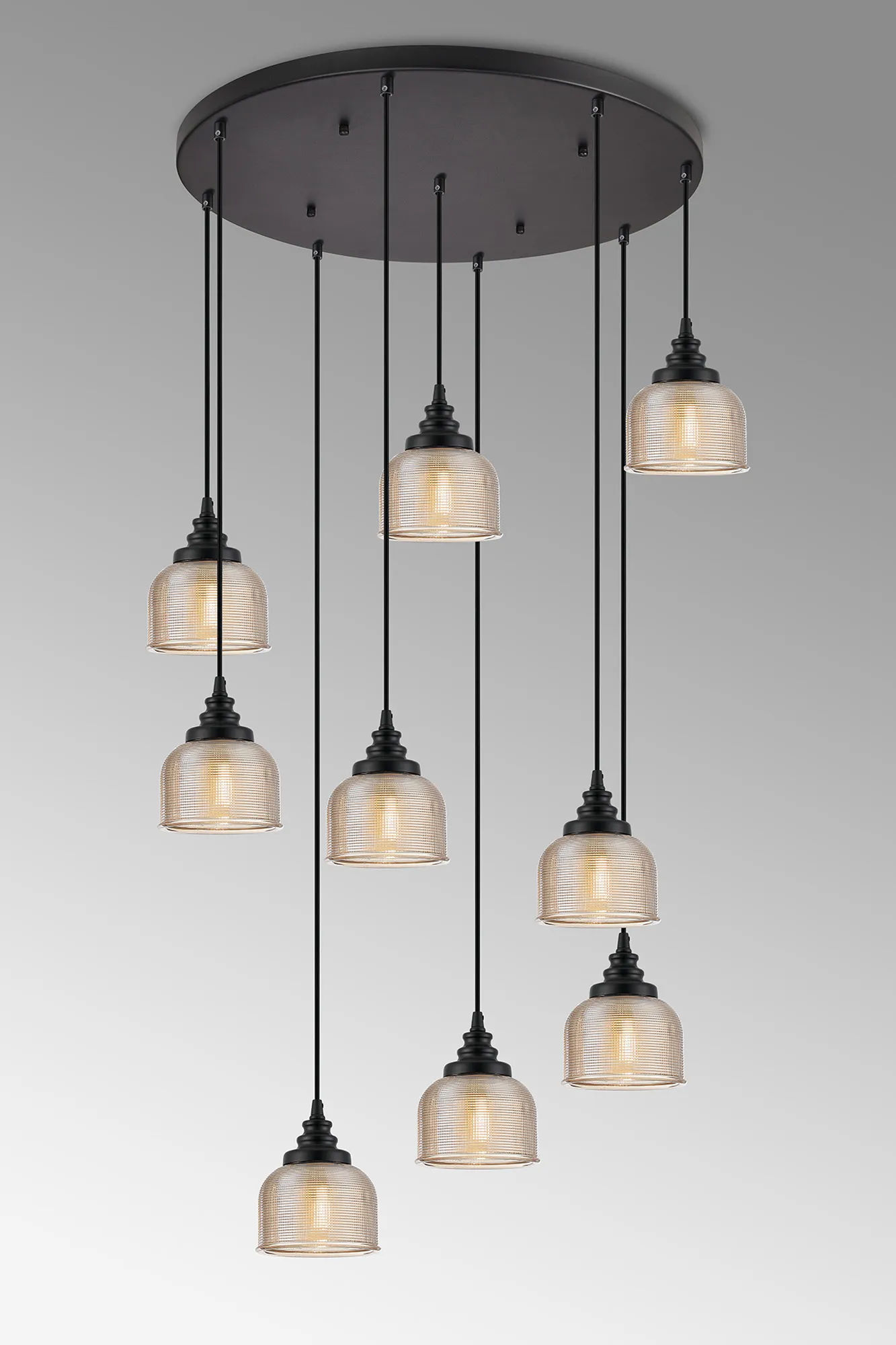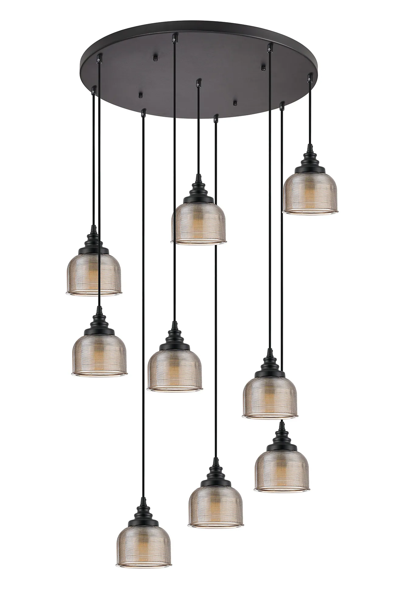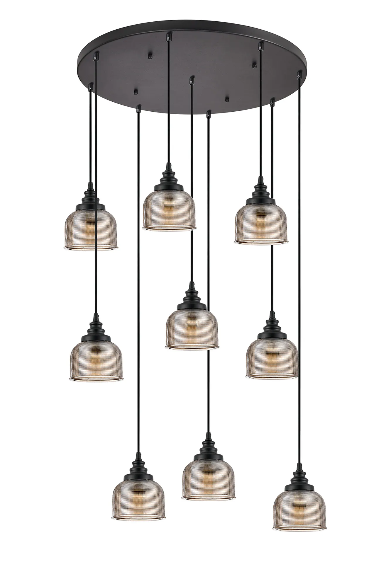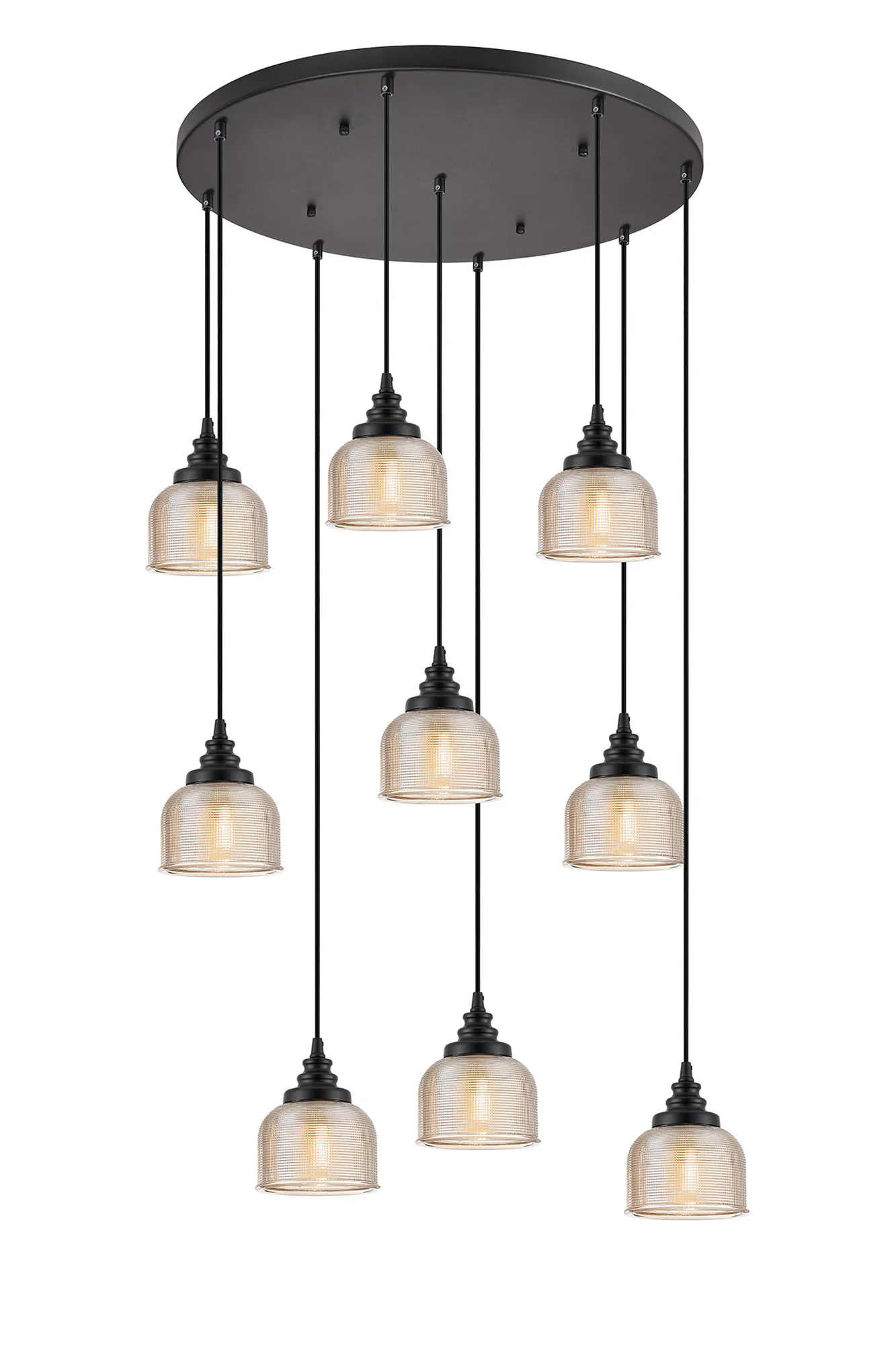 OTHER Yorkton 9 Light Round Pendant, E27, Satin Black/Prismatic Dome Glass, Amber