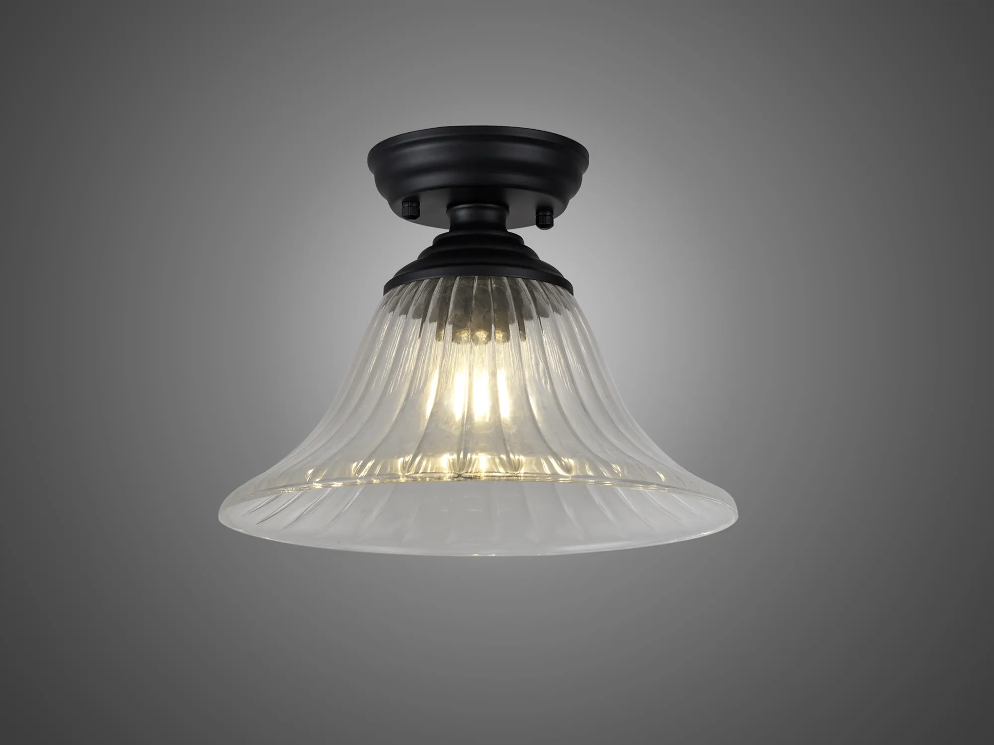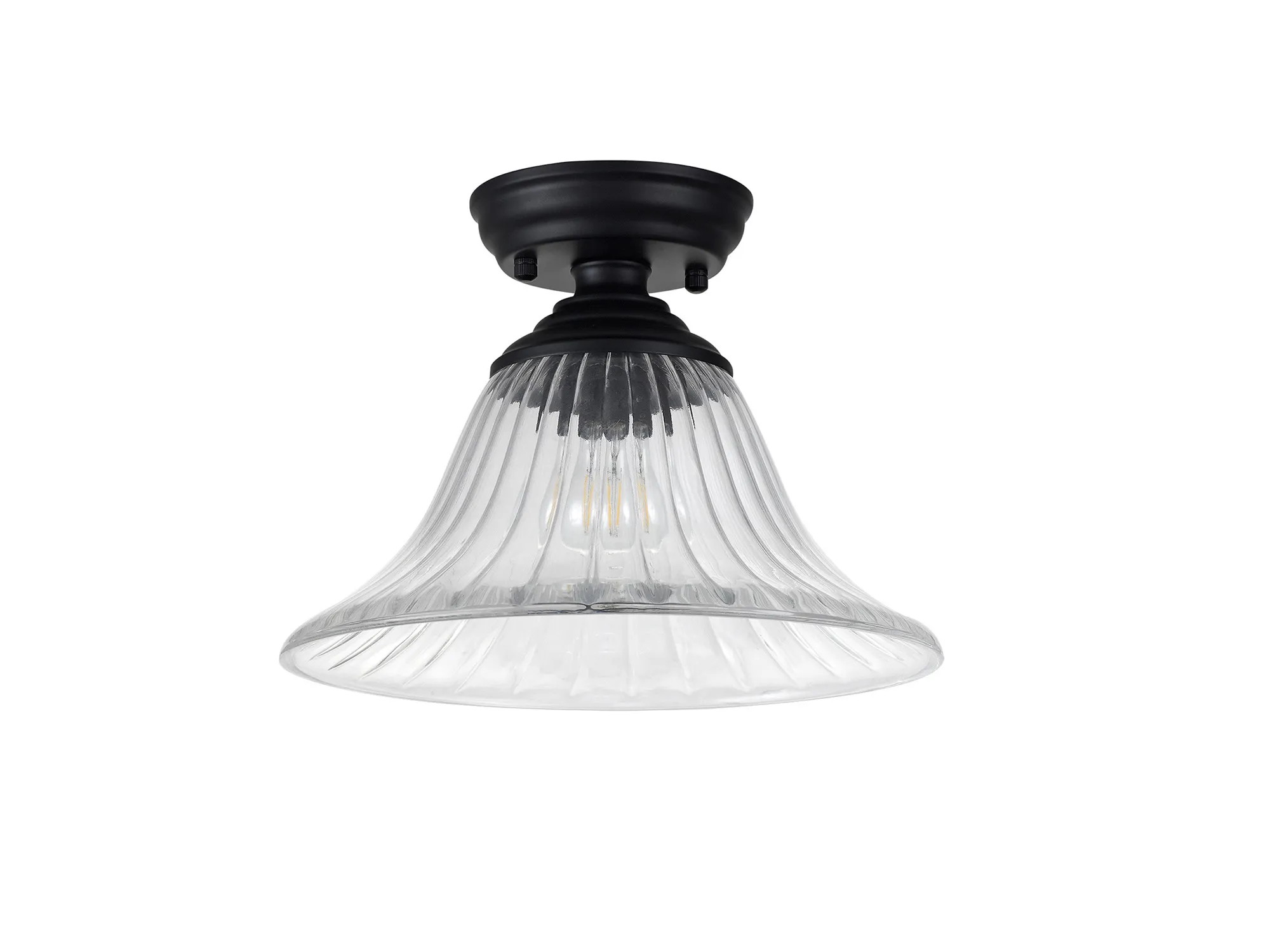Quebec 2 Light Semi Flush Ceiling E27 With Round 33.5cm Prismatic Effect Glass Shade Matt Black/Clear