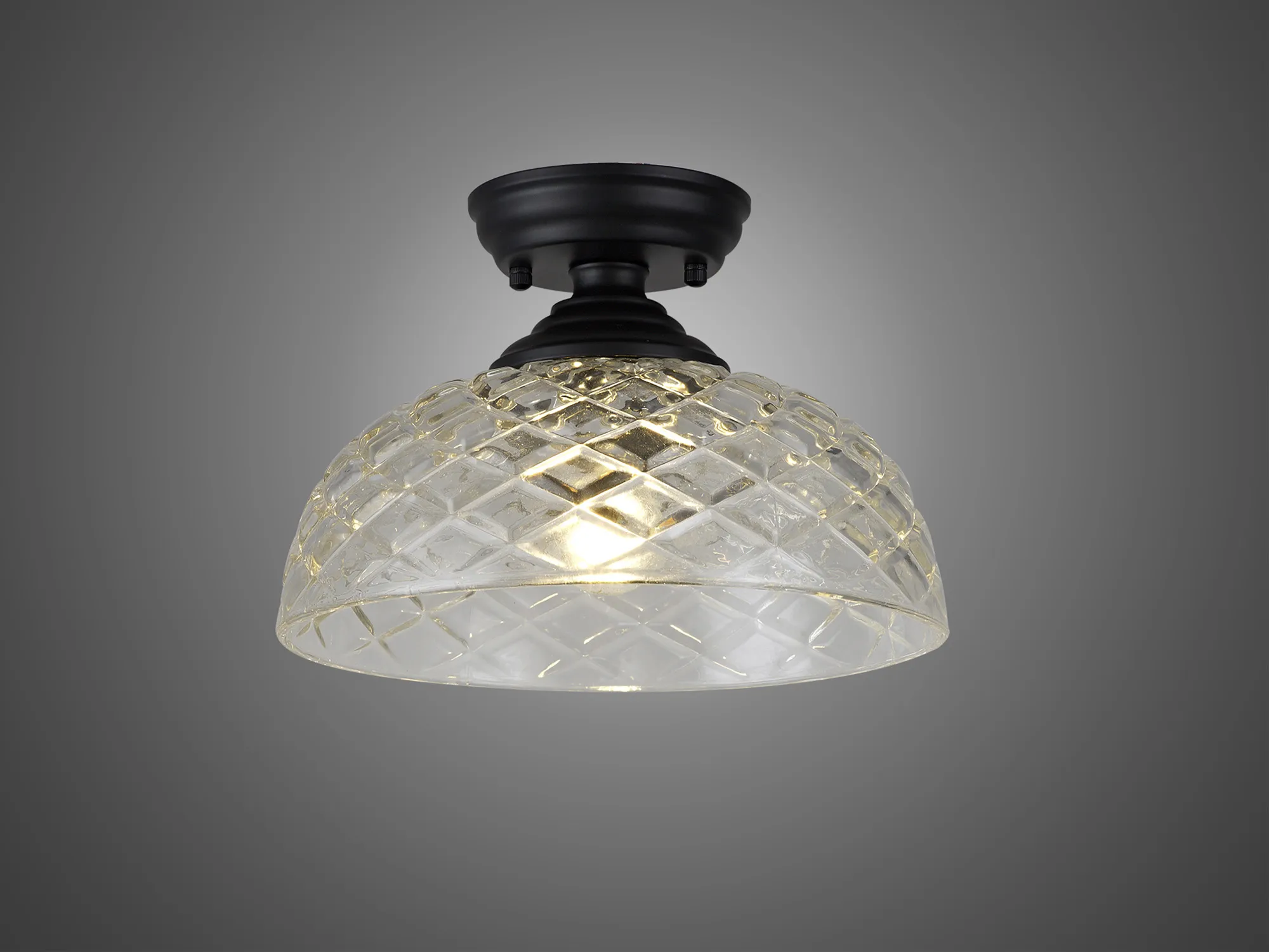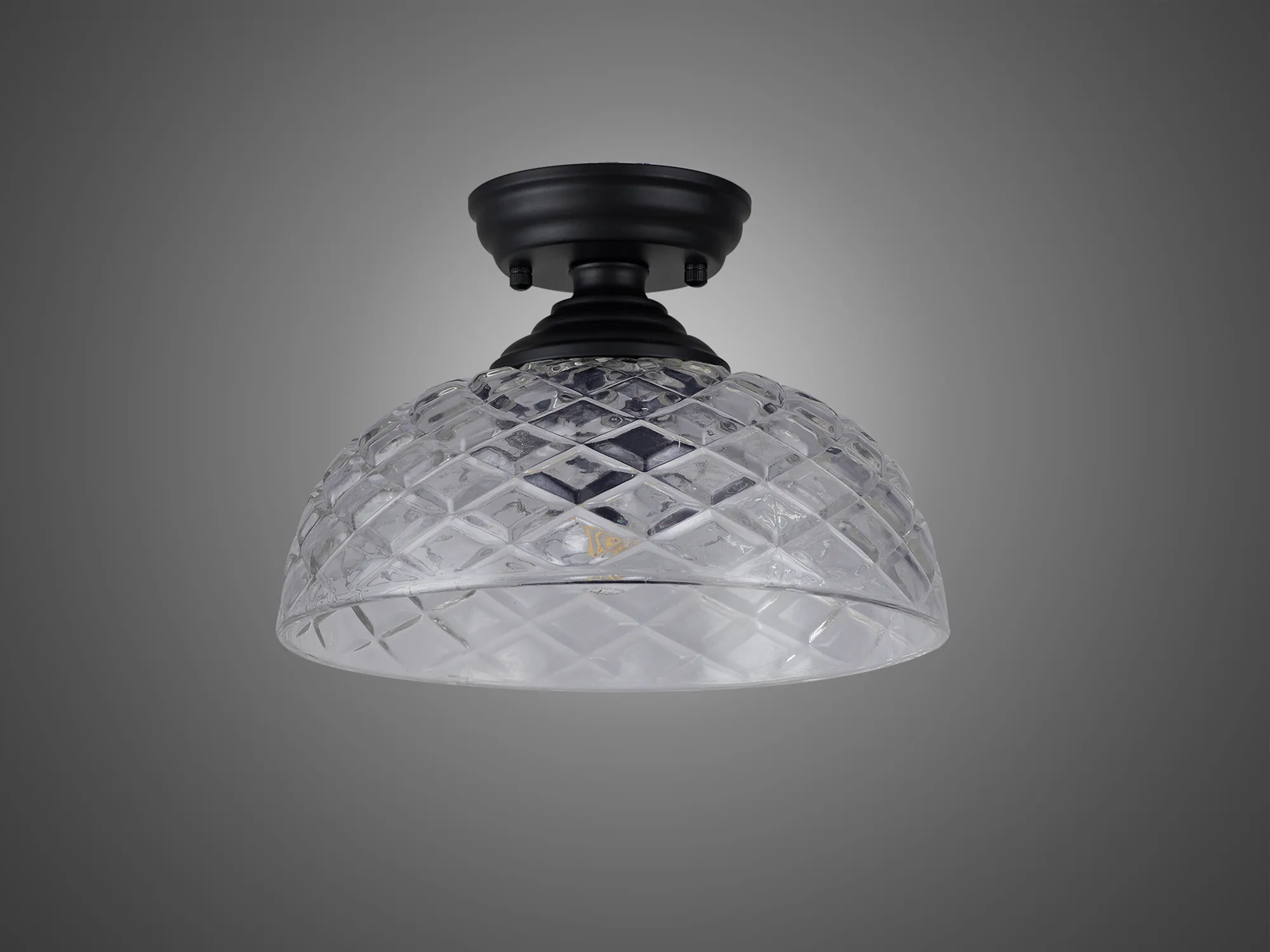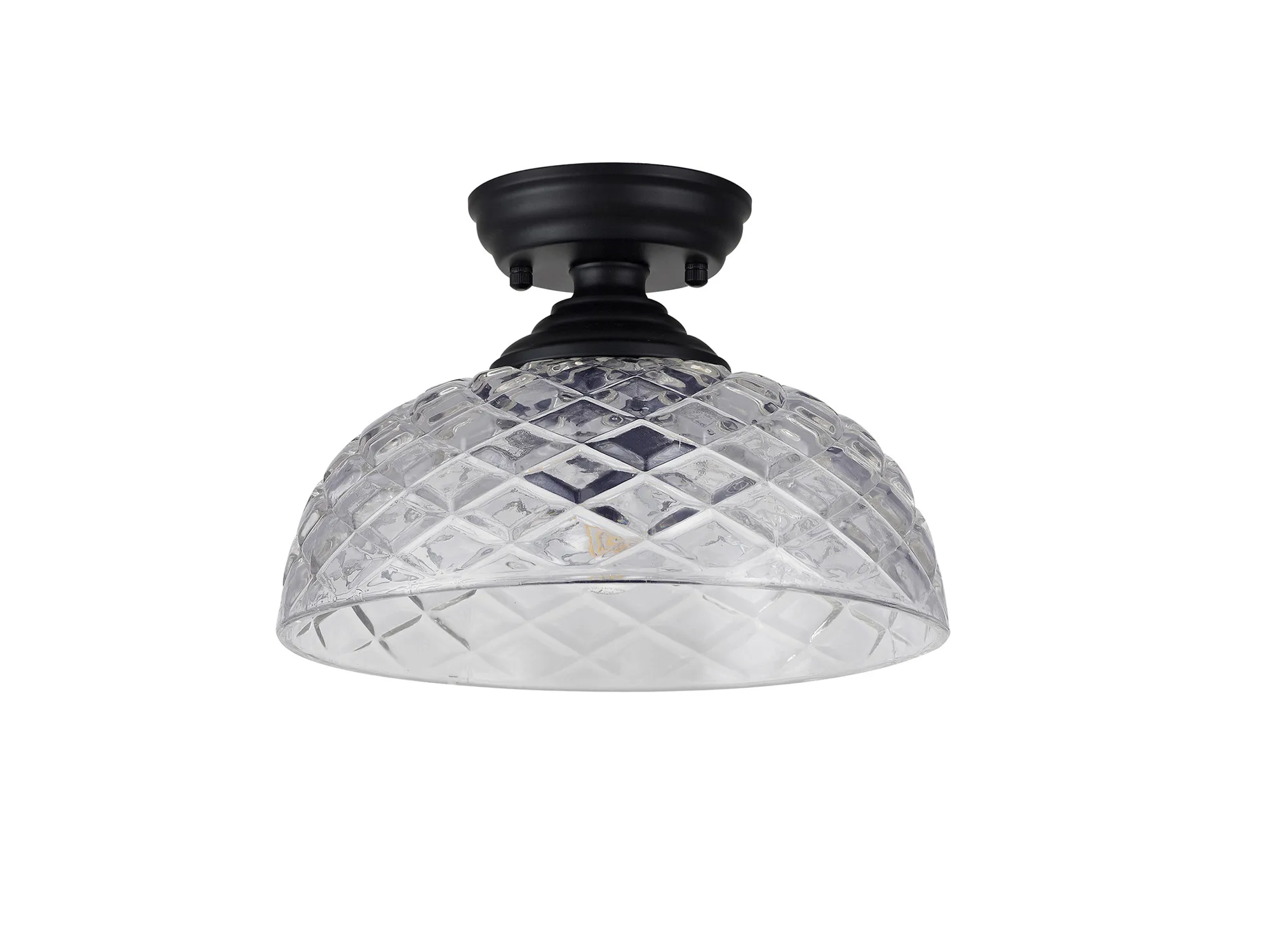 Quebec 2 Light Semi Flush Ceiling E27 With Round 33.5cm Prismatic Effect Glass Shade Matt Black/Clear