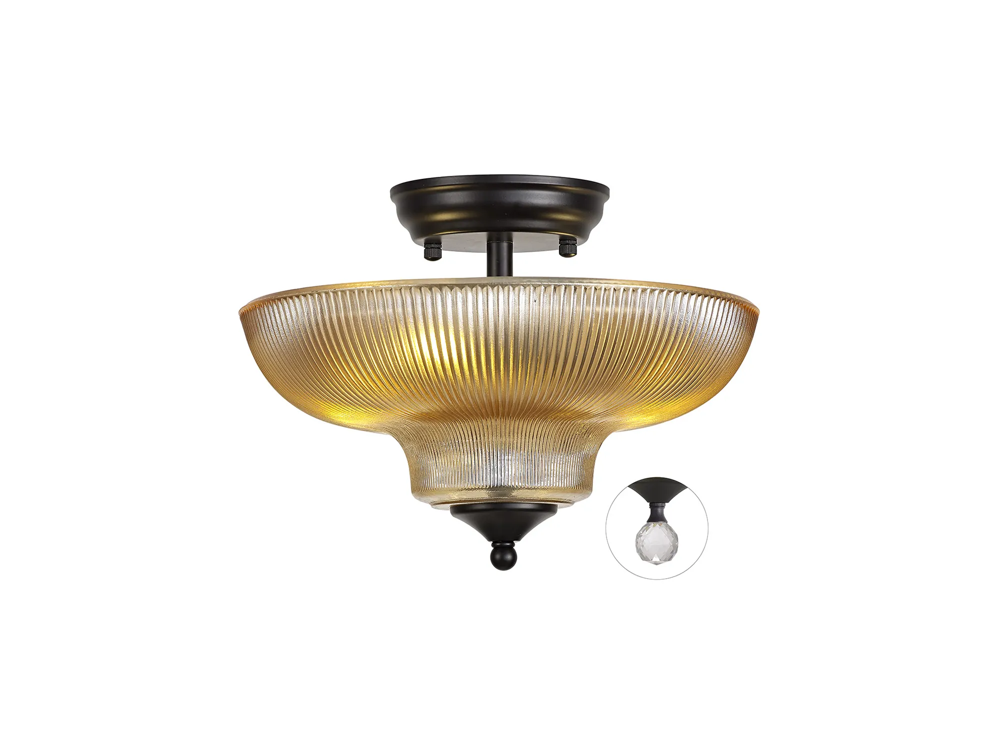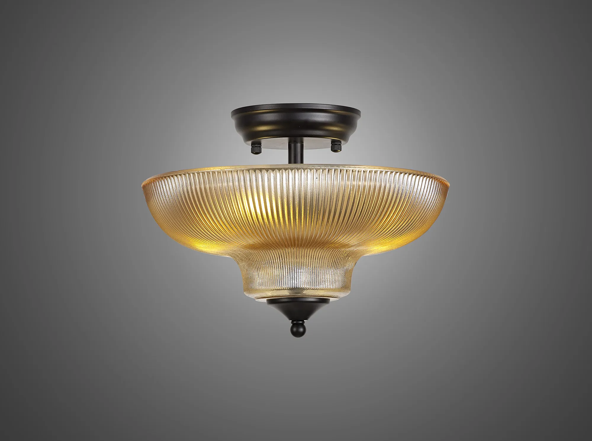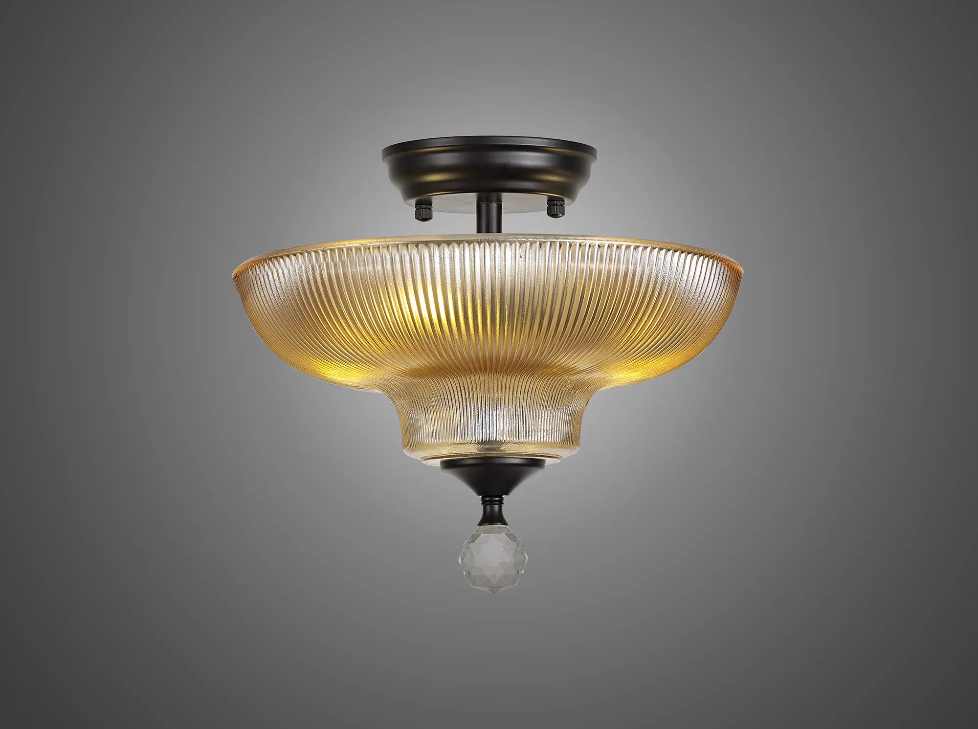 OTHER Quebec 2 Light Semi Flush Ceiling E27 With Round 30cm Glass Shade Matt Black/Amber