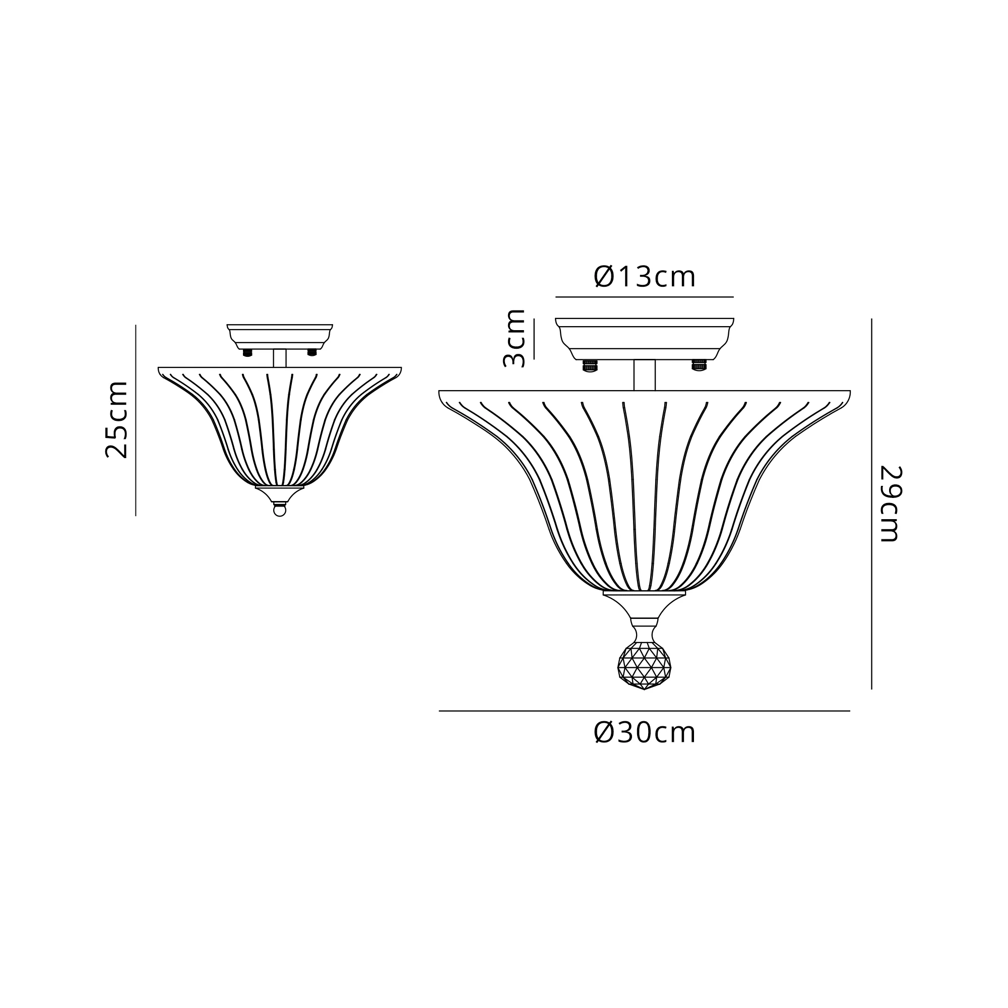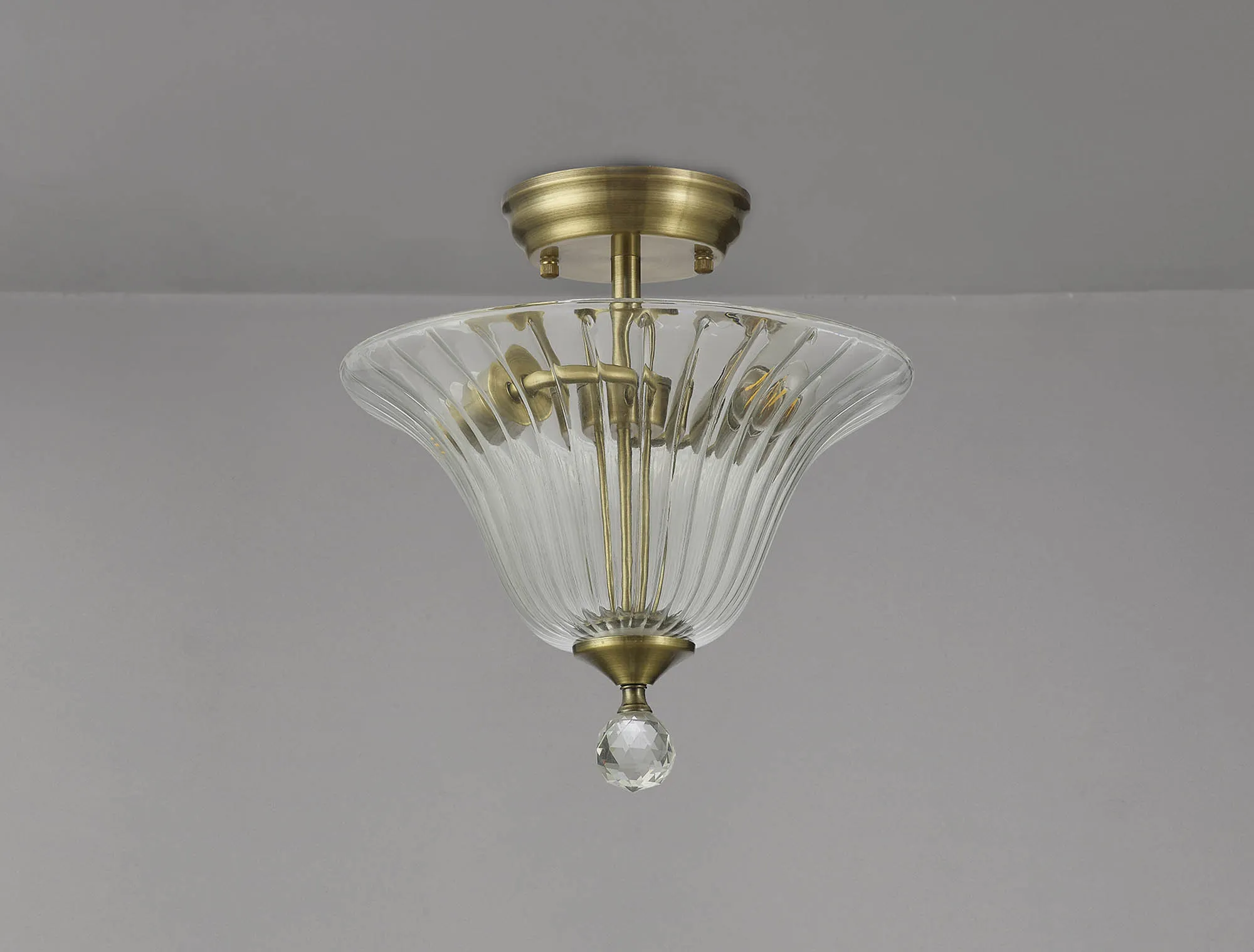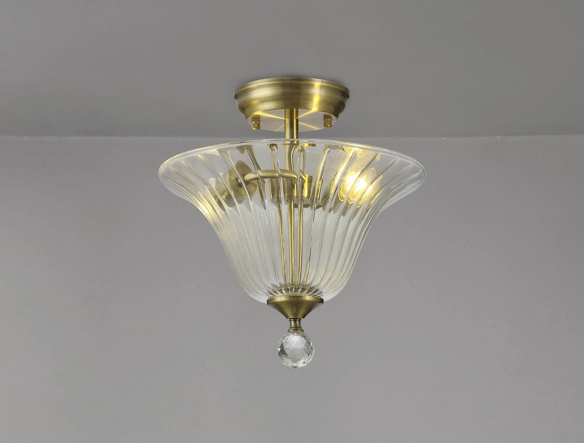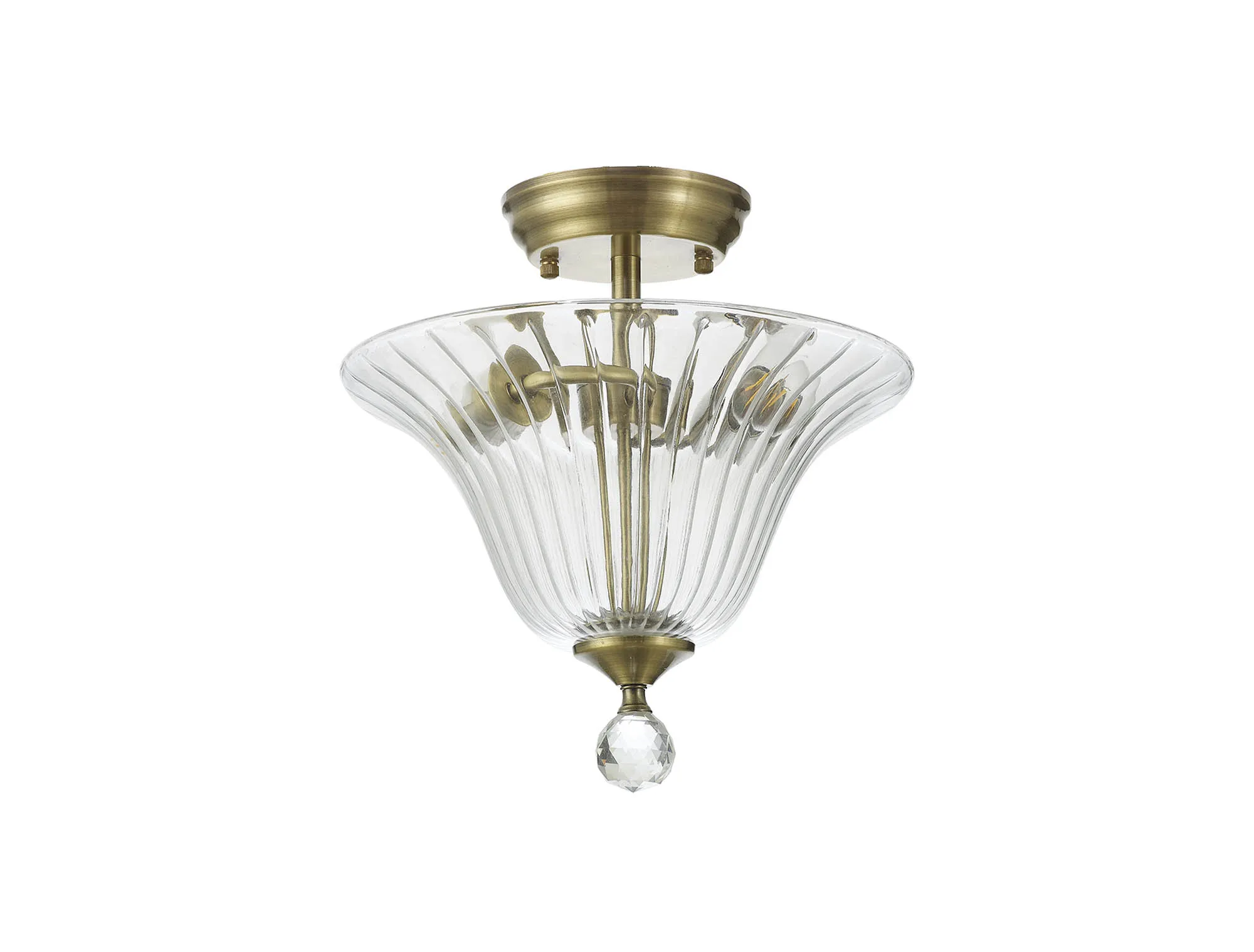 Quebec 2 Light Semi Flush Ceiling E27 With Round 33.5cm Prismatic Effect Glass Shade Antique Brass/Clear