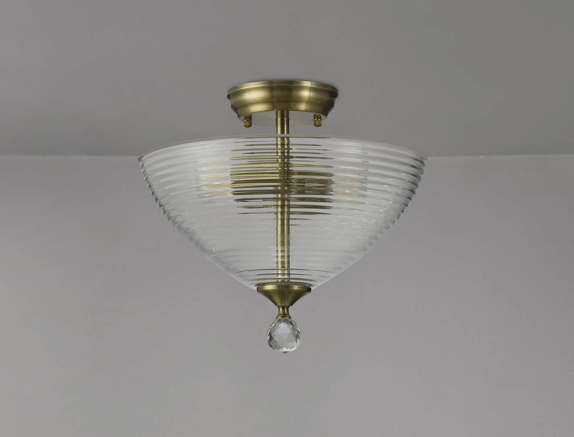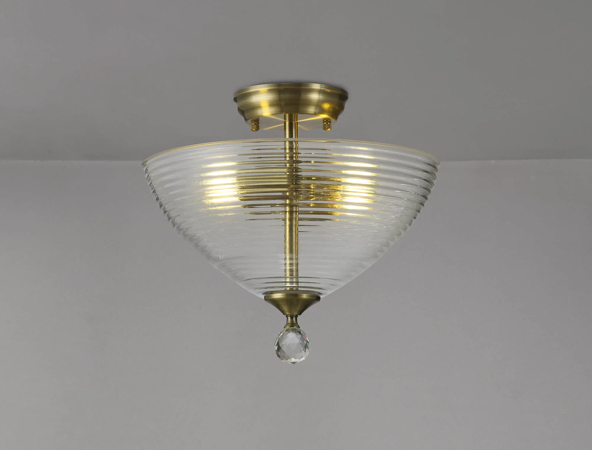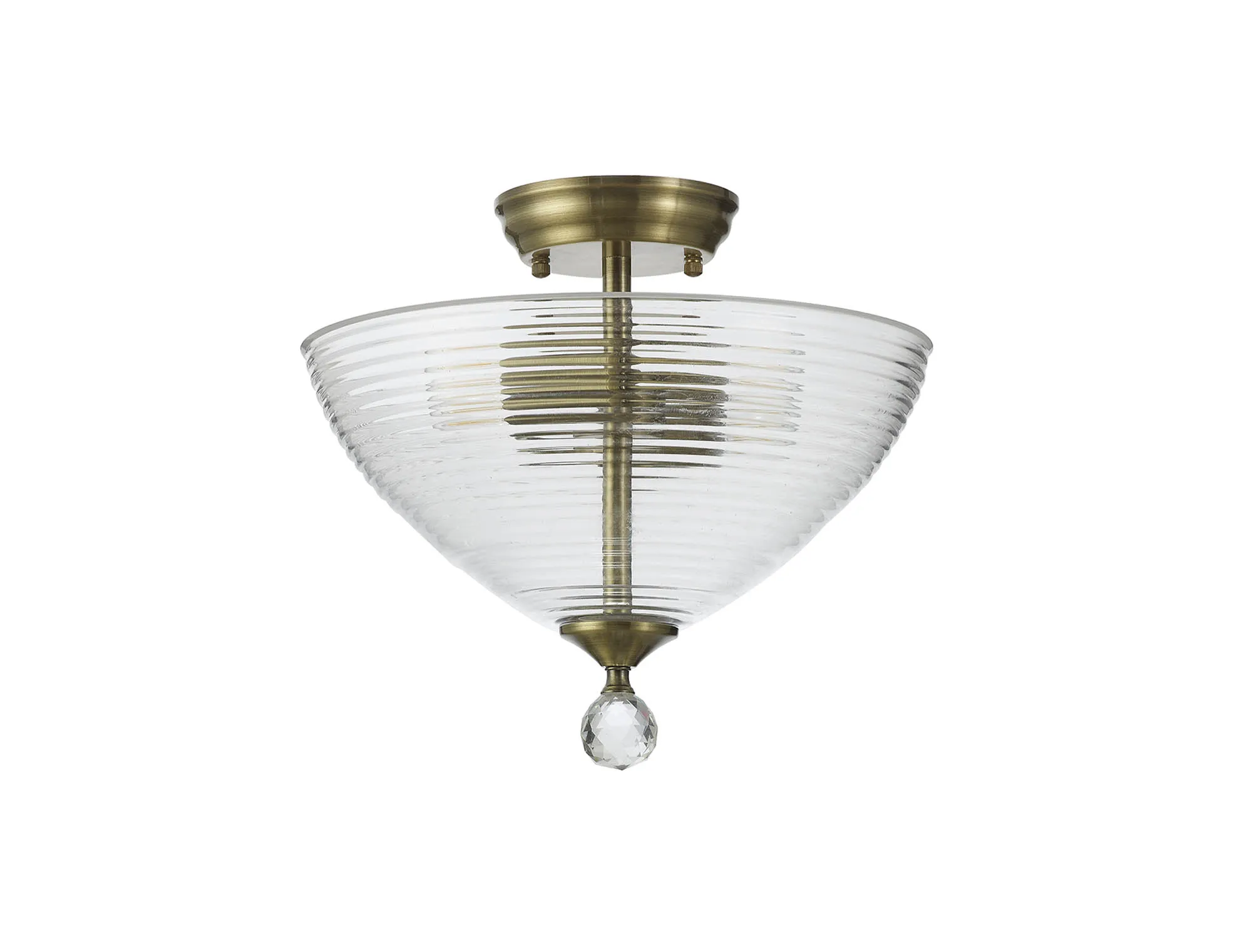 Quebec 2 Light Semi Flush Ceiling E27 With Round 26.5cm Prismatic Effect Glass Shade Antique Brass/Clear