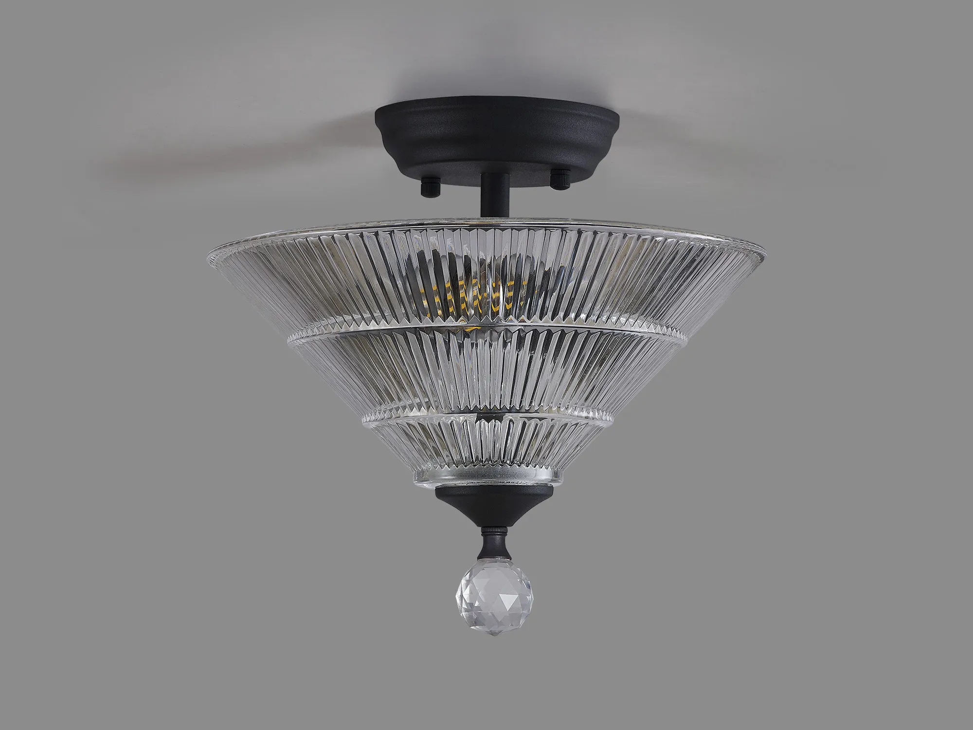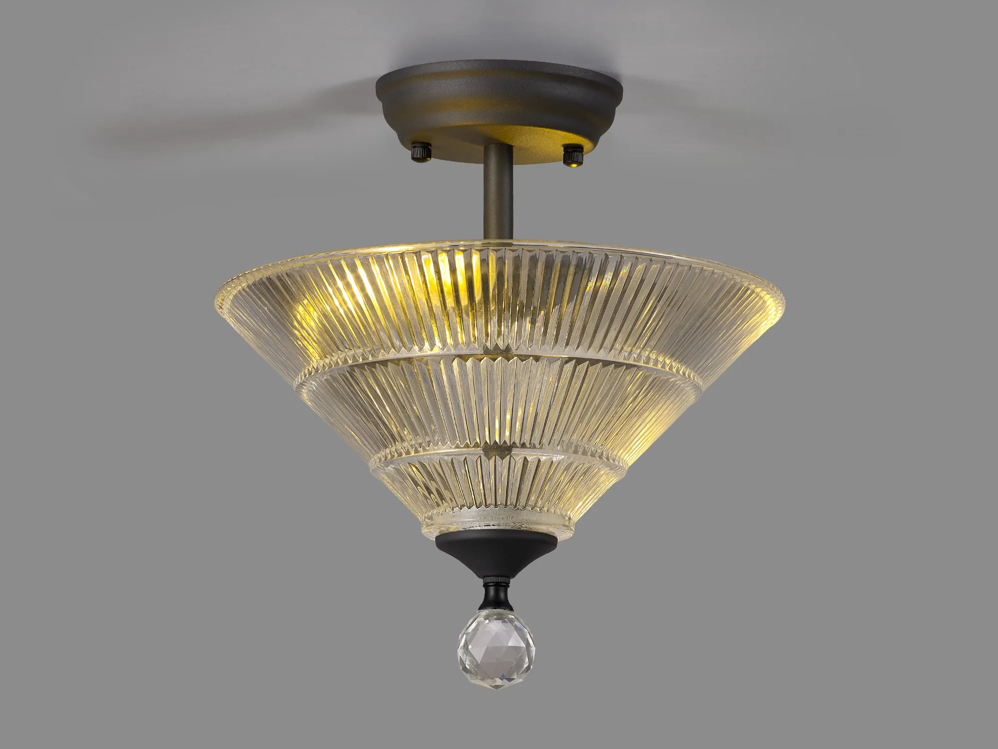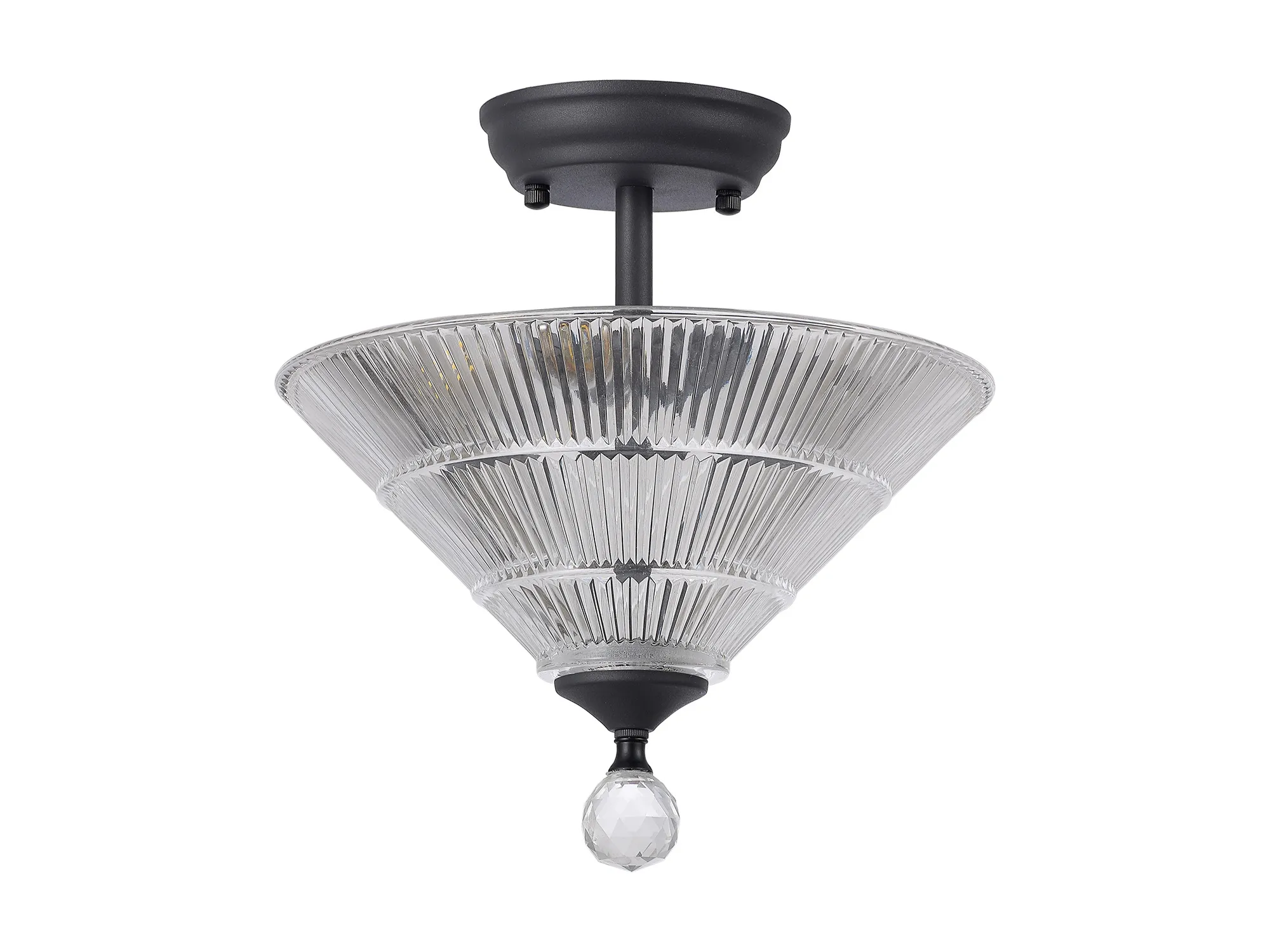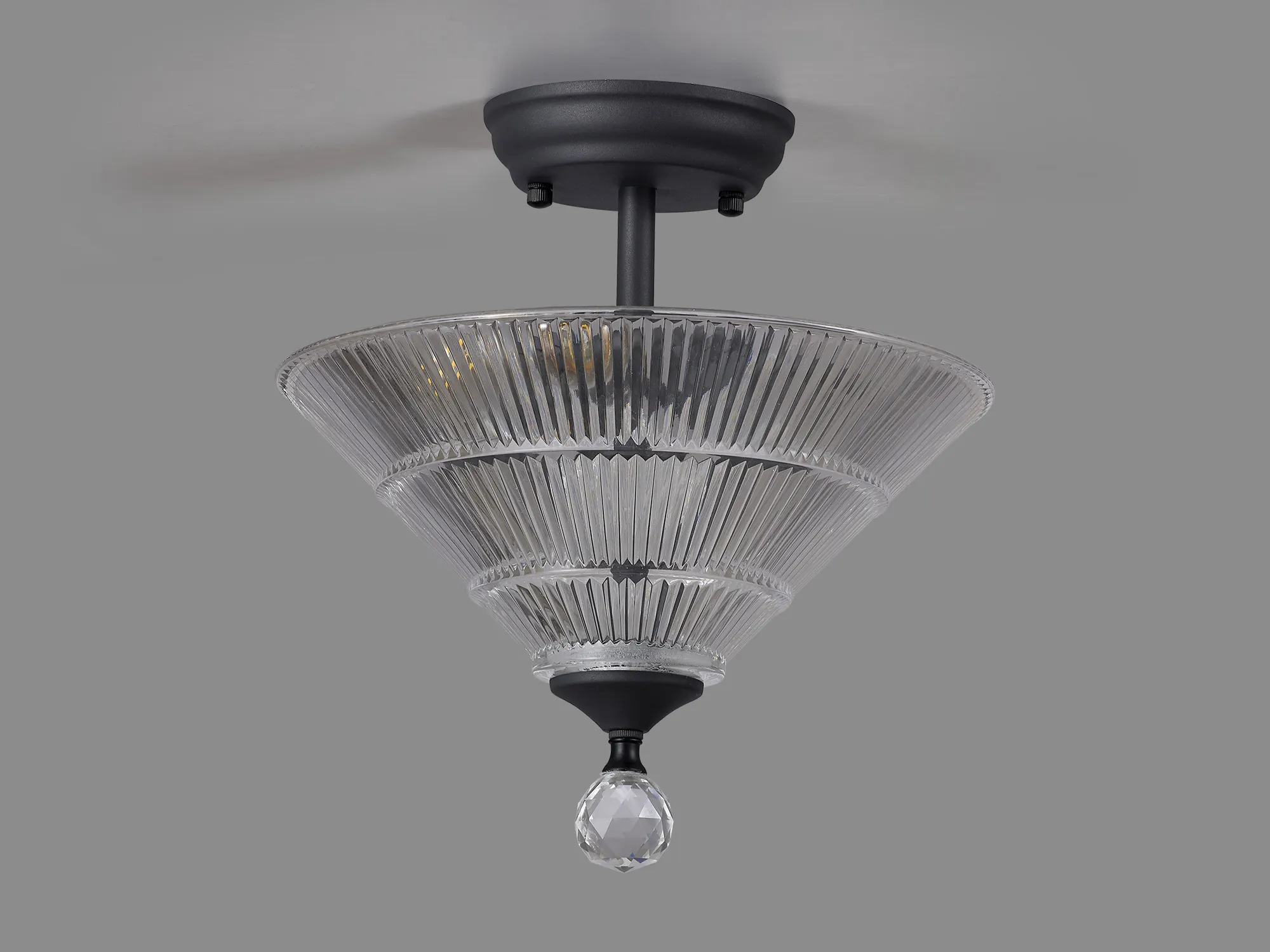 Quebec 2 Light Semi Flush Ceiling E27 With Round 26.5cm Prismatic Effect Glass Shade Graphite/Clear