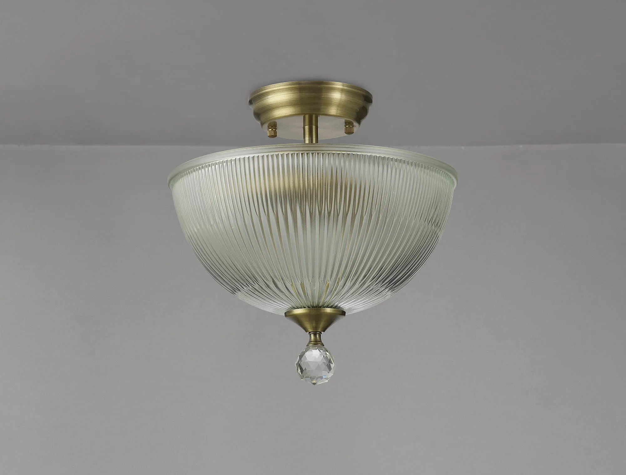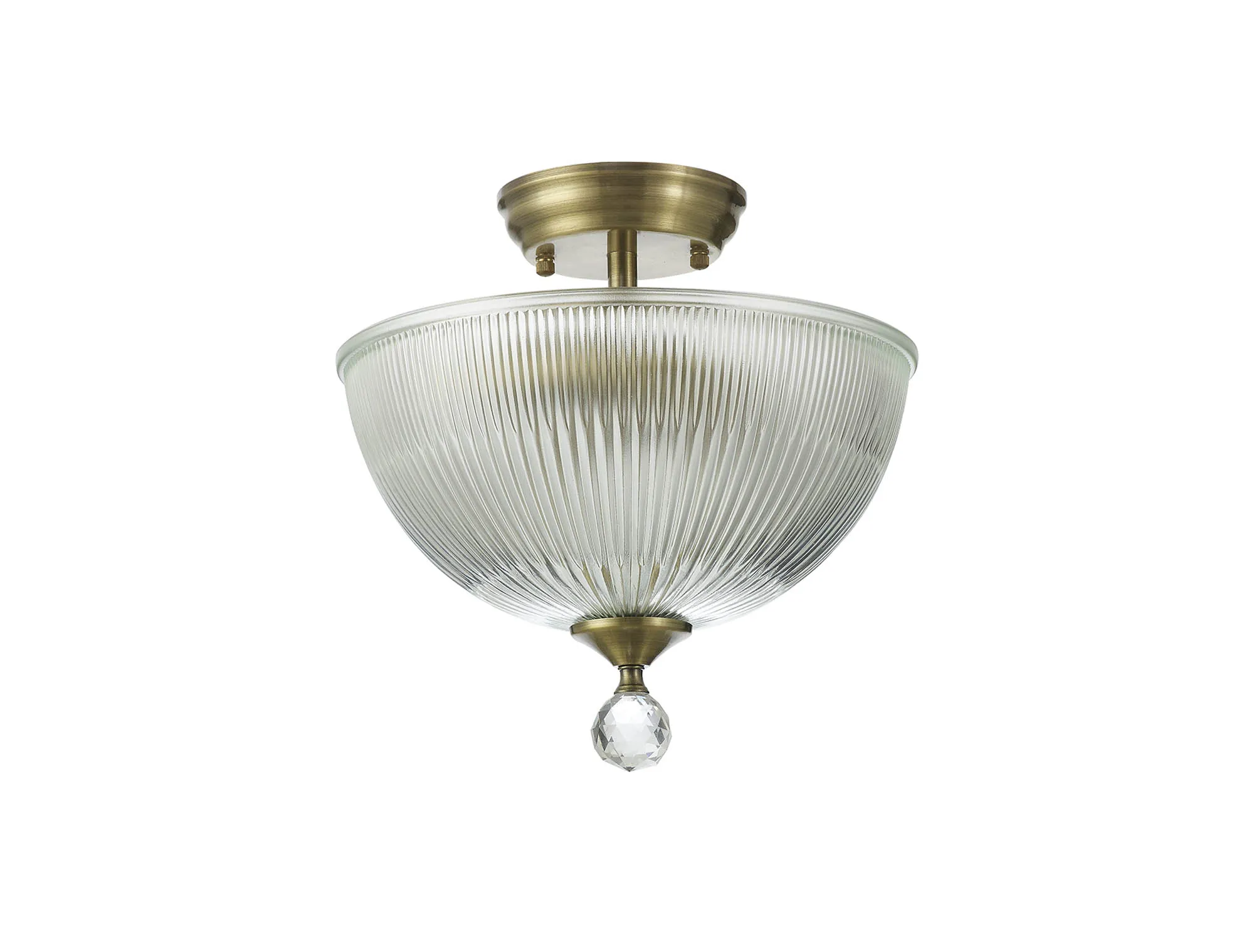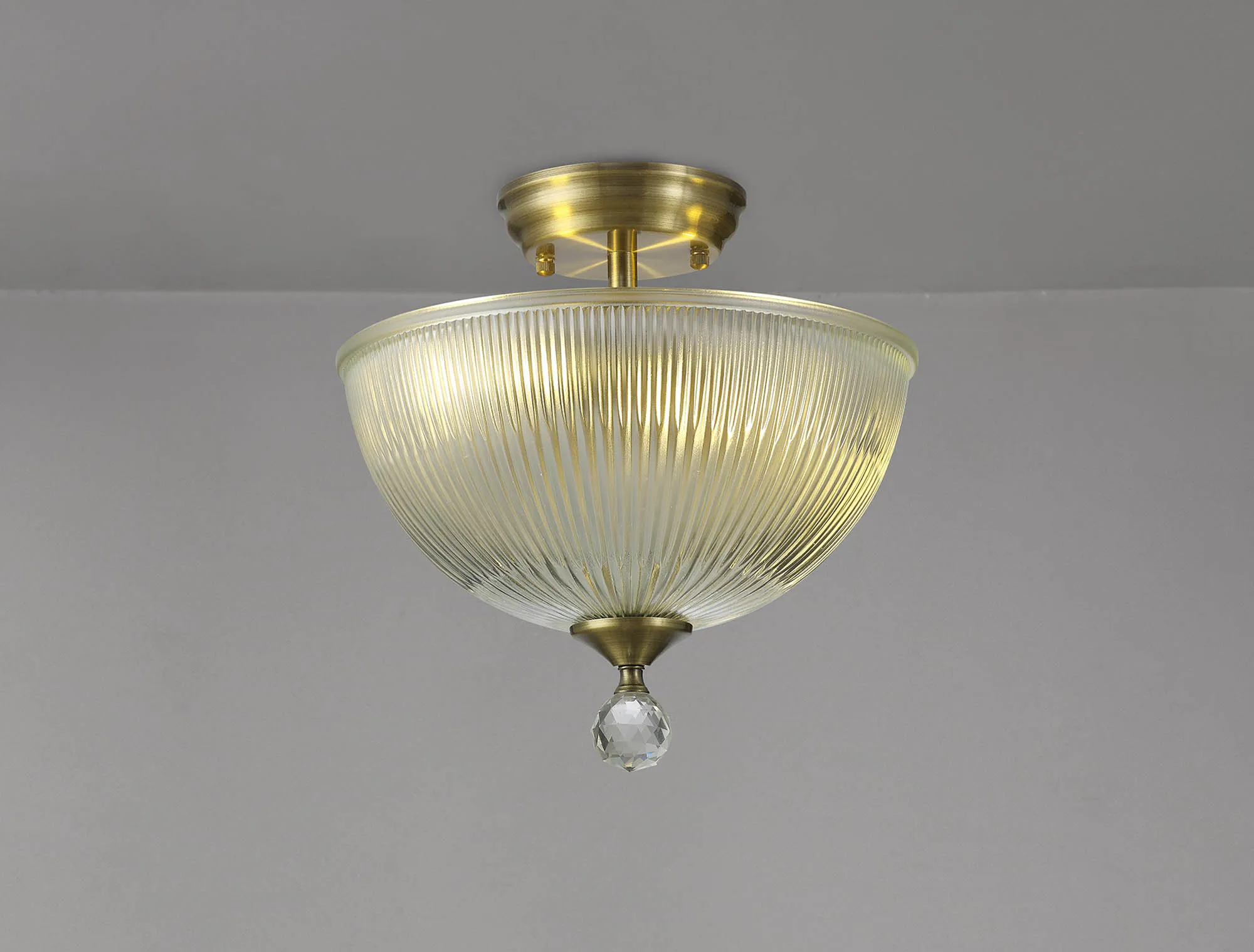 Quebec 2 Light Semi Flush Ceiling E27 With Round 33.5cm Prismatic Effect Glass Shade Antique Brass/Clear