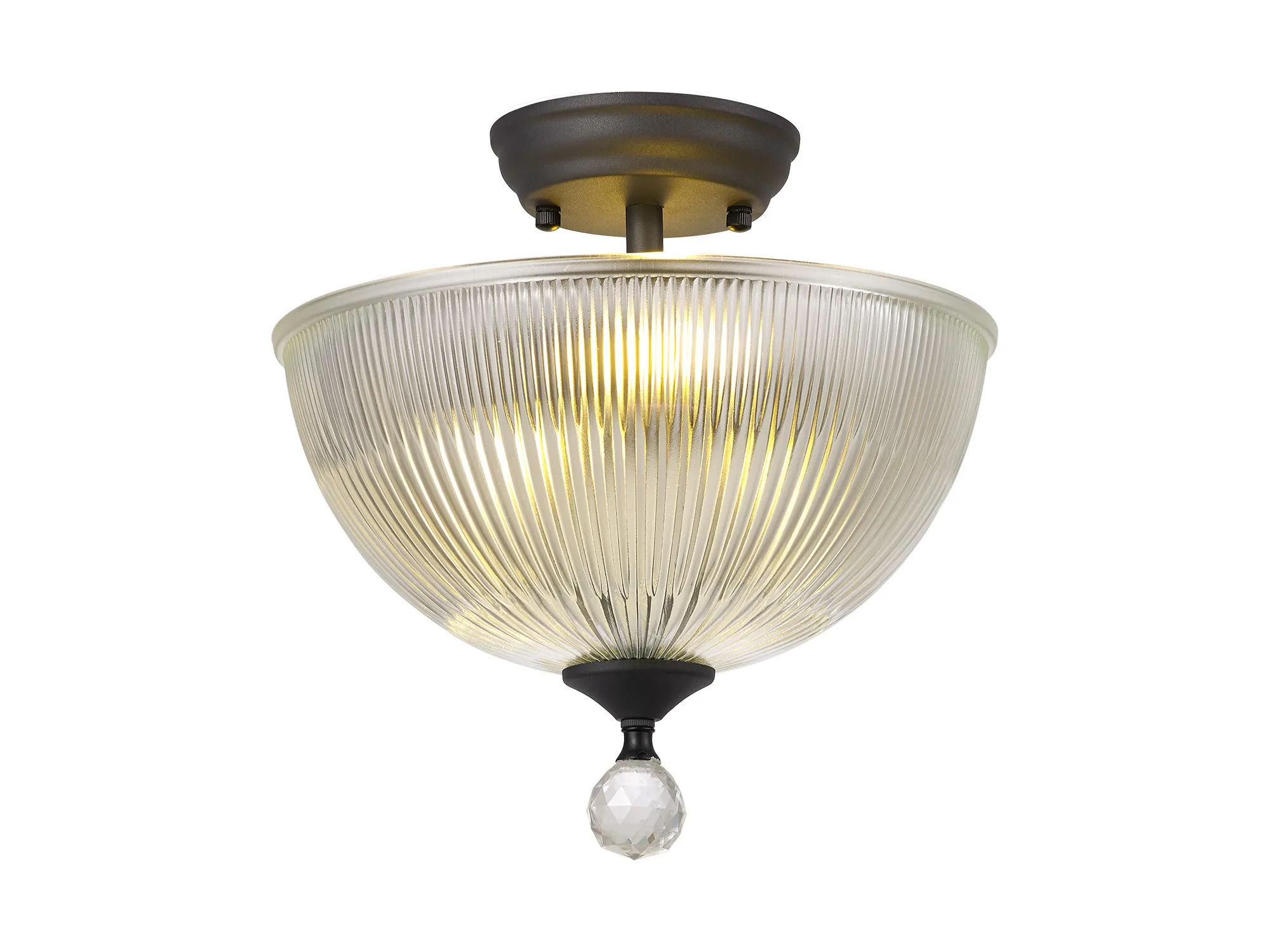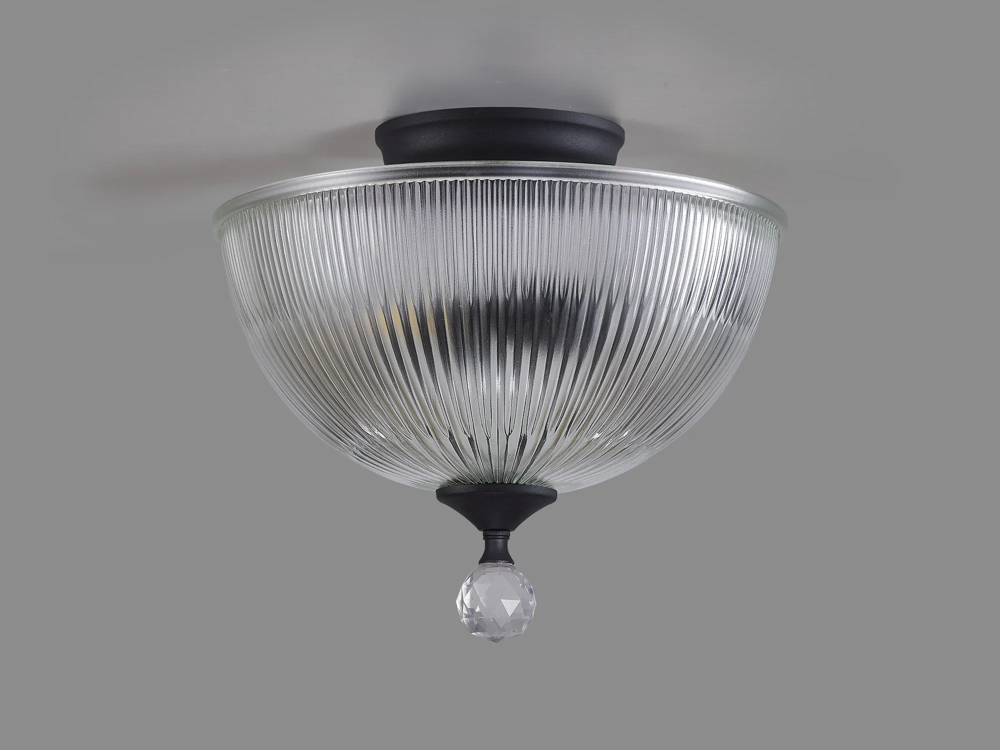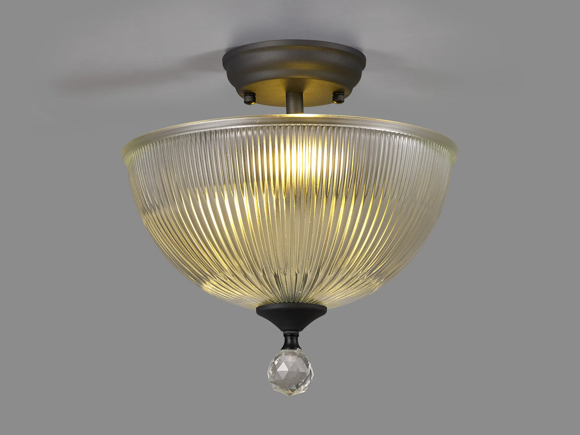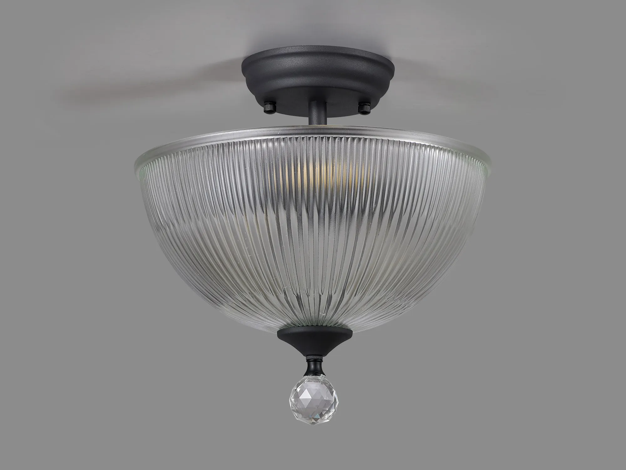 Quebec 2 Light Semi Flush Ceiling E27 With Round 26.5cm Prismatic Effect Glass Shade Graphite/Clear