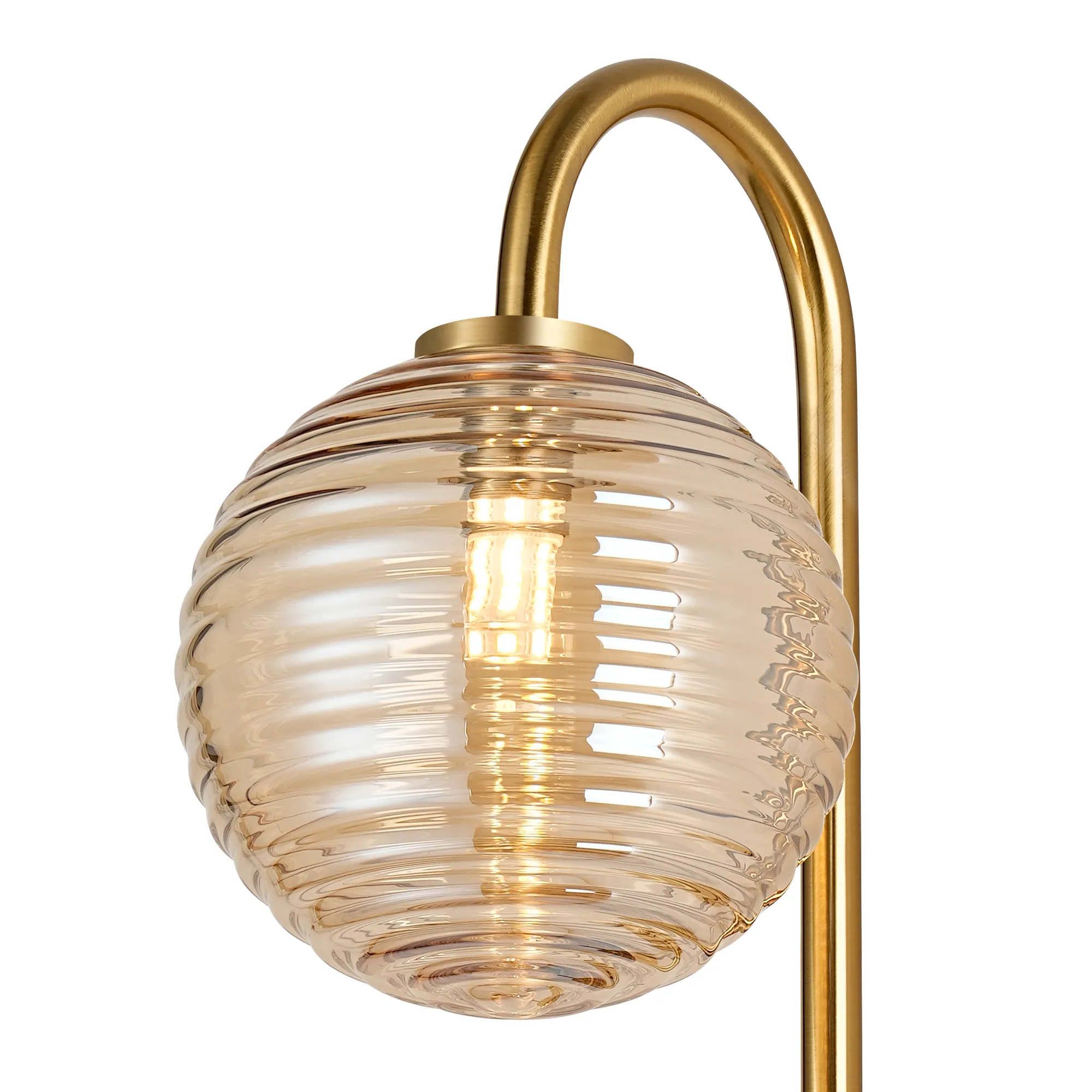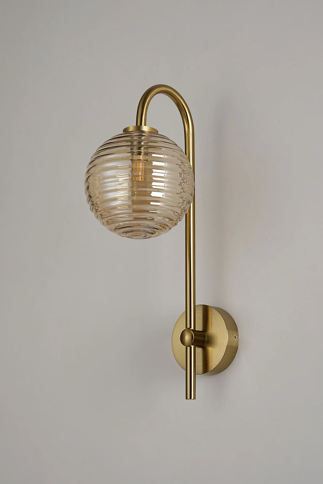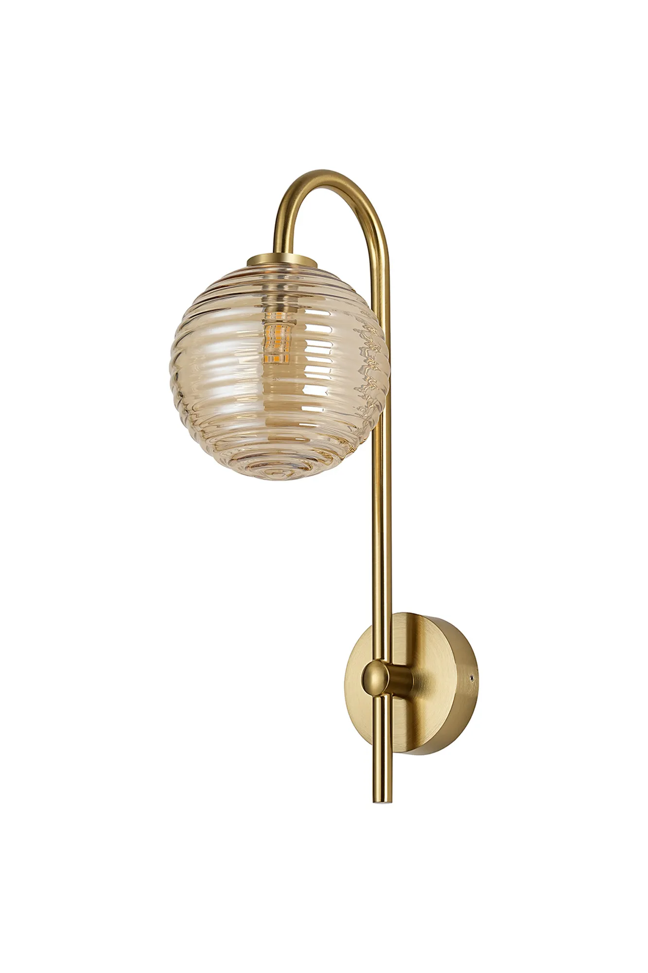 OTHER Nova Curved Arm Wall Lamp 1 Light IP44 Brass Gold/Amber Ribbed Round Glass