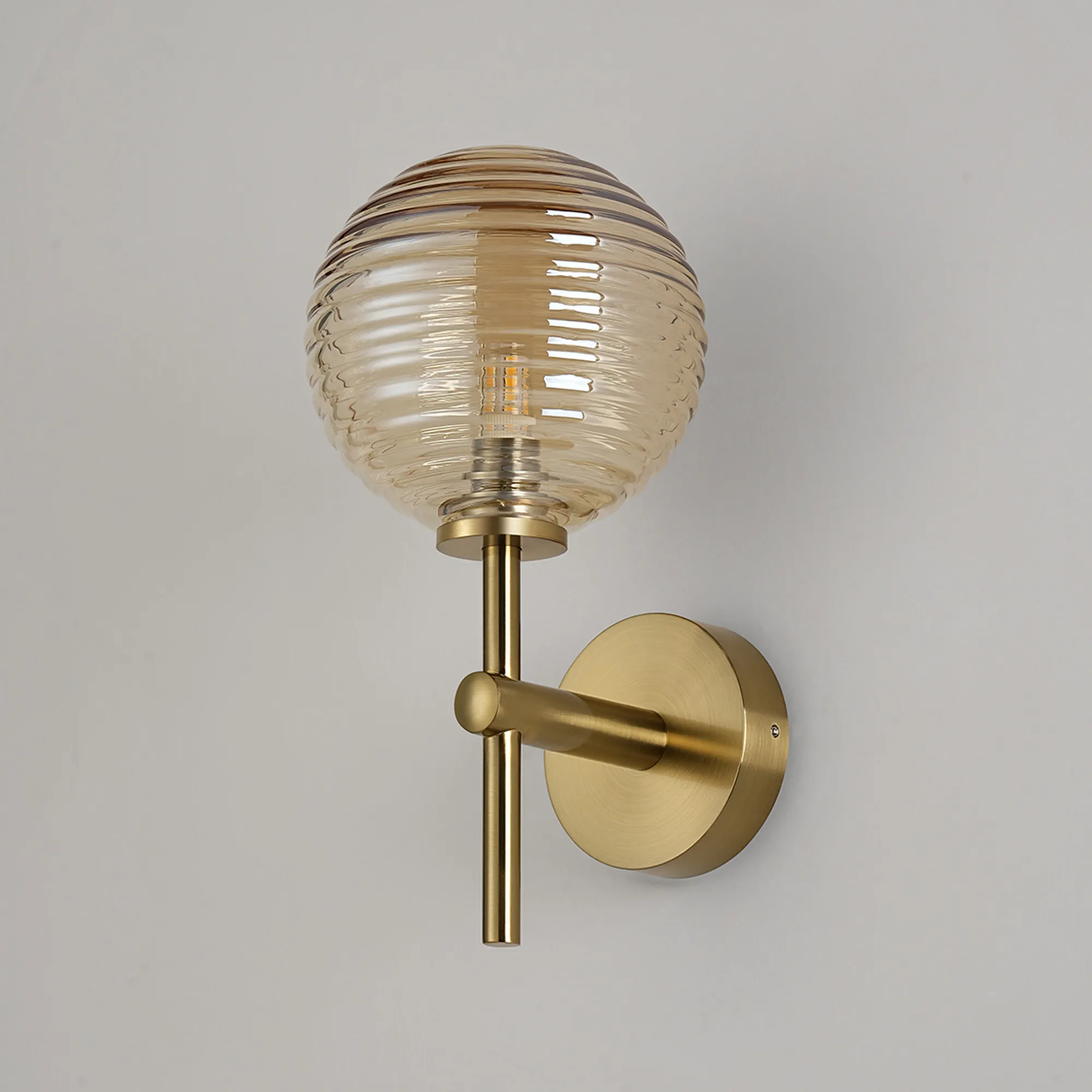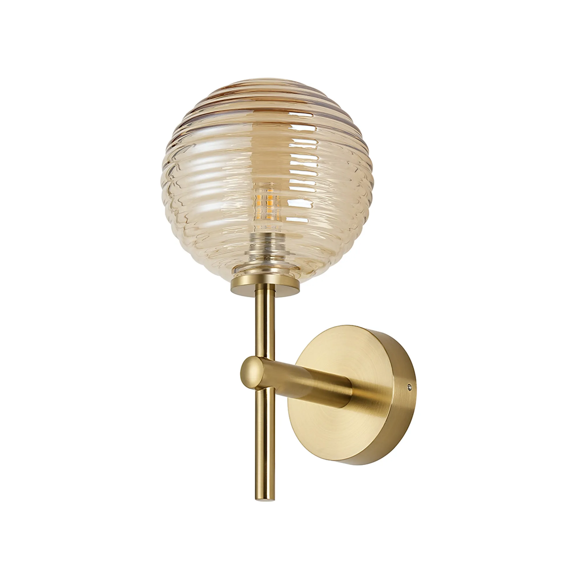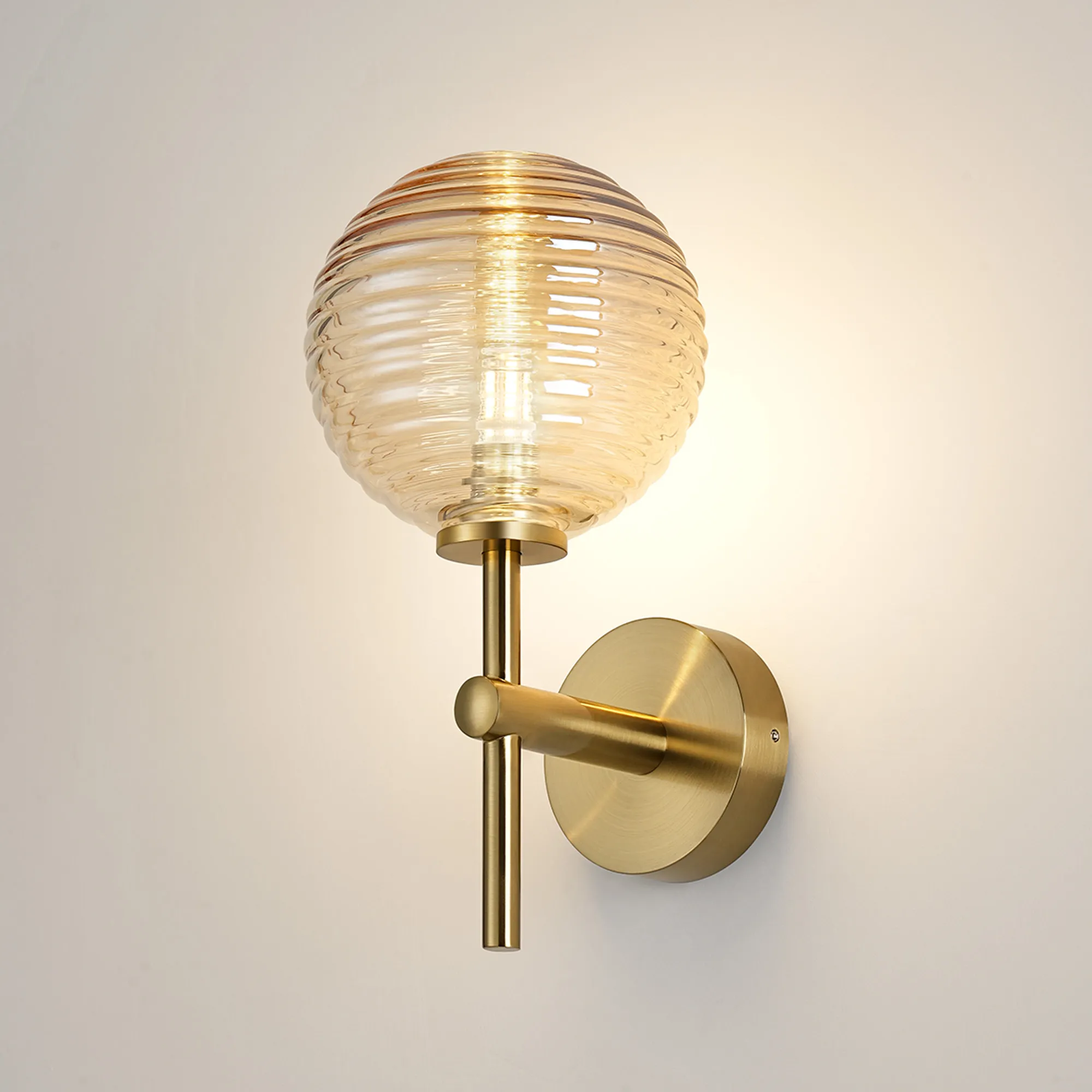 OTHER Nova Medium Arm Wall Lamp 1 Light IP44 Brass Gold/Amber Ribbed Round Glass