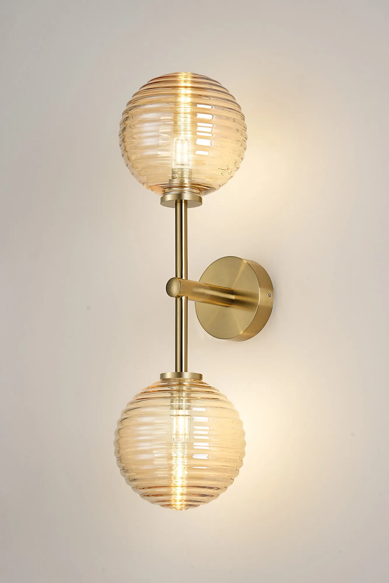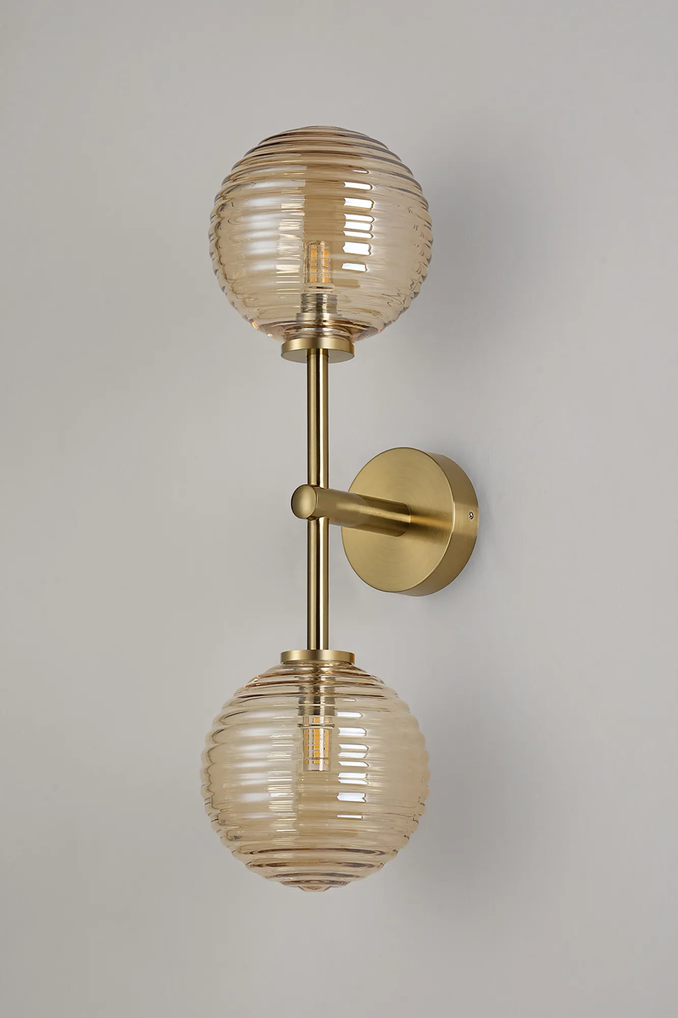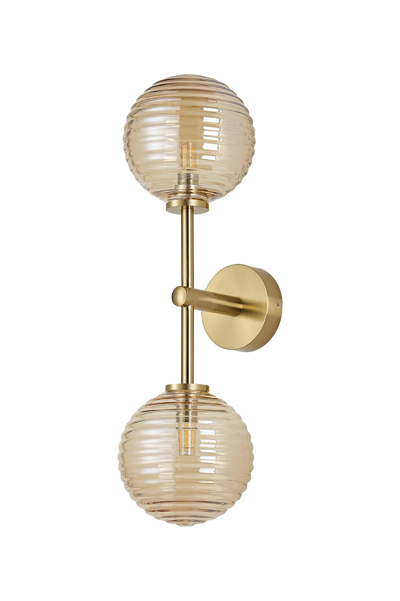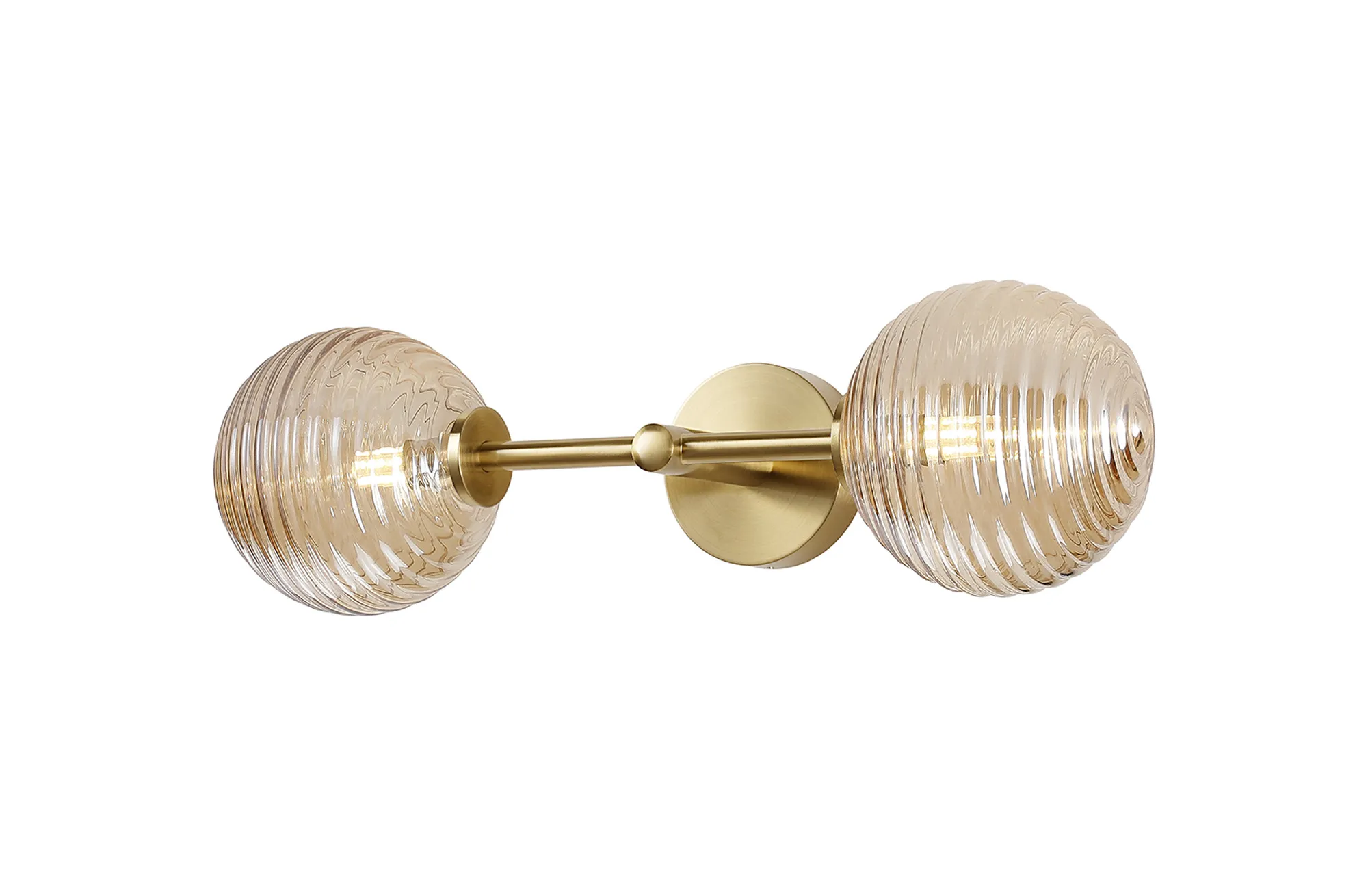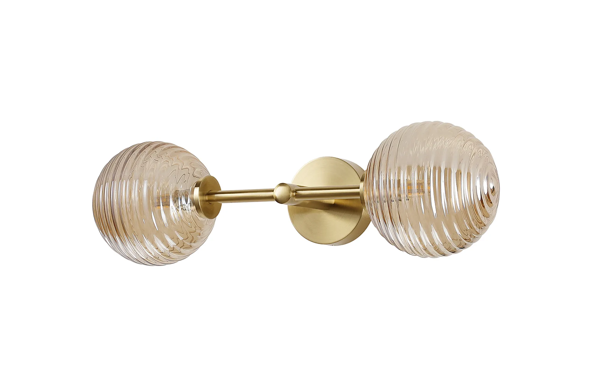 OTHER Nova Medium Arm Wall Lamp 2 Light IP44 Brass Gold/Amber Ribbed Round Glass