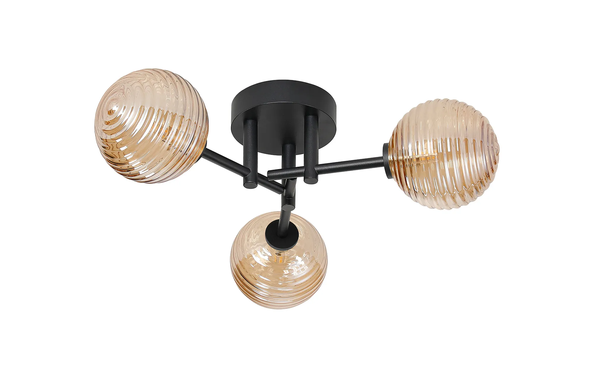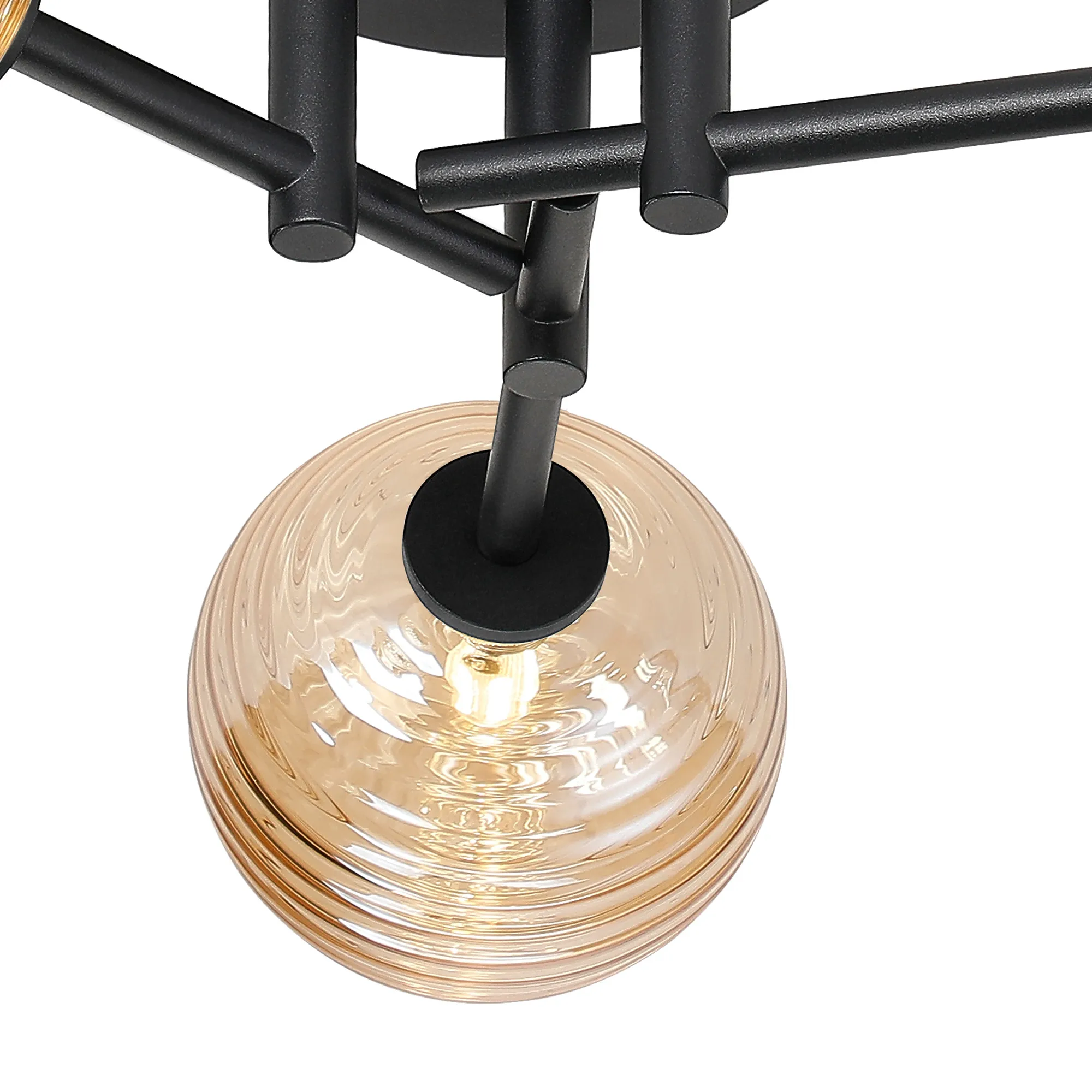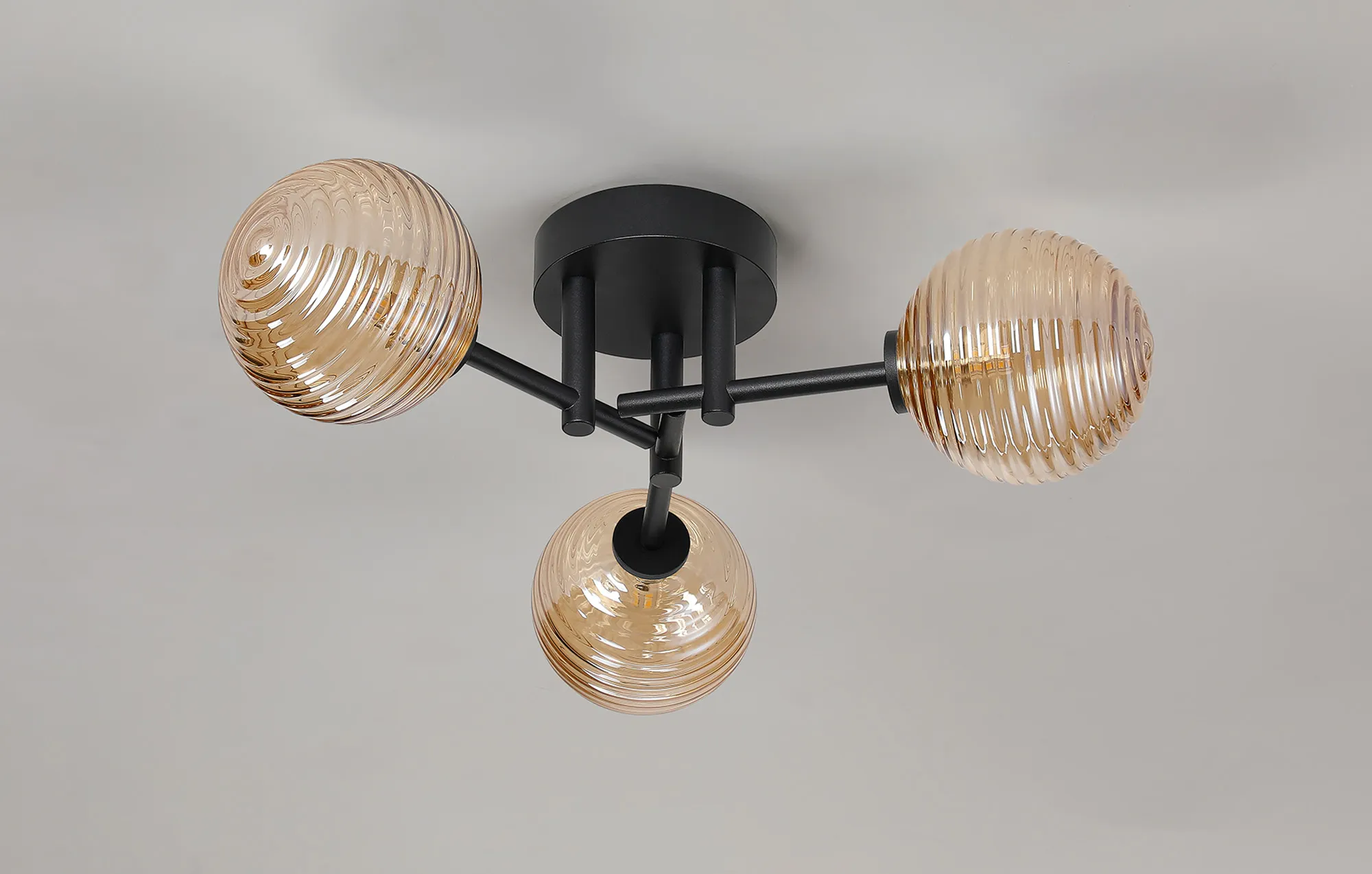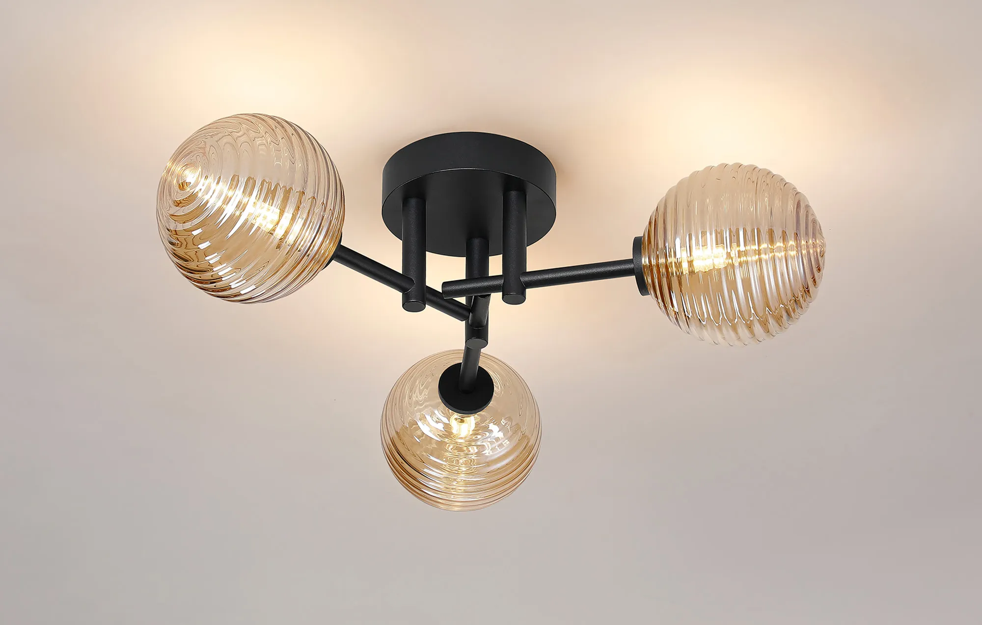 OTHER Nova 44.5cm Semi Flush Ceiling Round, 3 Light G9, IP44, Satin Black/Amber Ribbed Round Glass