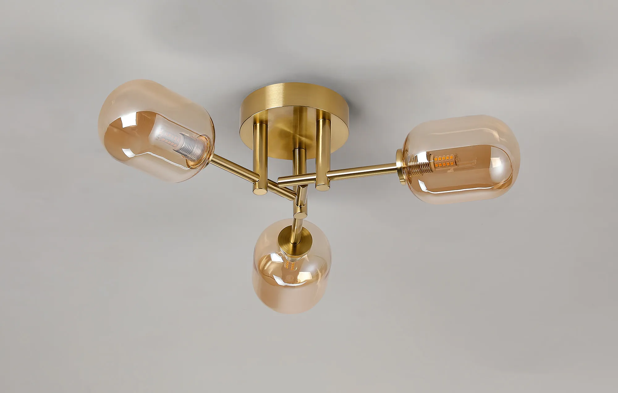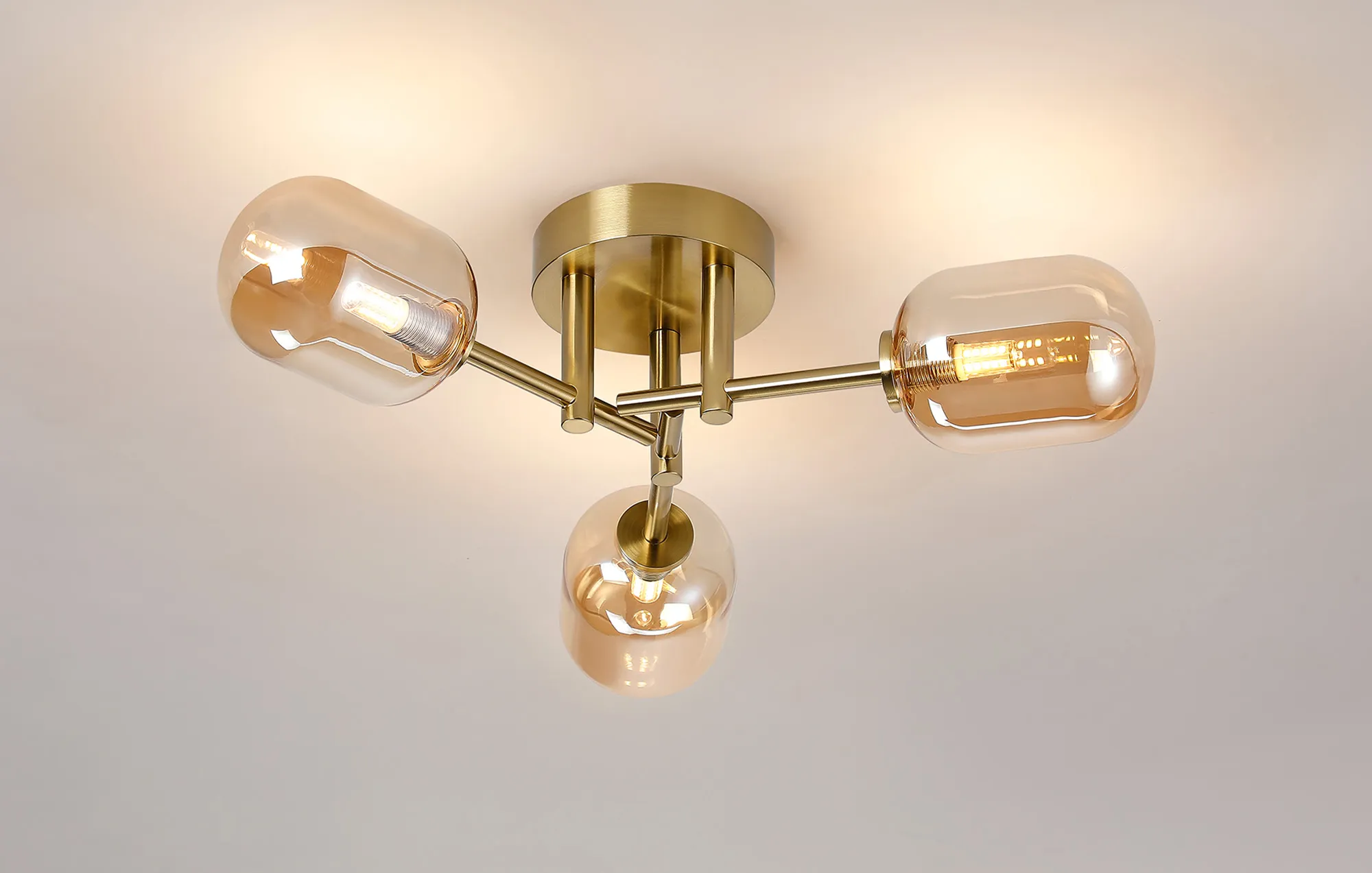 OTHER Nova Round Semi Flush Ceiling 3 Light IP44 Brass Gold/Amber Smooth Tubular Glass