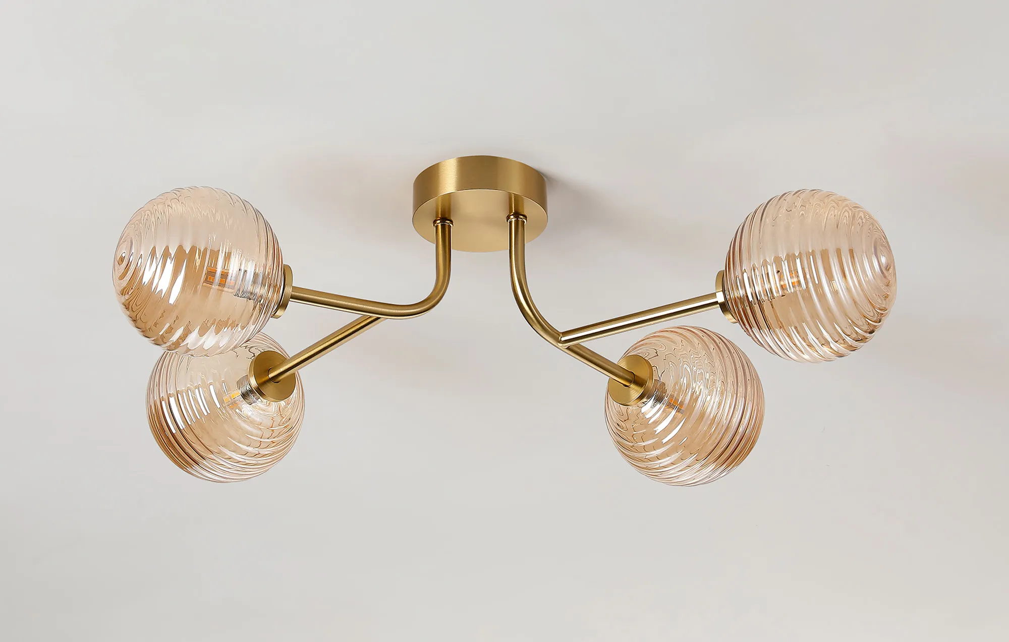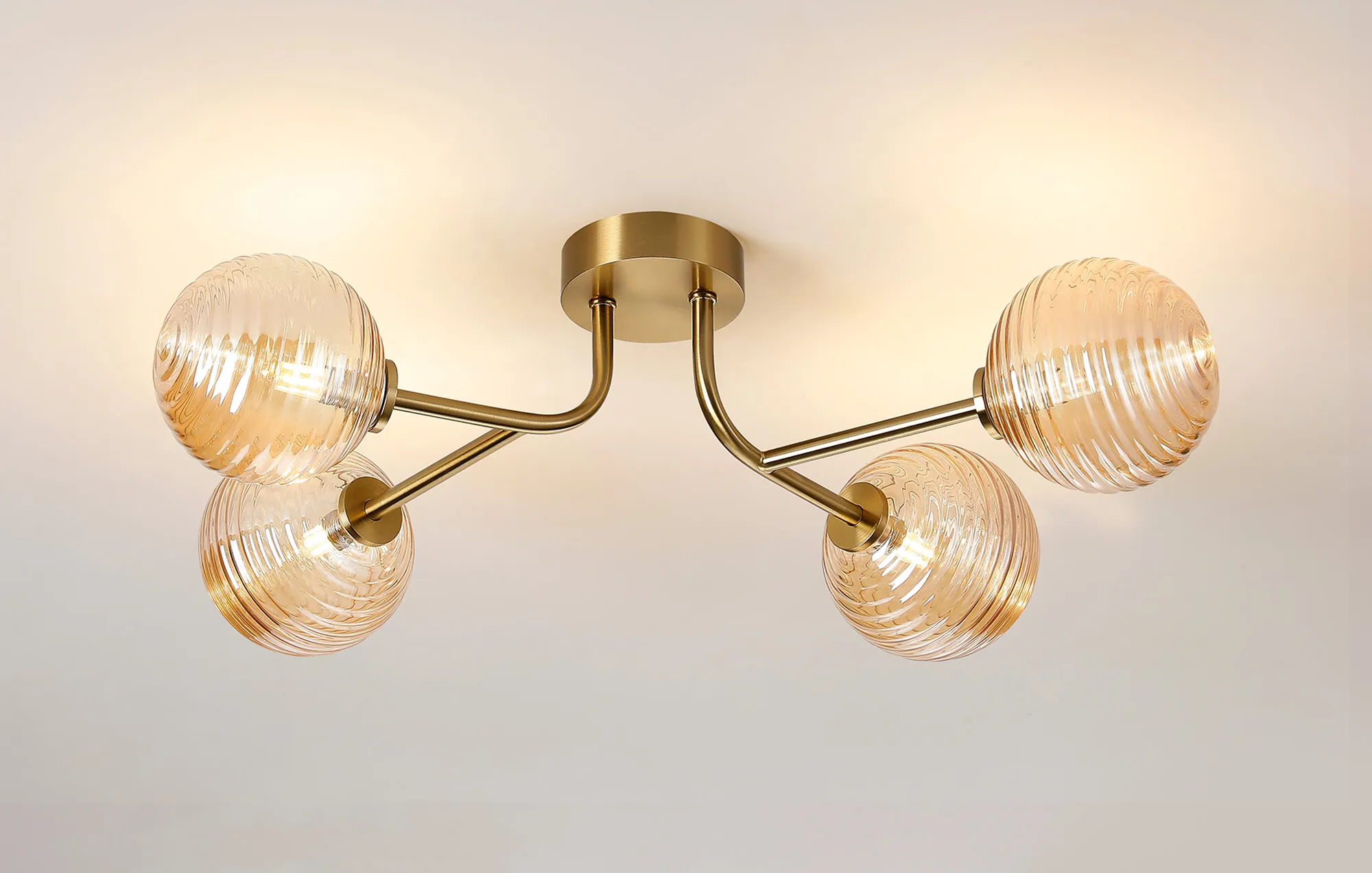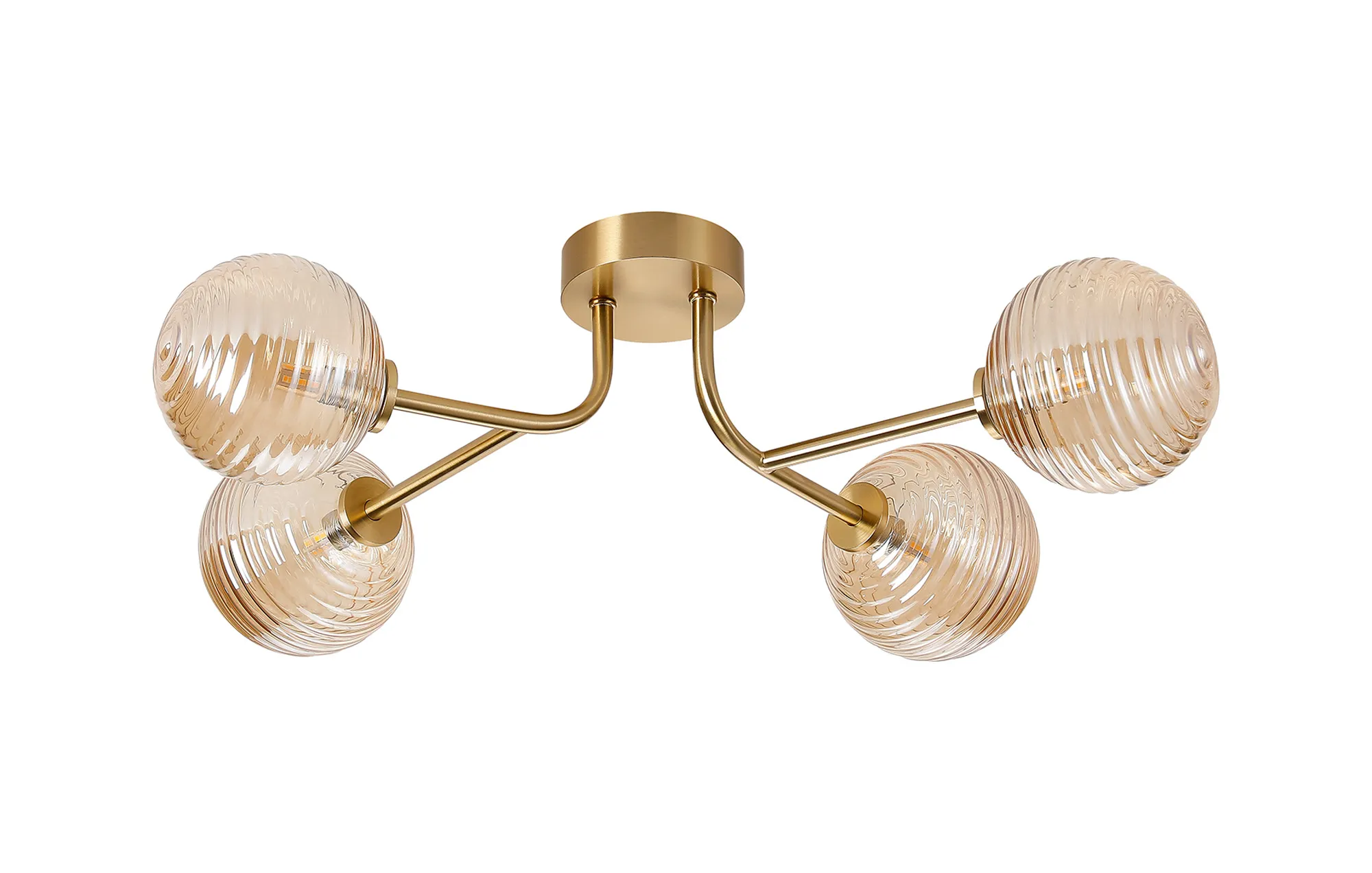 OTHER Nova Linear Semi Flush Ceiling 4 Light IP44 Brass Gold/Amber Ribbed Round Glass