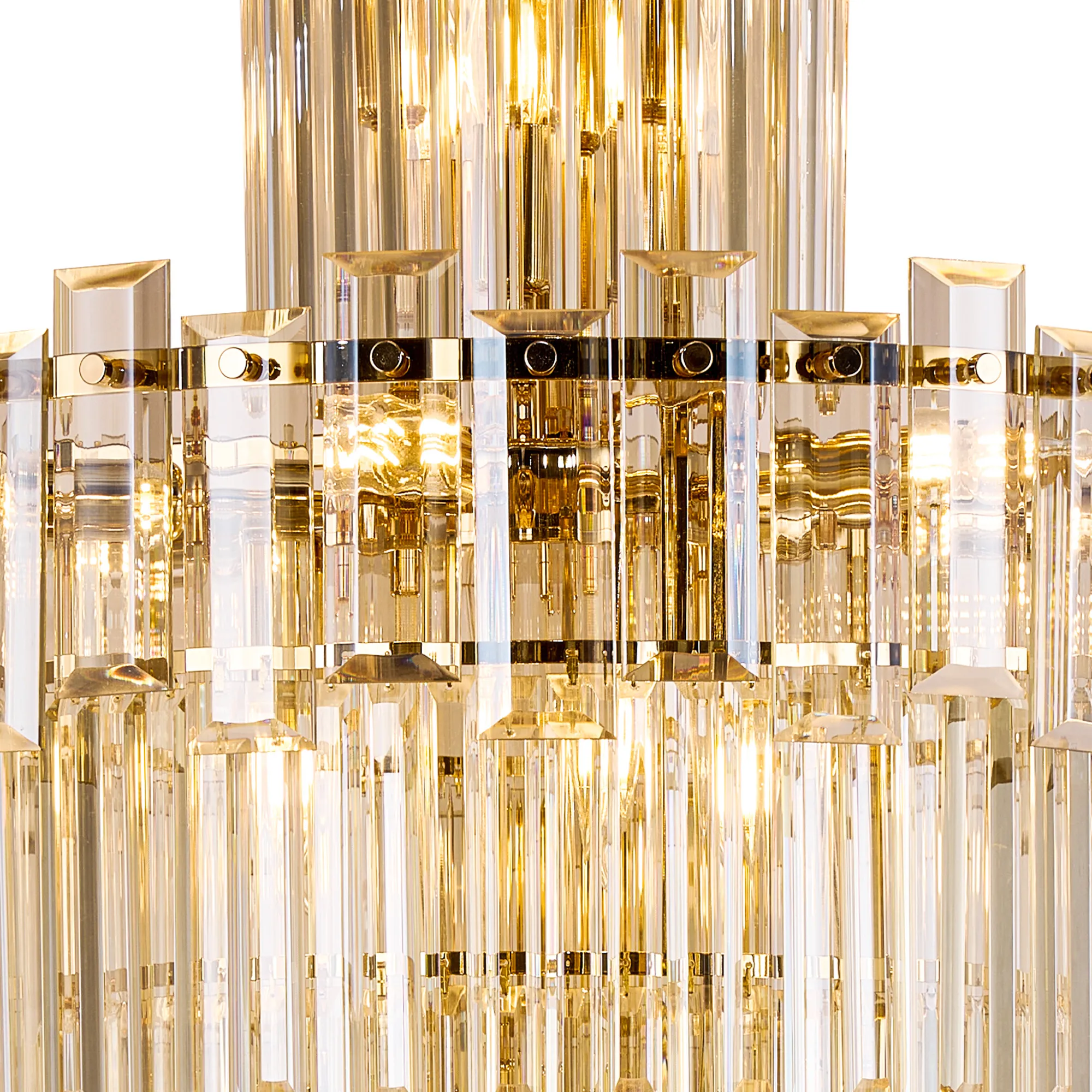 The Cumbernauld collection offers a stunning and luxurious lighting solution for dramatic impact. It is available in either a french gold or polished nickel finish. The layers of dazzling clear glass pieces are cut into different sized rectangular forms increasing the character and decadence of each chandelier. A complementing wall lamp provides an additional lighting option.