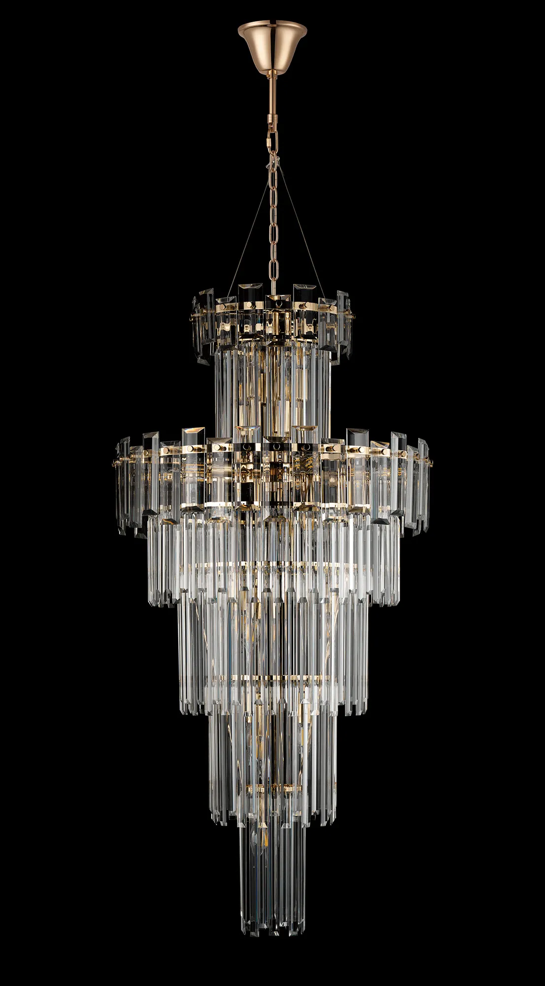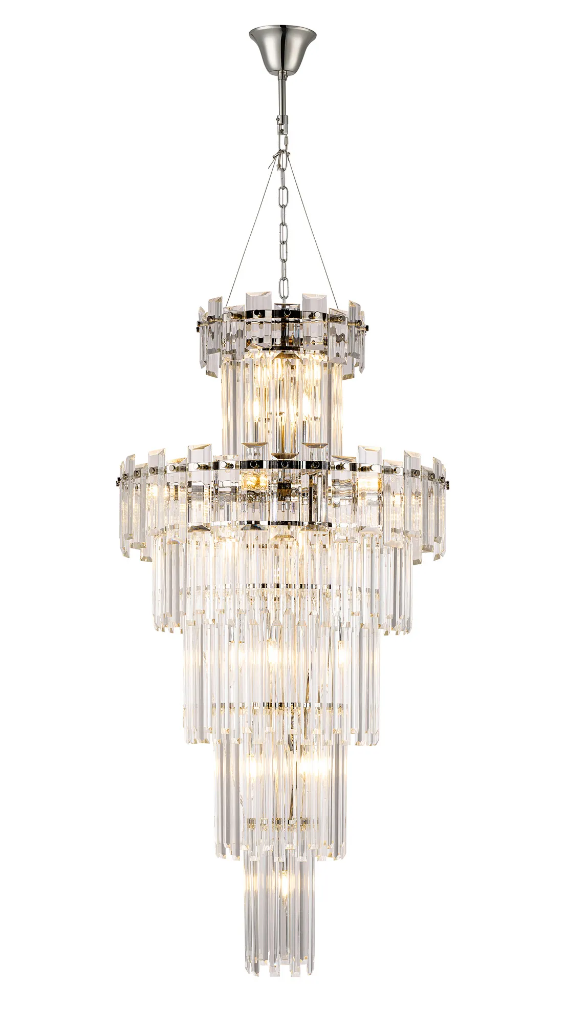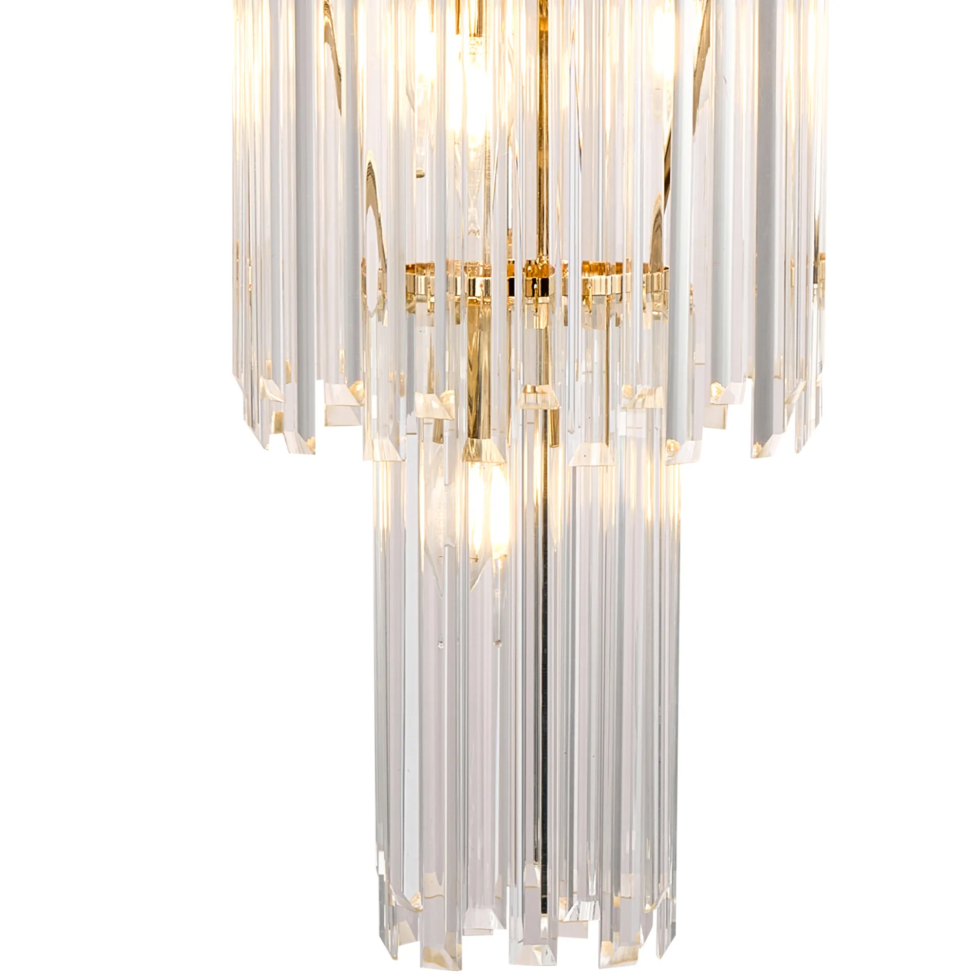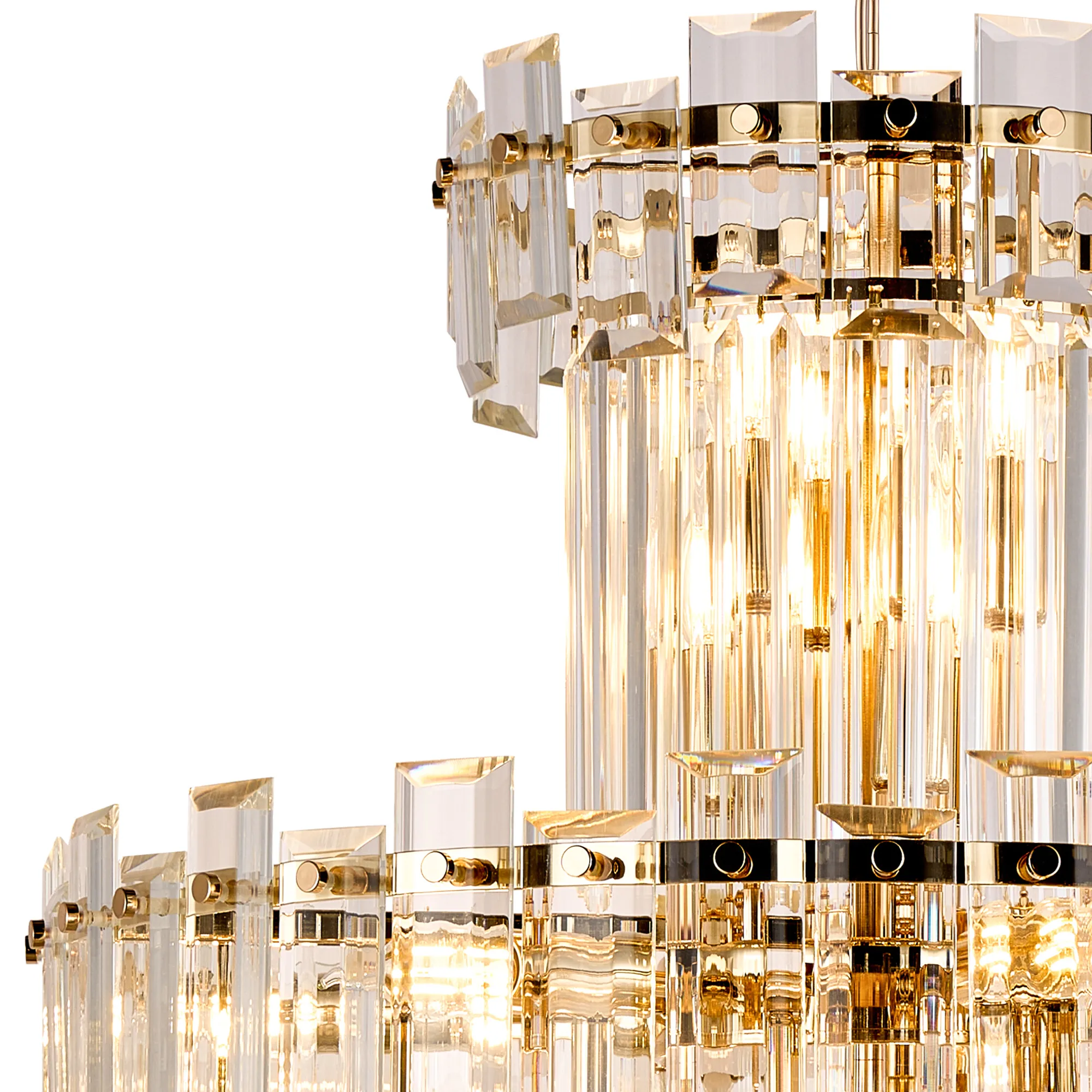 The Cumbernauld collection offers a stunning and luxurious lighting solution for dramatic impact. It is available in either a french gold or polished nickel finish. The layers of dazzling clear glass pieces are cut into different sized rectangular forms increasing the character and decadence of each chandelier. A complementing wall lamp provides an additional lighting option.