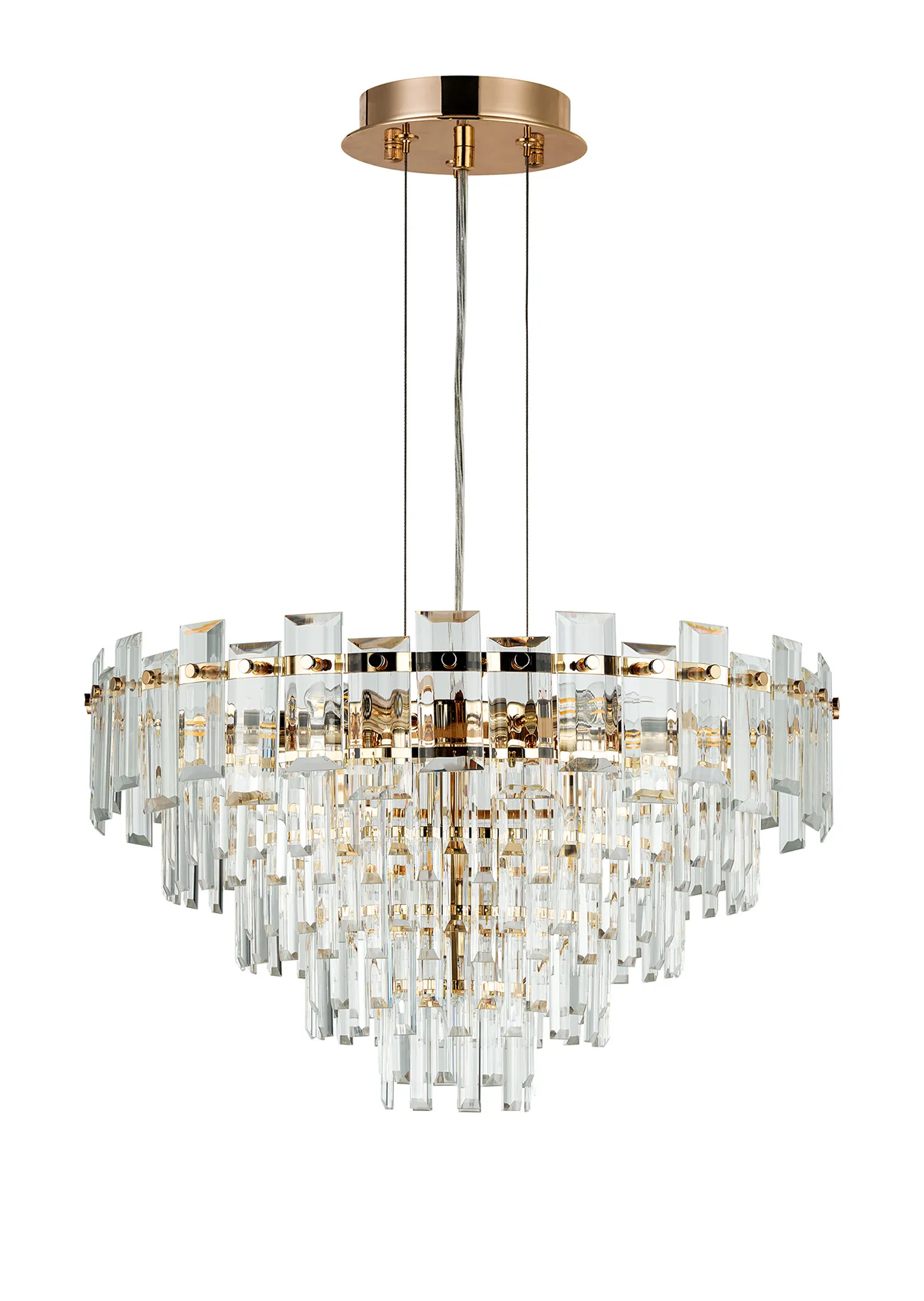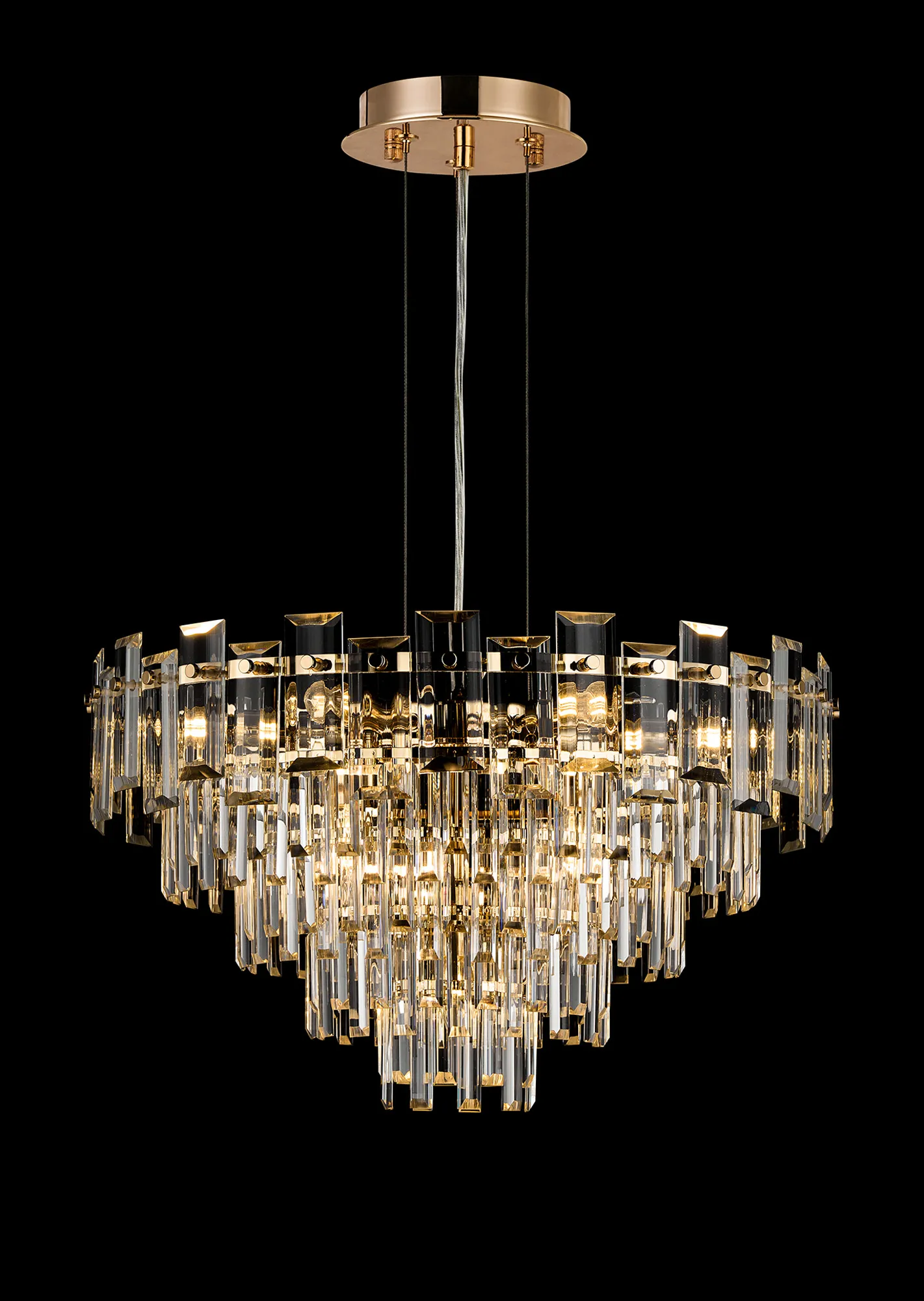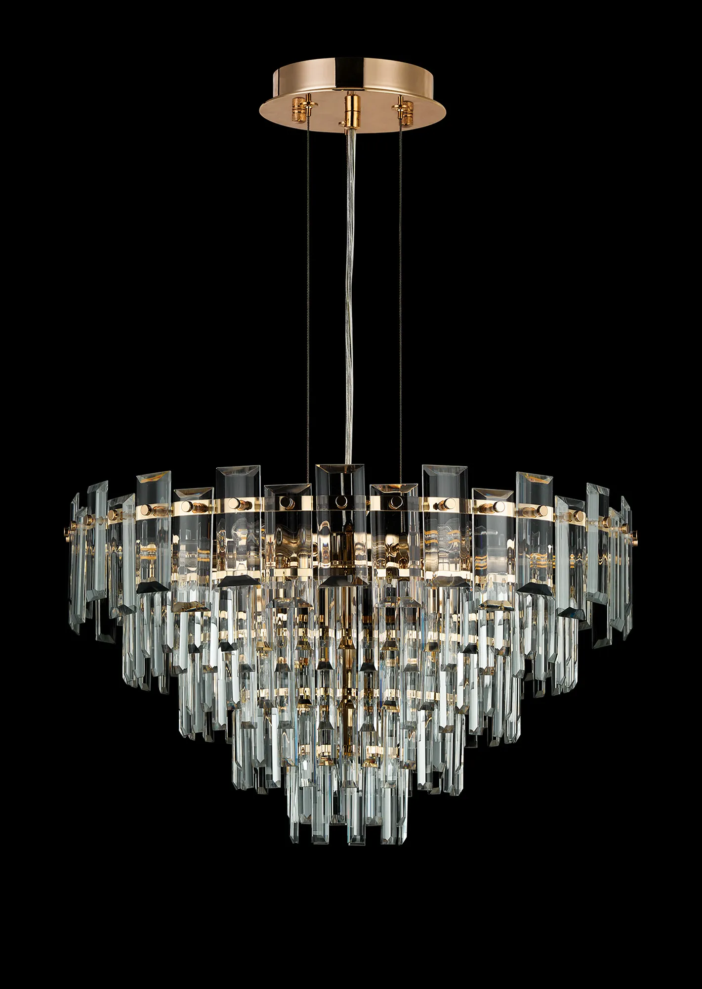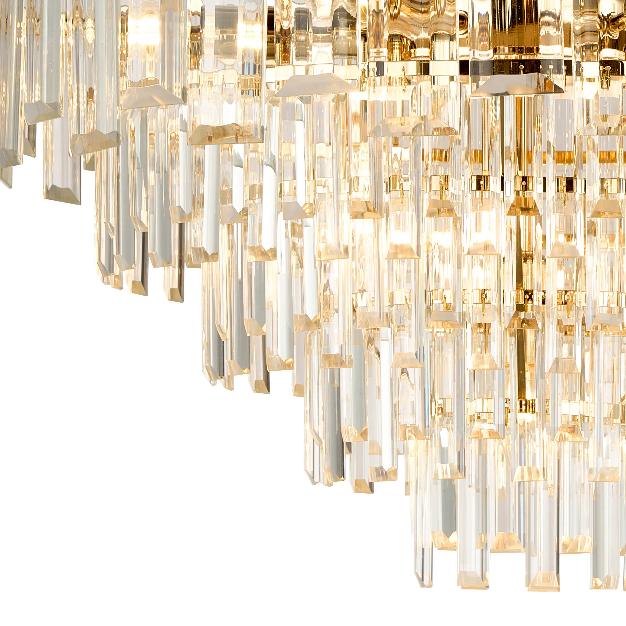 The Cumbernauld collection offers a stunning and luxurious lighting solution for dramatic impact. It is available in either a french gold or polished nickel finish. The layers of dazzling clear glass pieces are cut into different sized rectangular forms increasing the character and decadence of each chandelier. A complementing wall lamp provides an additional lighting option.