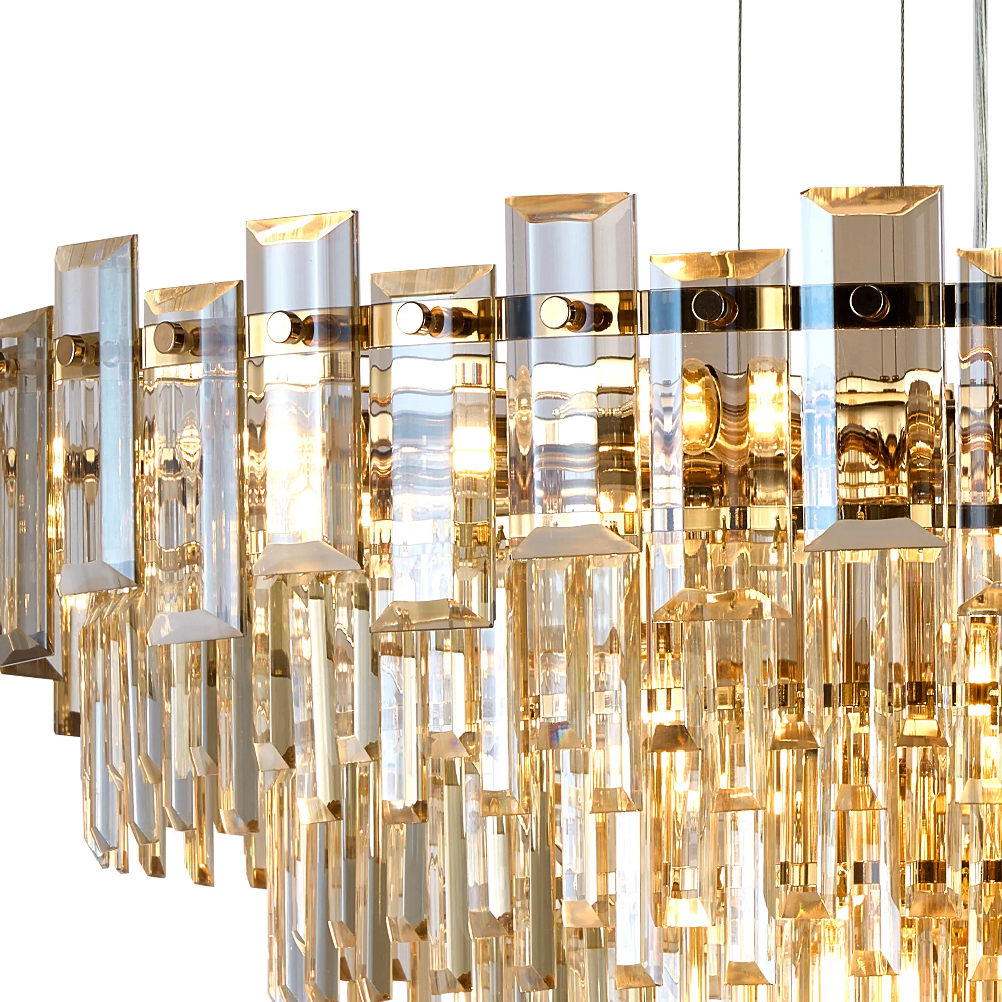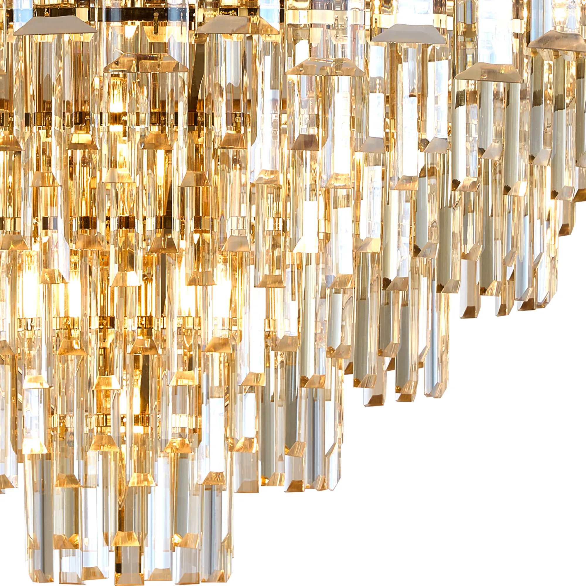 The Cumbernauld collection offers a stunning and luxurious lighting solution for dramatic impact. It is available in either a french gold or polished nickel finish. The layers of dazzling clear glass pieces are cut into different sized rectangular forms increasing the character and decadence of each chandelier. A complementing wall lamp provides an additional lighting option.