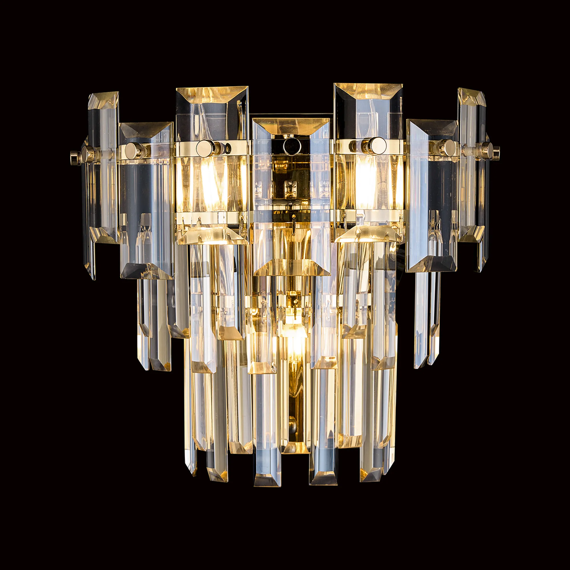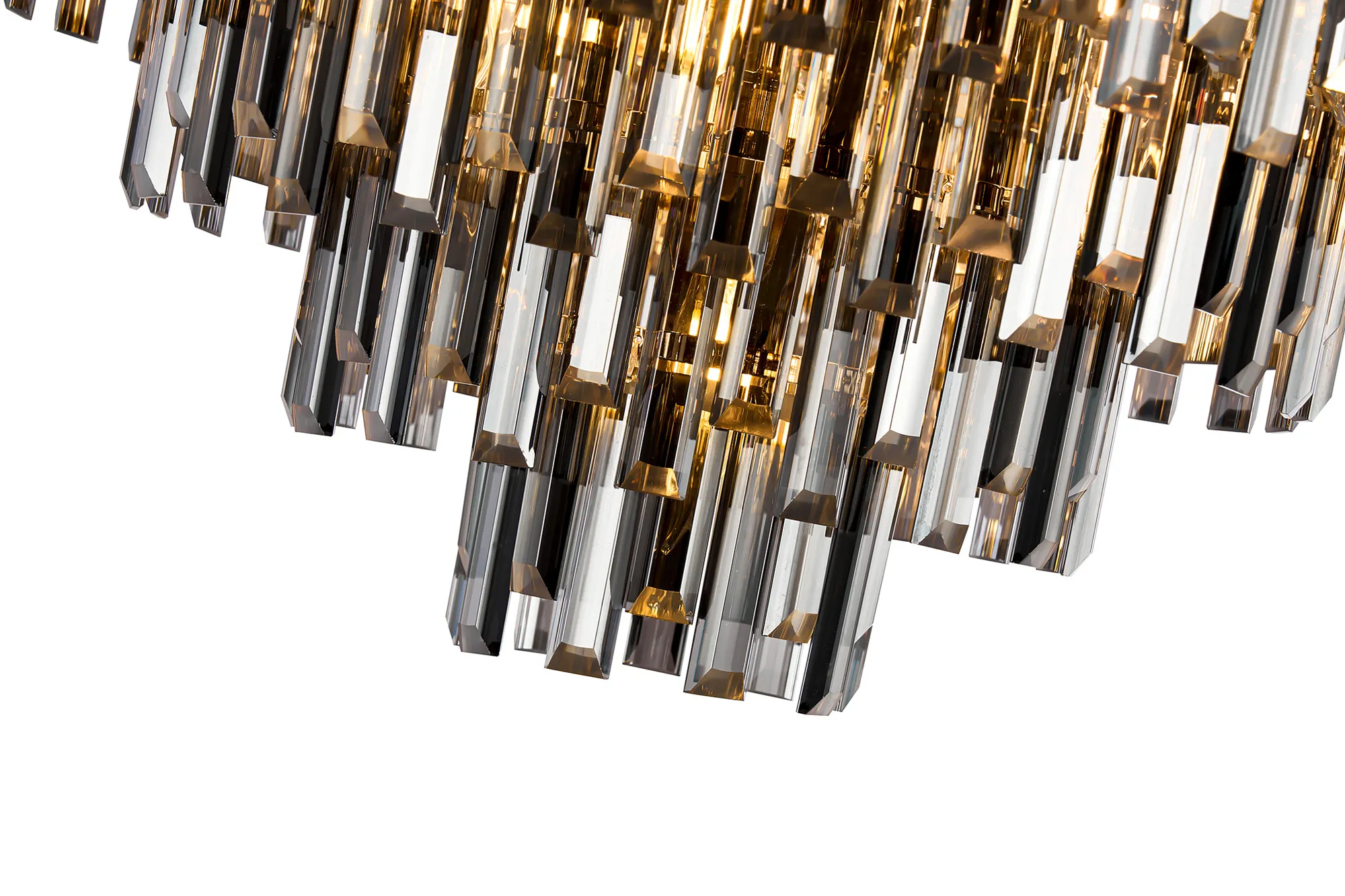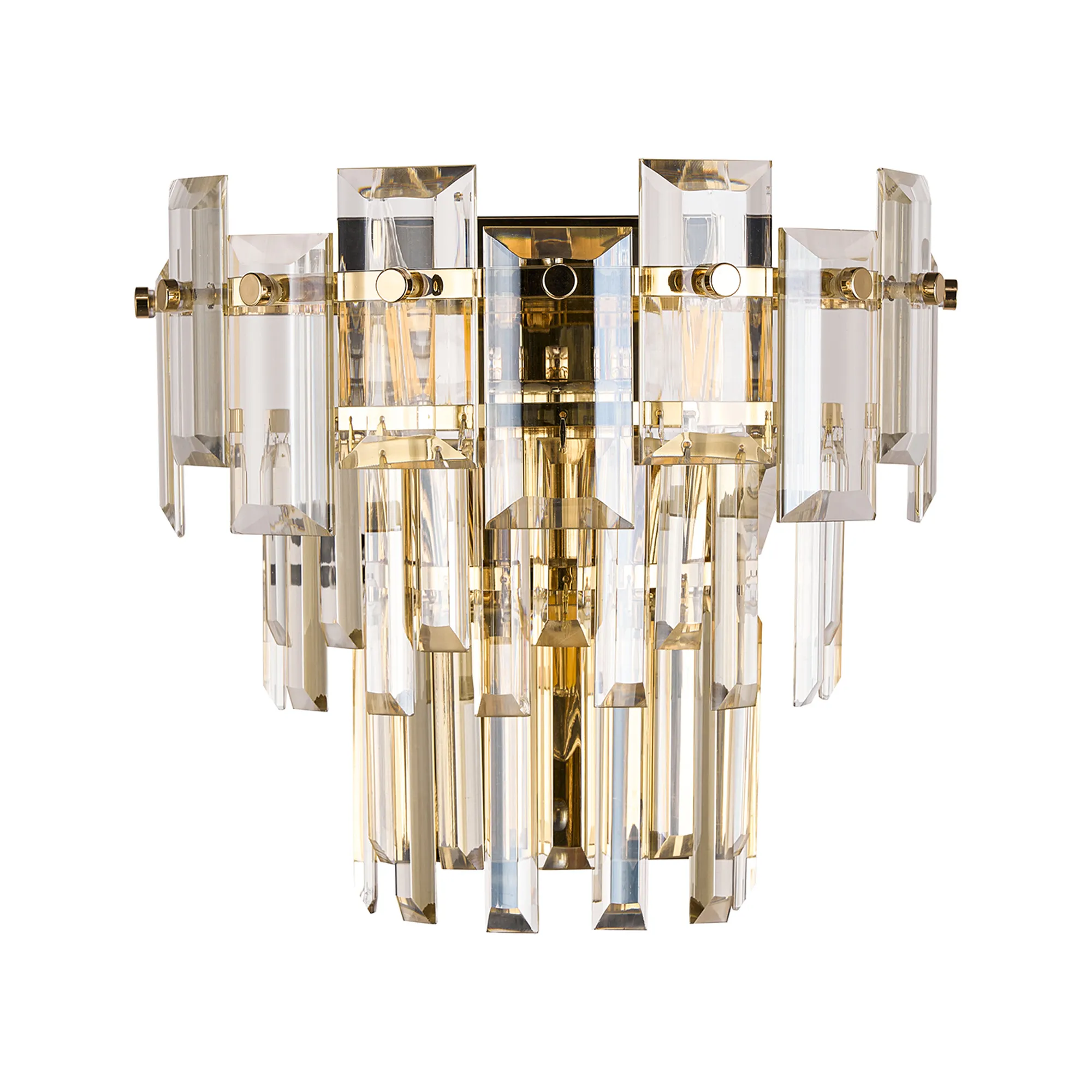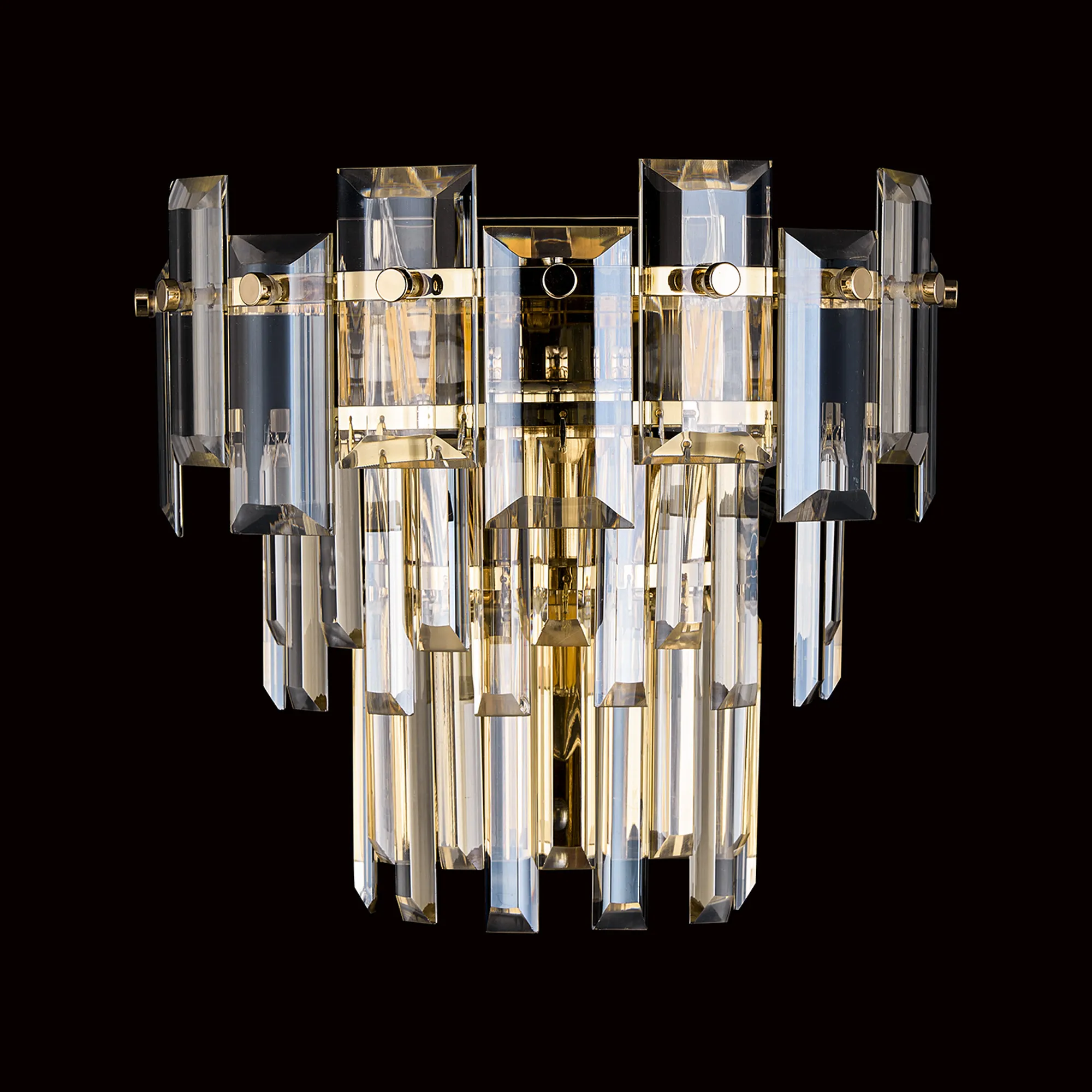 The Cumbernauld collection offers a stunning and luxurious lighting solution for dramatic impact. It is available in either a french gold or polished nickel finish. The layers of dazzling clear glass pieces are cut into different sized rectangular forms increasing the character and decadence of each chandelier. A complementing wall lamp provides an additional lighting option.