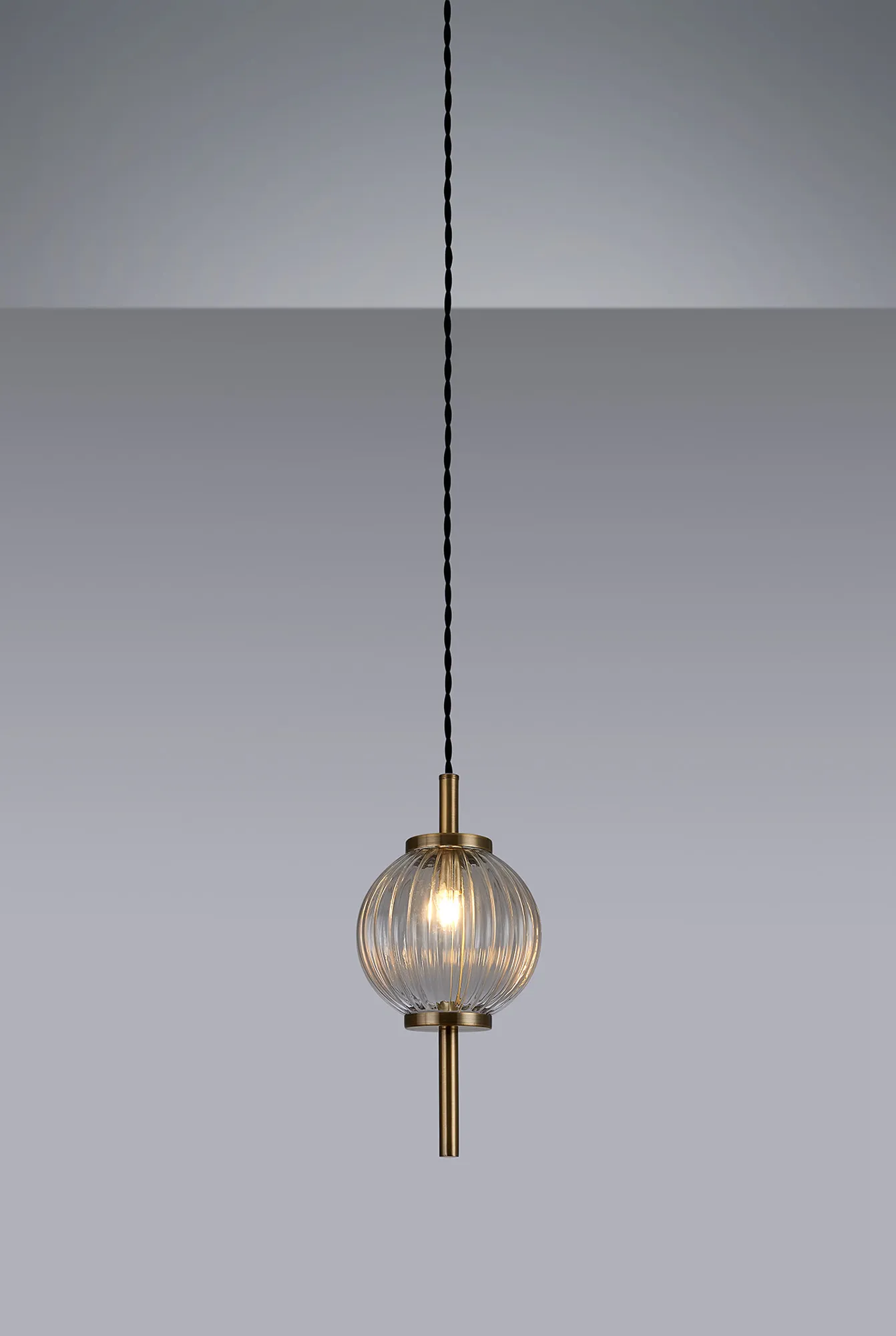The pendant, table and floor lamp featured in the Leigh range host a range of colour combinations with their globe glass; colourful and playful with Blue, Pink and Green or subtle and sleek with Smoke and Amber. These glass pieces, encircling the G9 lamp holders, have a ridged moulding enhancing the luminous sheen given off their coloured tint. The glass fixes to the slim tubular stem, finished in antique brass, in such a way that imitates beads being threaded along string. This peculiar composition can be partnered with one of the two wall lamps available with either a smoked or amber glass to tie in with the pendant, table and floor lamp.