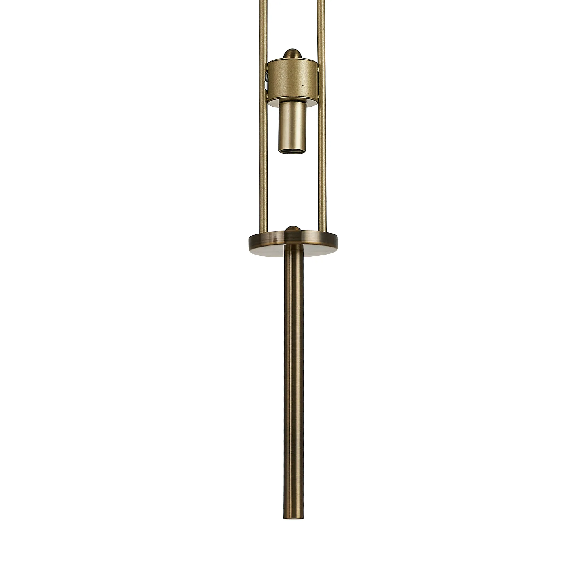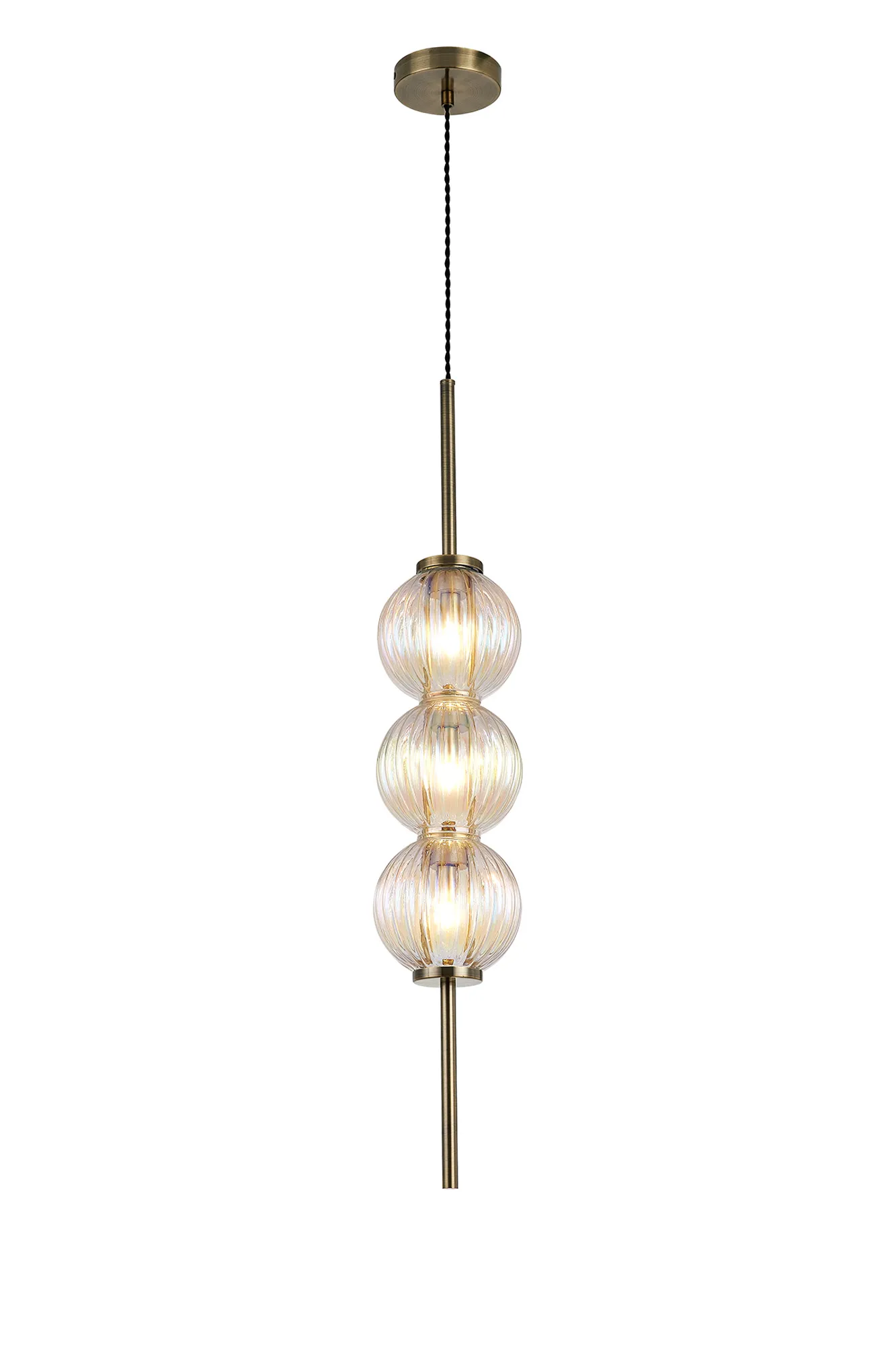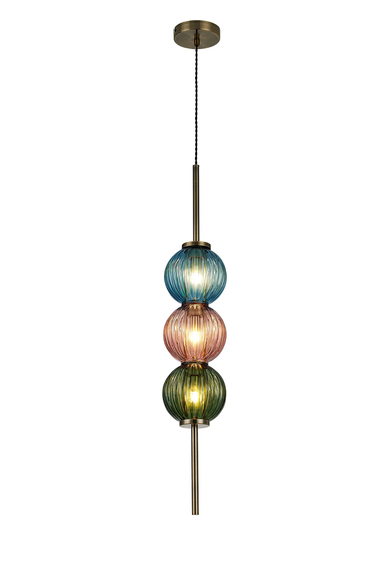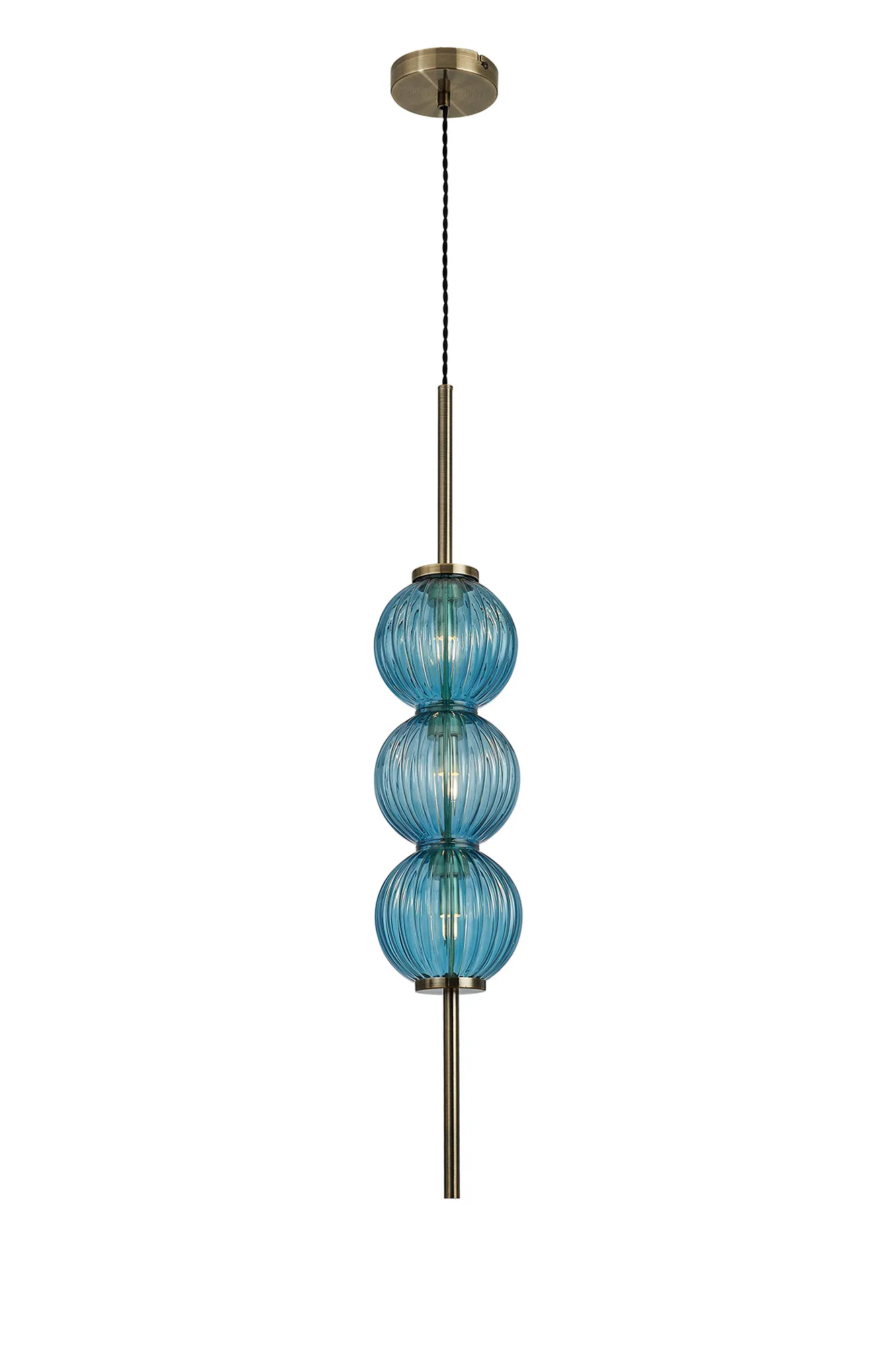The pendant, table and floor lamp featured in the Leigh range host a range of colour combinations with their globe glass; colourful and playful with Blue, Pink and Green or subtle and sleek with Smoke and Amber. These glass pieces, encircling the G9 lamp holders, have a ridged moulding enhancing the luminous sheen given off their coloured tint. The glass fixes to the slim tubular stem, finished in antique brass, in such a way that imitates beads being threaded along string. This peculiar composition can be partnered with one of the two wall lamps available with either a smoked or amber glass to tie in with the pendant, table and floor lamp.