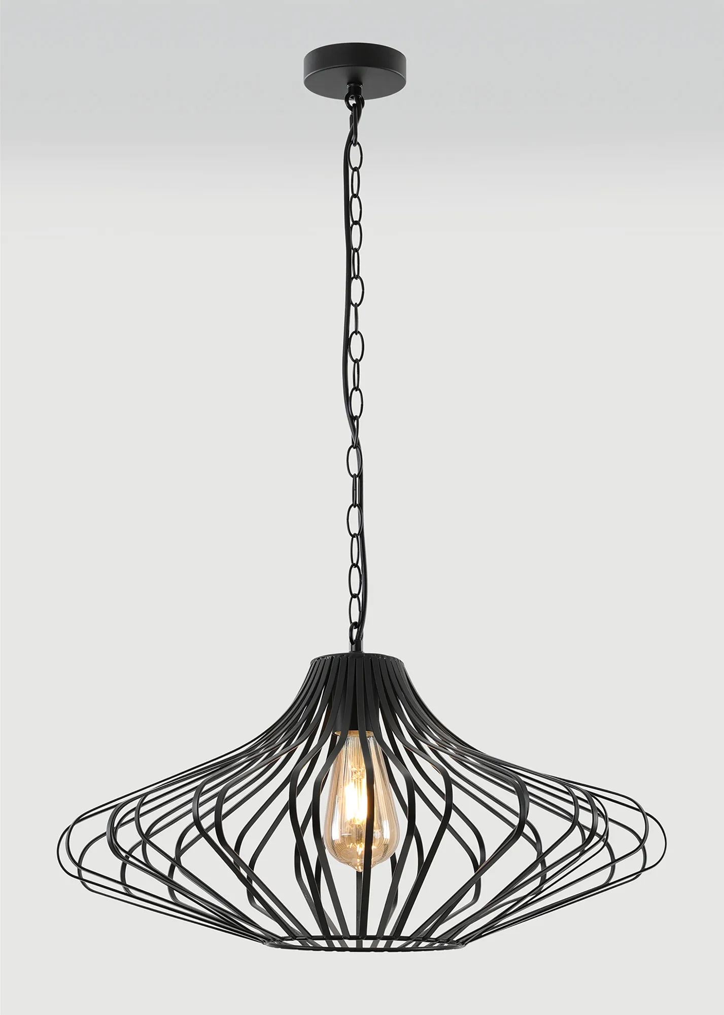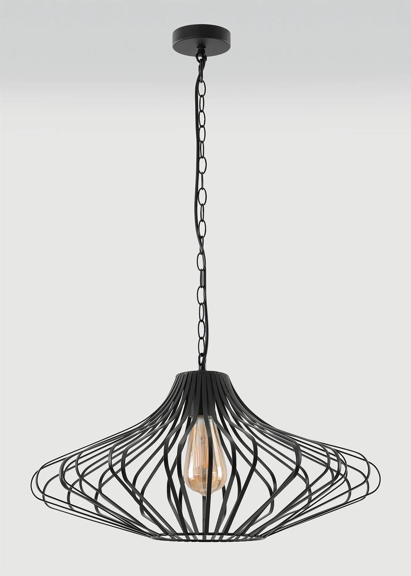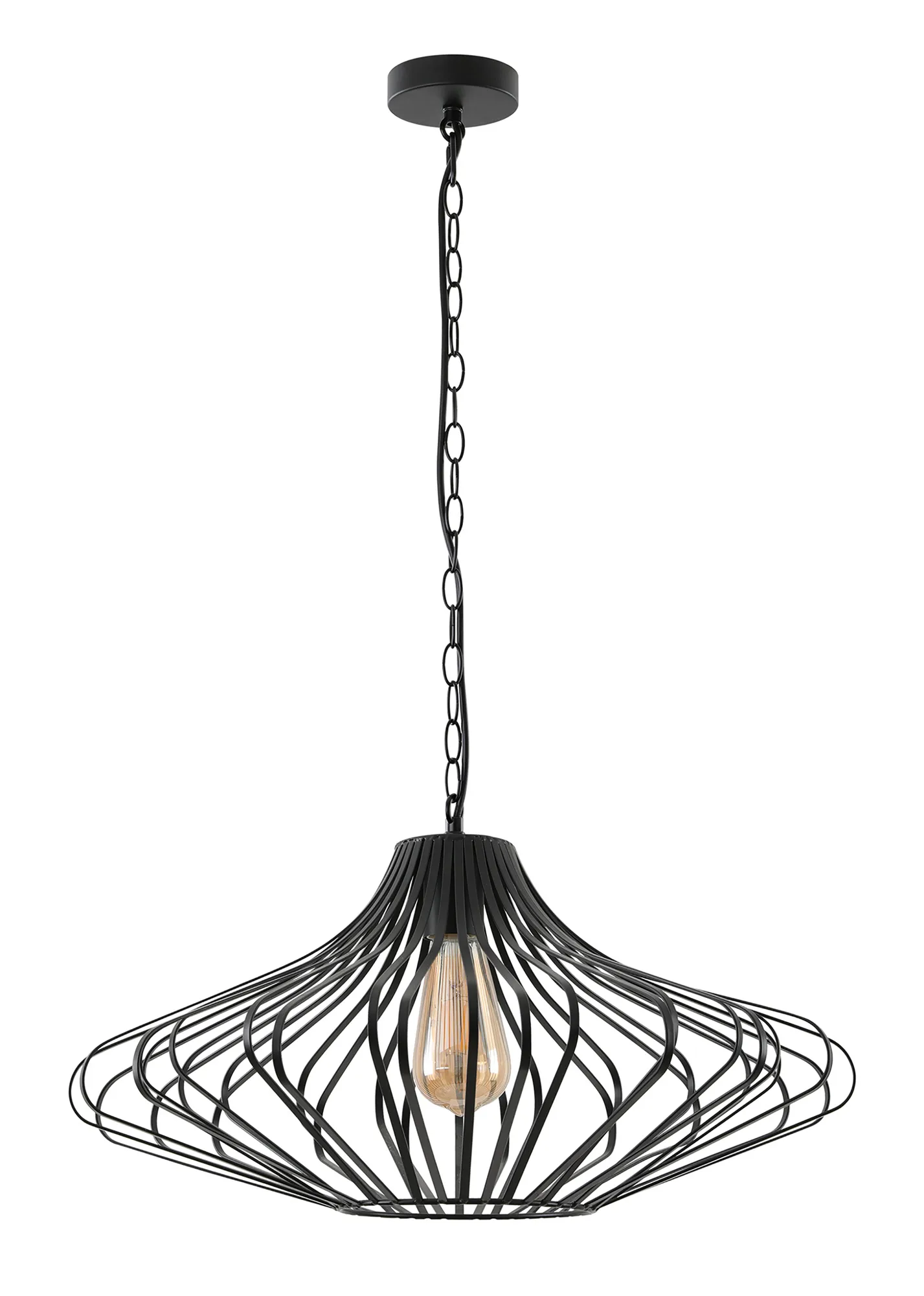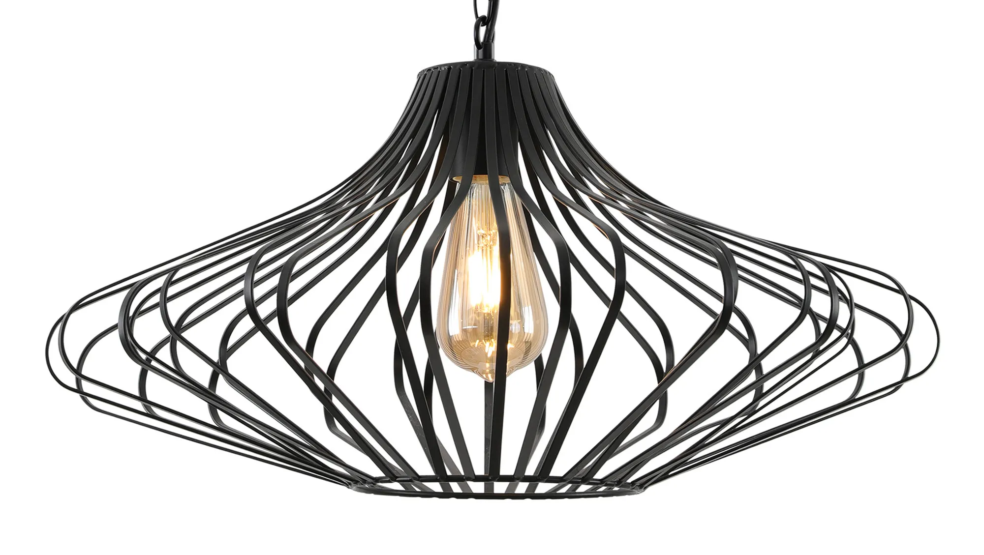 This E27 pendant has a distinctive design that will insert a modern atmosphere in any setting. The wire like frame is manipulated and bent into narrow curves, fanned into a 3D shape around the lamp holder. Open sections around the wire structure provide an optimum dispersal of illumination. The matt black finish enhances the unique appeal of this singular fixture.