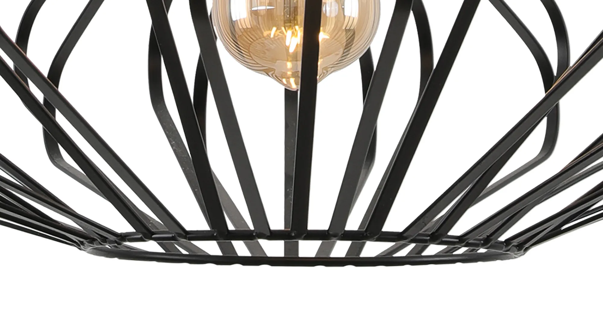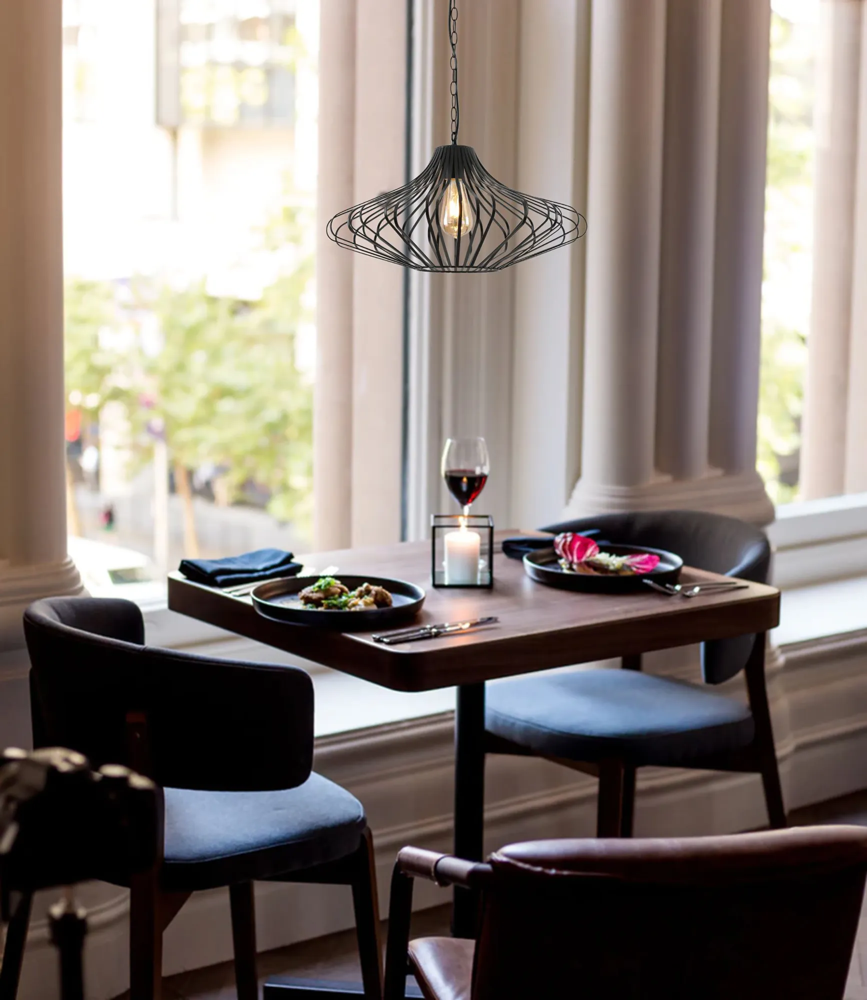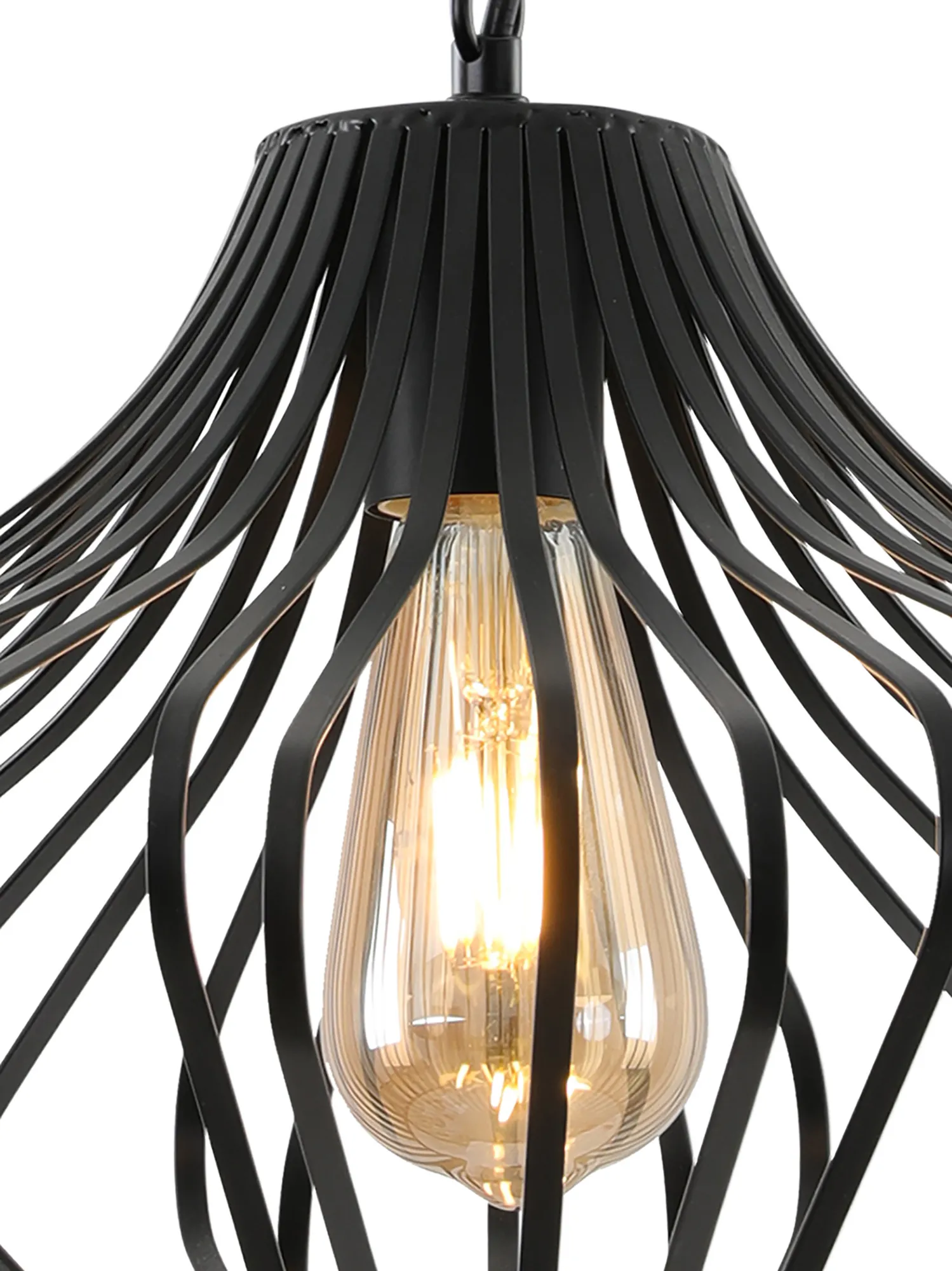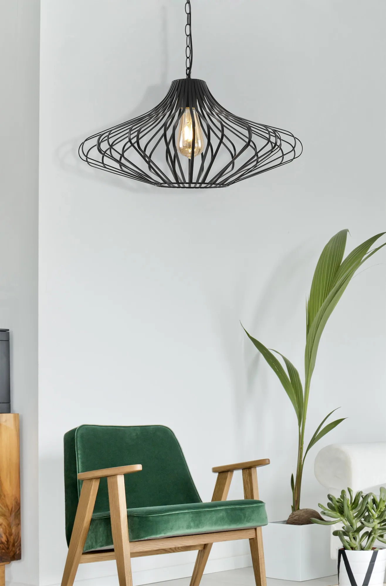 This E27 pendant has a distinctive design that will insert a modern atmosphere in any setting. The wire like frame is manipulated and bent into narrow curves, fanned into a 3D shape around the lamp holder. Open sections around the wire structure provide an optimum dispersal of illumination. The matt black finish enhances the unique appeal of this singular fixture.