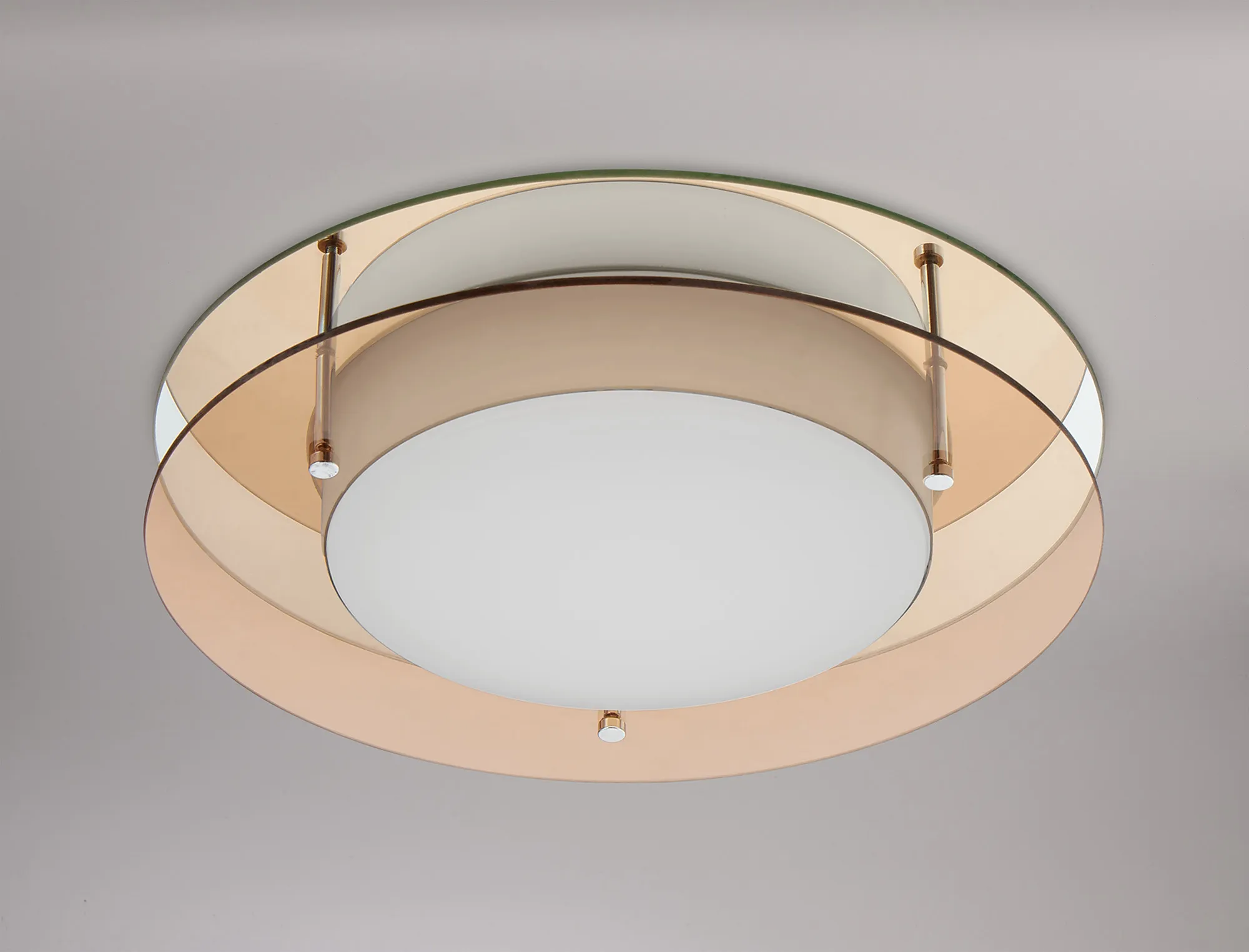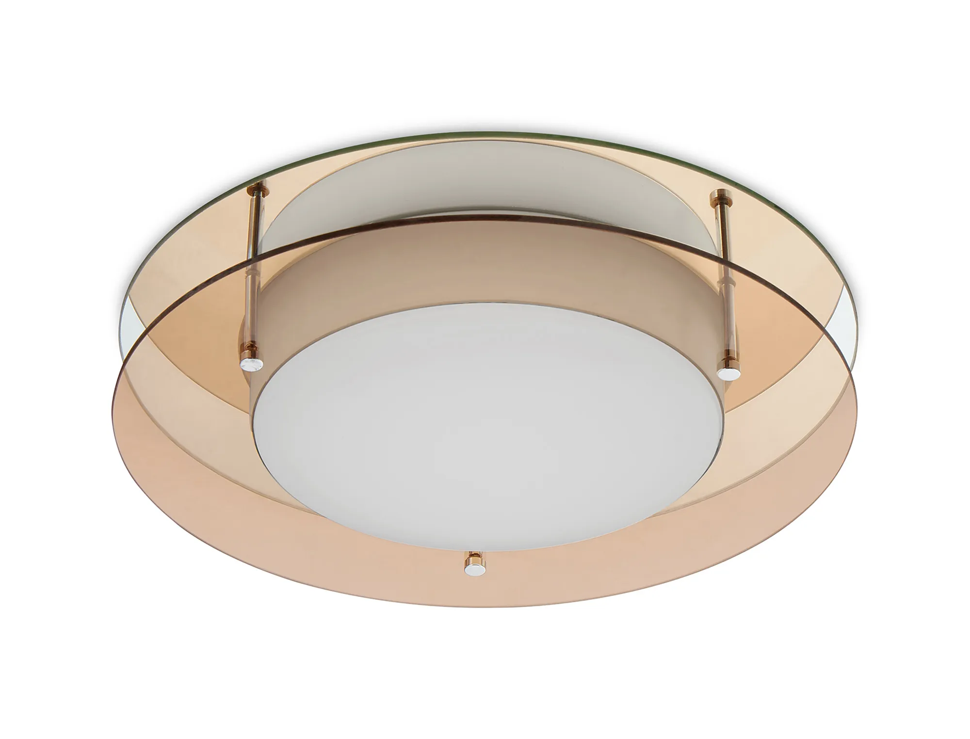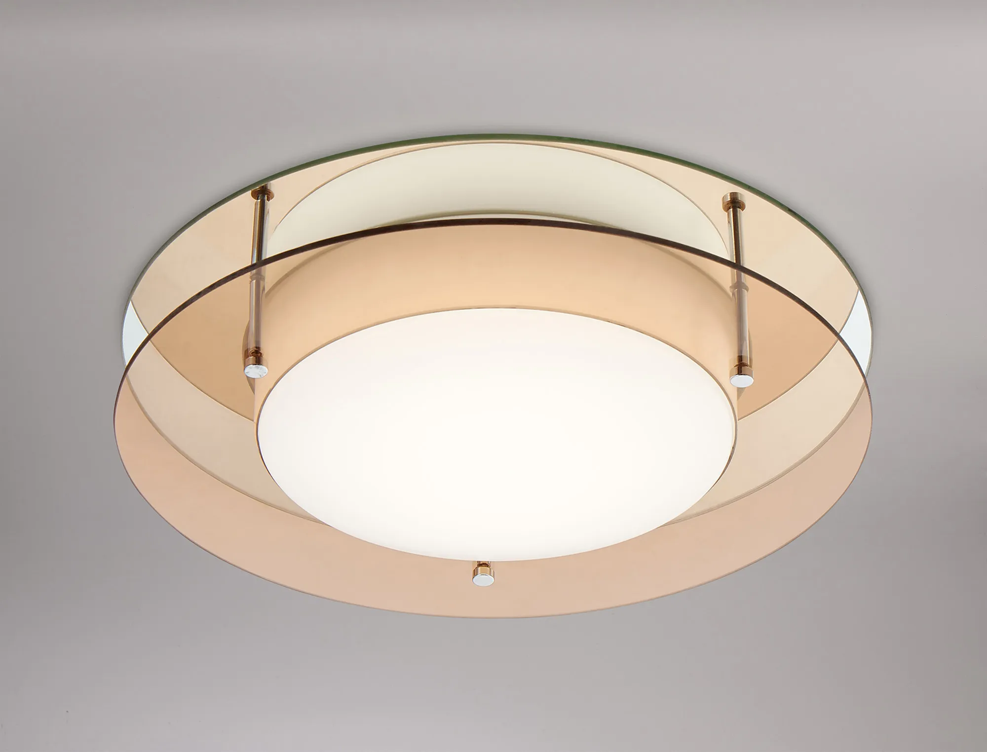 The integral 3000K LEDs of the IP44 Otara ceiling lights are concealed and filtered within an opal white diffuser. The round, mirrored glass back plate is parallel to the translucent acrylic ring creating a three dimensional reflective illusion encircling the central light. This harmonious effect applied to a flush fixture enhances the style of a low ceiling bathroom setting, available in a smoked colour or amber to suit the colour scheme of the internal décor.