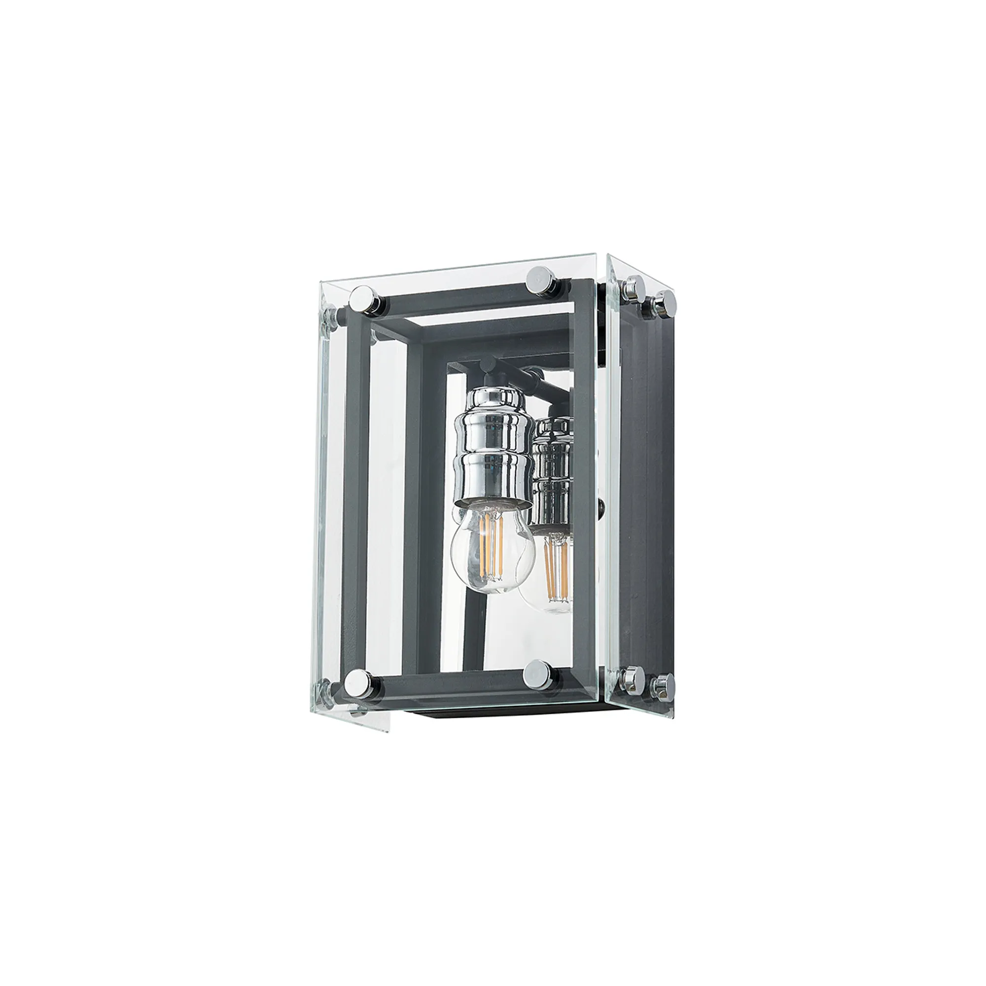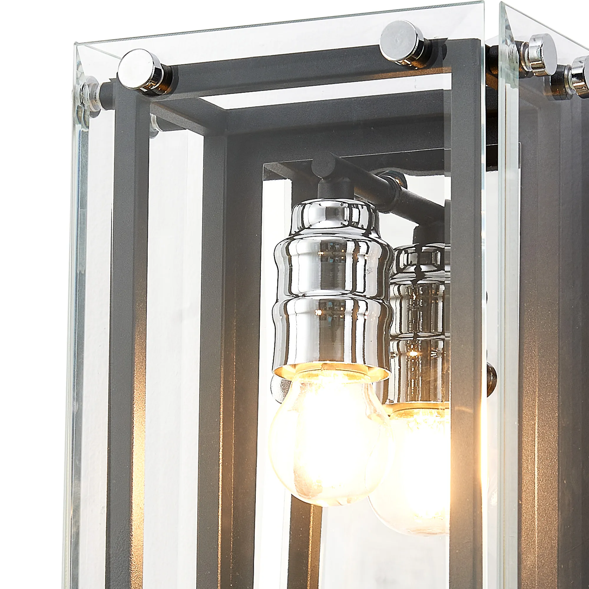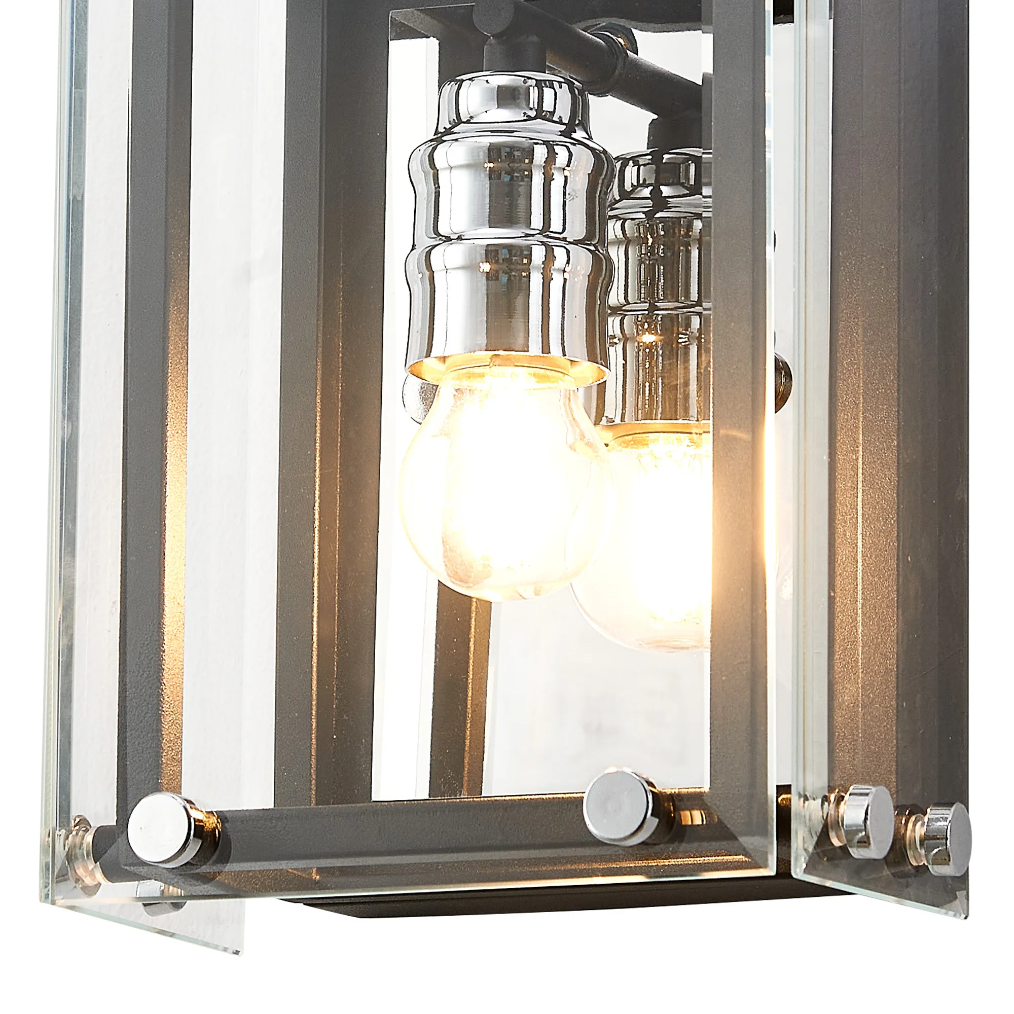 George is a contemporary range of square glass pendants with complementing flush, semi flush and wall light fixtures. The intricate design details of this range see the matt black colour finish accentuated by the polished chrome components. This added attractive, contrasting detail applies a modern twist to an otherwise traditional concept; suitable for a wide range of settings. The open spaces between the framework are filled with high quality clear glass panes to further reflect the light from the E27 lamp holders.