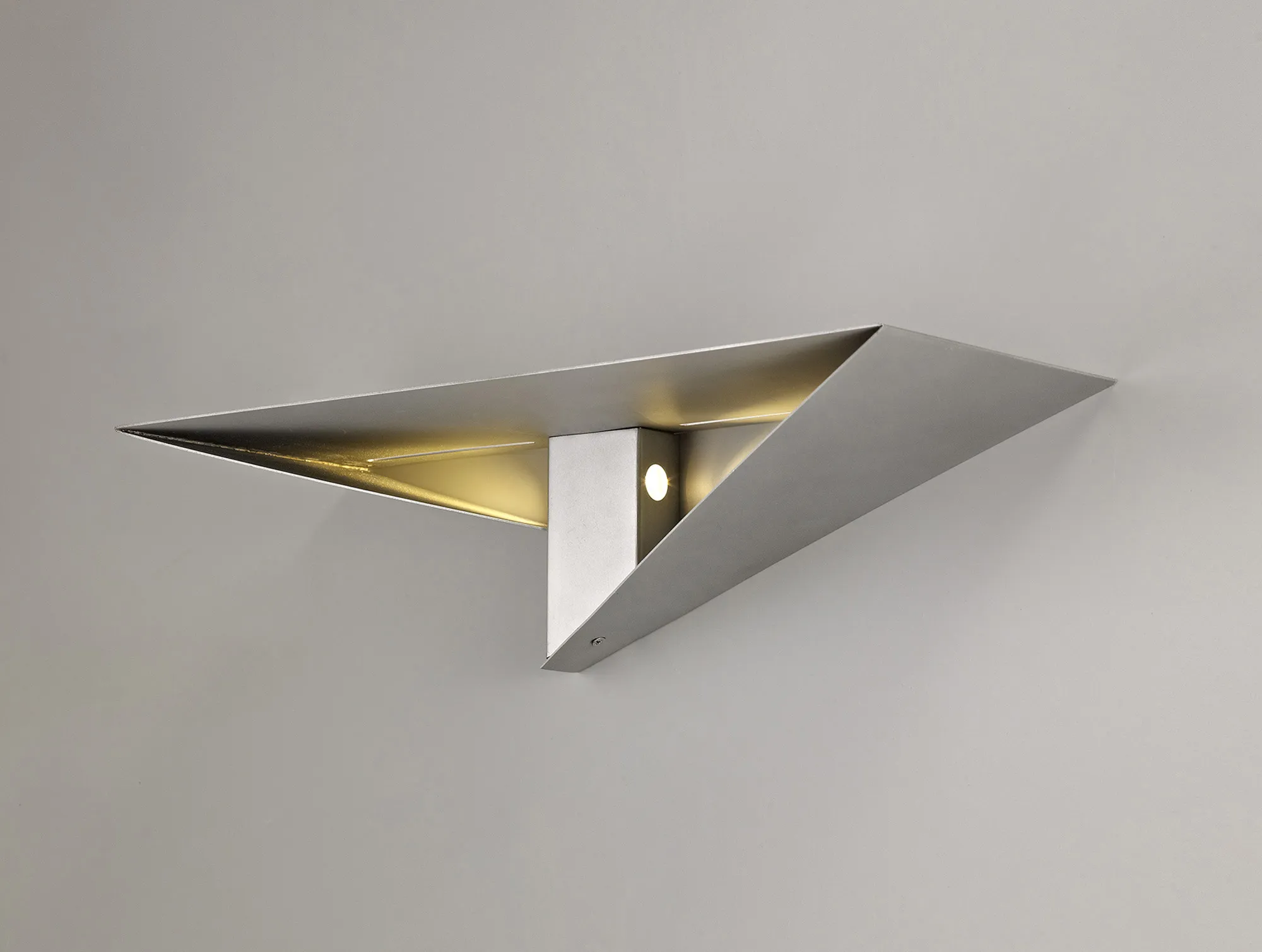 Sunnyside's unconventional triangular angles fashion a modern and distinctive wall lamp feature. The integral LEDs are fixed within the centre of the wall lamp on either side of the rectangular tube, the light emitted illuminates the inside of the trilateral area within the frame. The flat edge along the top of the fixture hosts cut out slim slots offering a slight, soft dispersal of light in an upwards direction. Available in three colour finishes; gold painted, silver painted or white, Sunnyside is designed to enhance the artistic feel of its chosen setting.