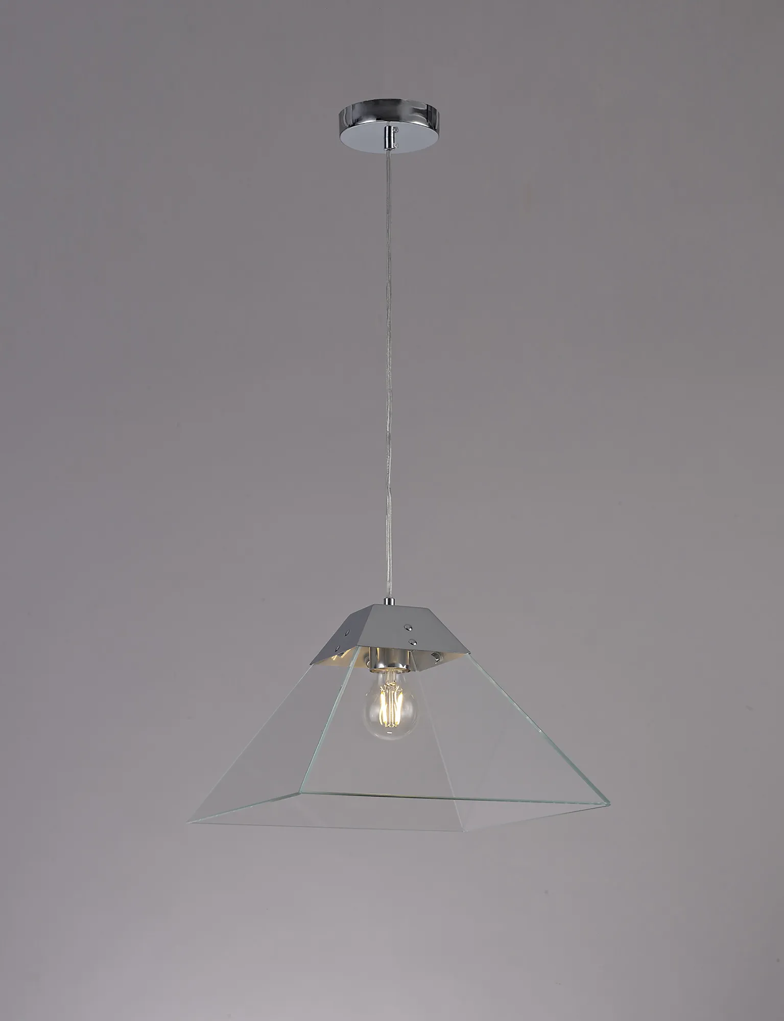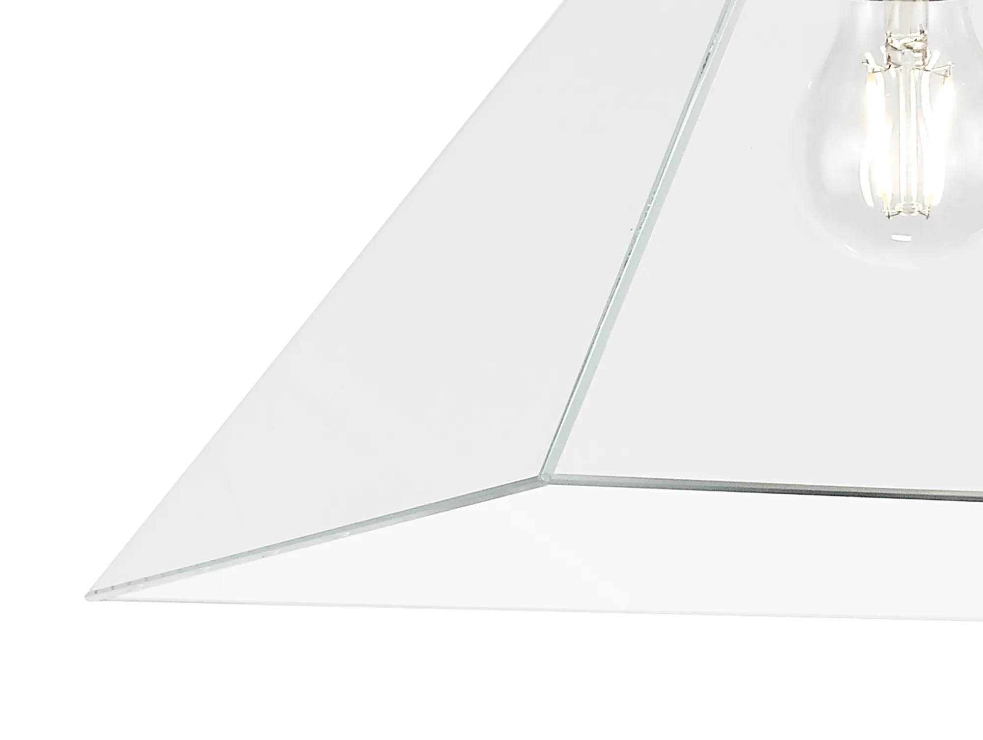 Nelson utilises the maximum output possible for the chosen E14 or E27 lamp, by transferring the traditional pyramid shape of fabric shades onto a transparent material. The open glass forms not only allow a wider projection of light from the open space but also permit a more overall ambient dispersion of light through the clear glass sides. The wall lamps within this collection are particularly prominent with the trapezium plate reflecting the lines of the glass housing. Both the single pendants and wall lamps are available in either a polished chrome or antique brass colour finish.