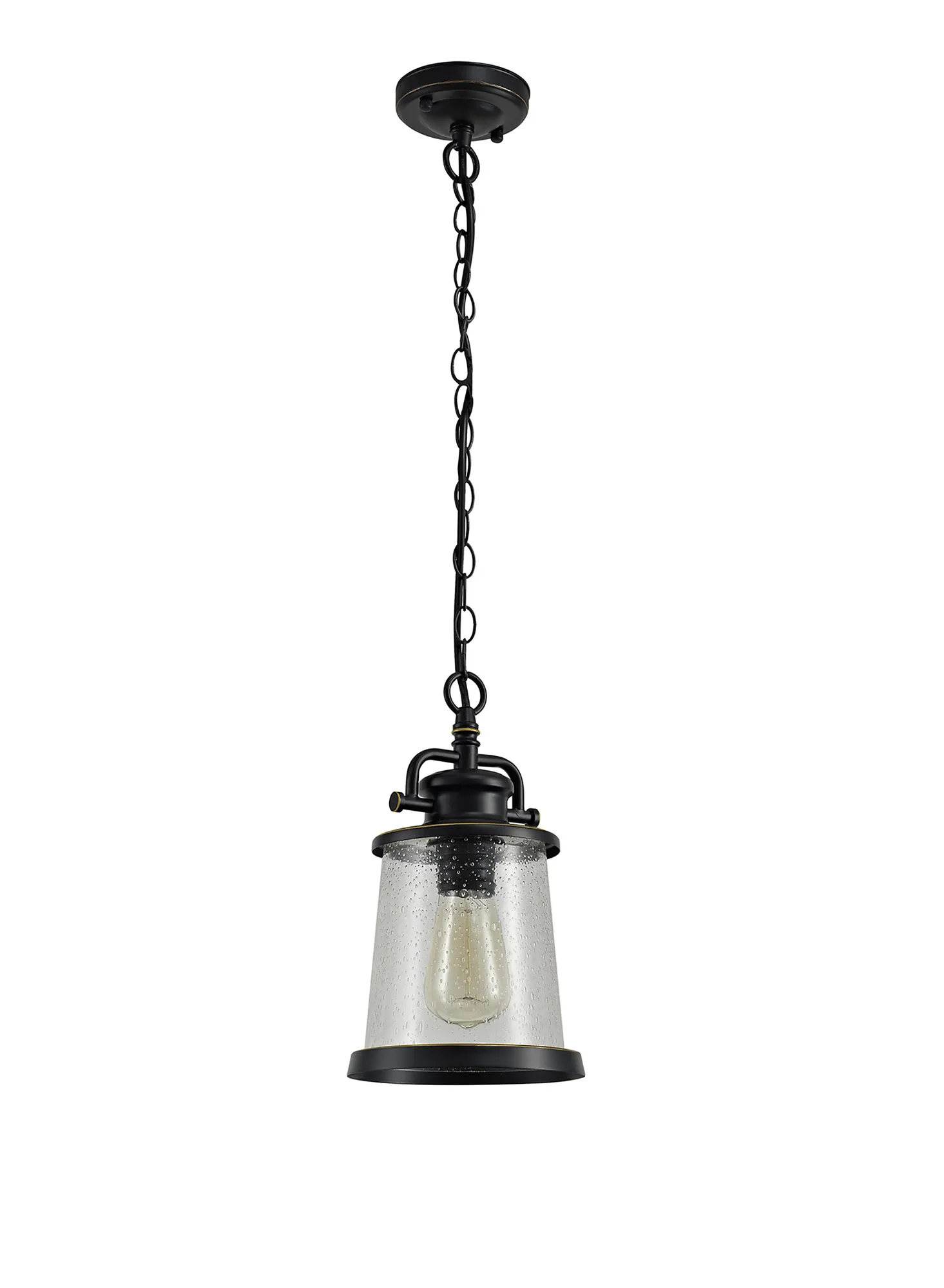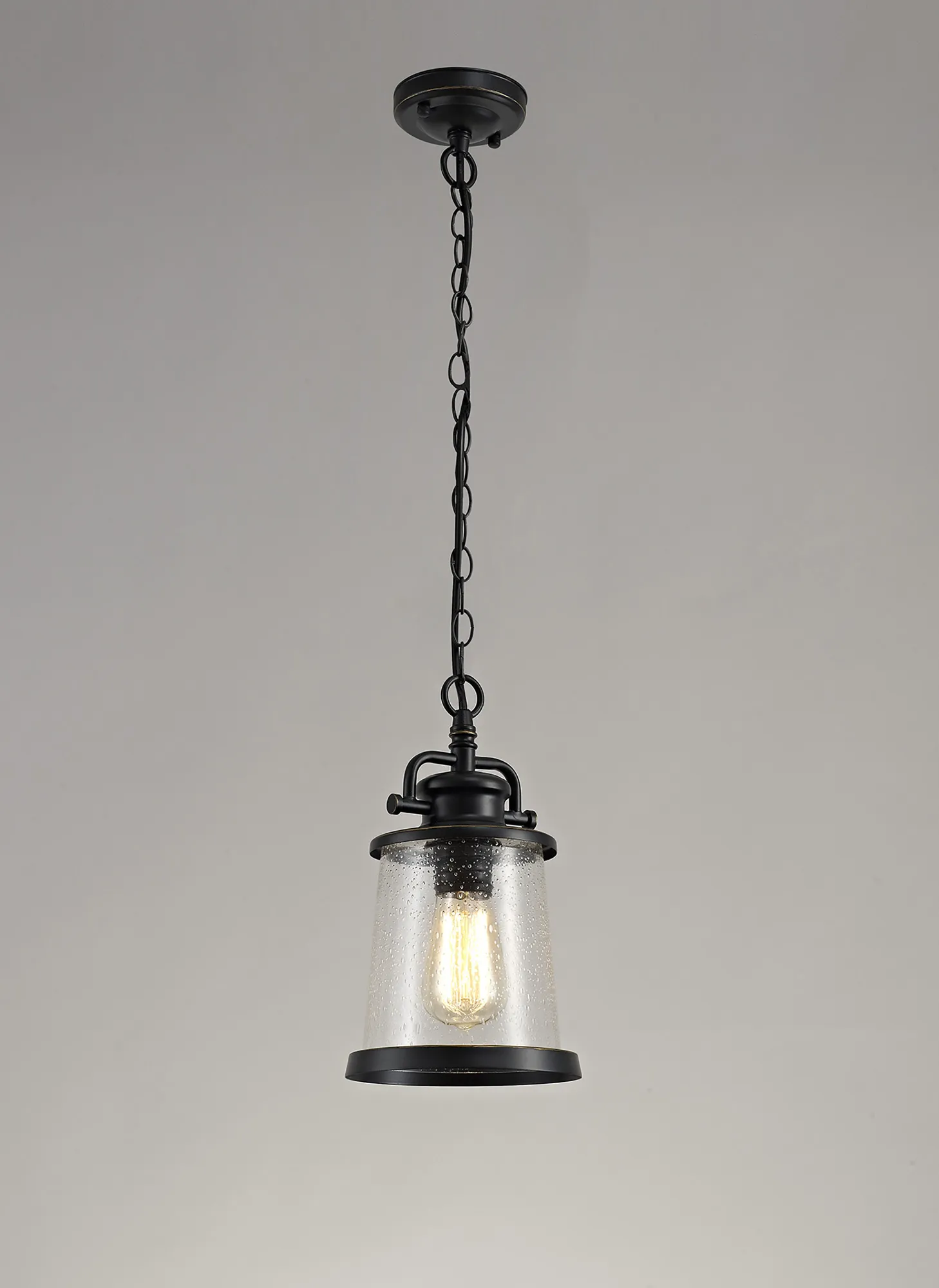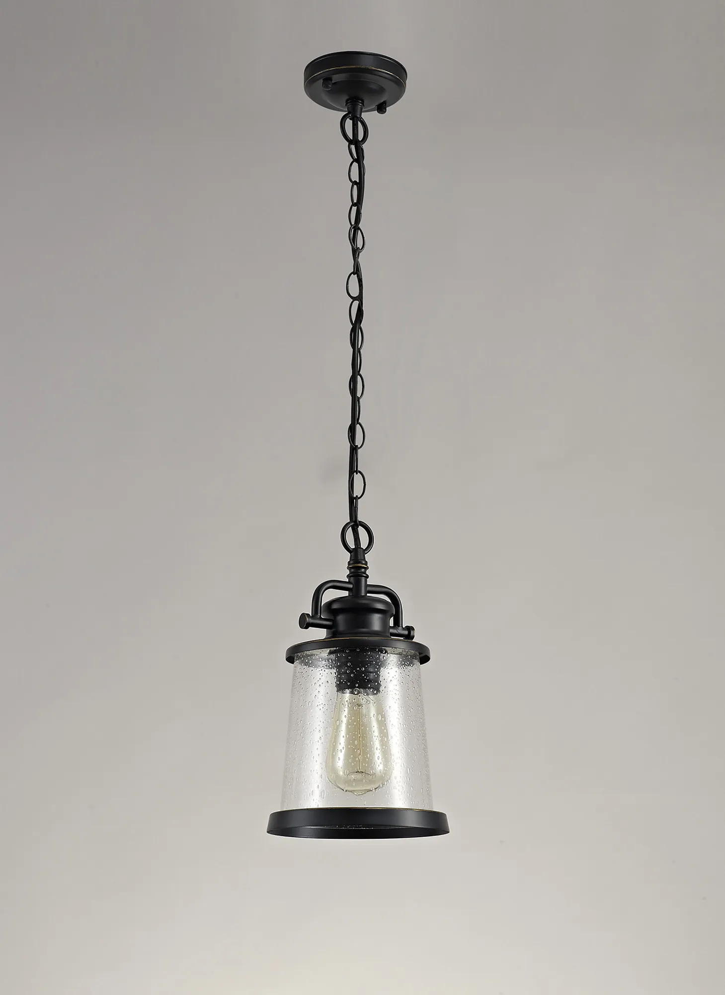This durable IP54 rated collection houses E27 lamp holders within a bell shaped frame finished in a black/gold colour, coating the metal framework. The character of this range is furthered by the clear glass, moulded with small seeded bubbles to mimic fine raindrops, an ingenious feature for an outdoor lighting range. A single pendant or wall lamp from the Manurewa range are sure to enhance an outdoor leisure or work area.