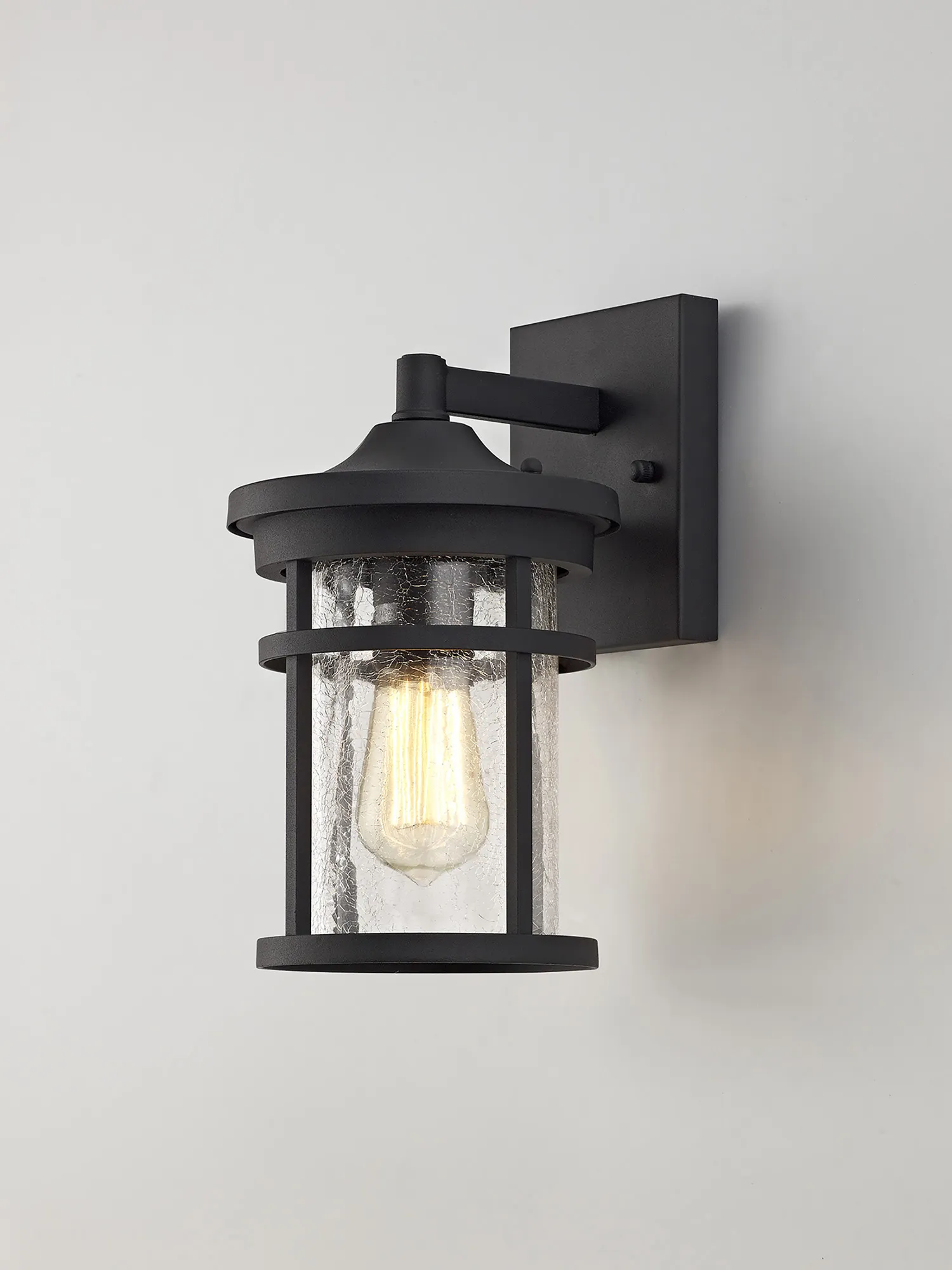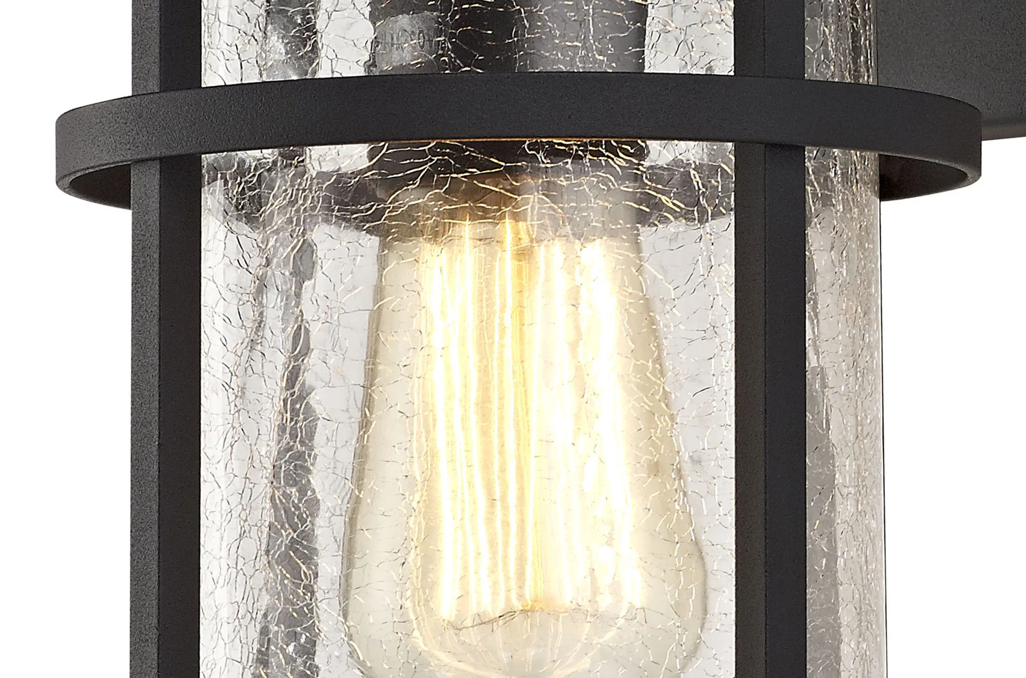 The most captivating feature of this IP54 outdoor collection is the crackled effect of the clear glass embedded into the black iron framework. This distressed feature offers a unique filtration of light from the E27 lamp holder resulting in an attractive visual. The replicated lantern concept is seamlessly offset against the rustic glass to amplify an antique traditional presence ideal for gardens and outdoor seating areas.