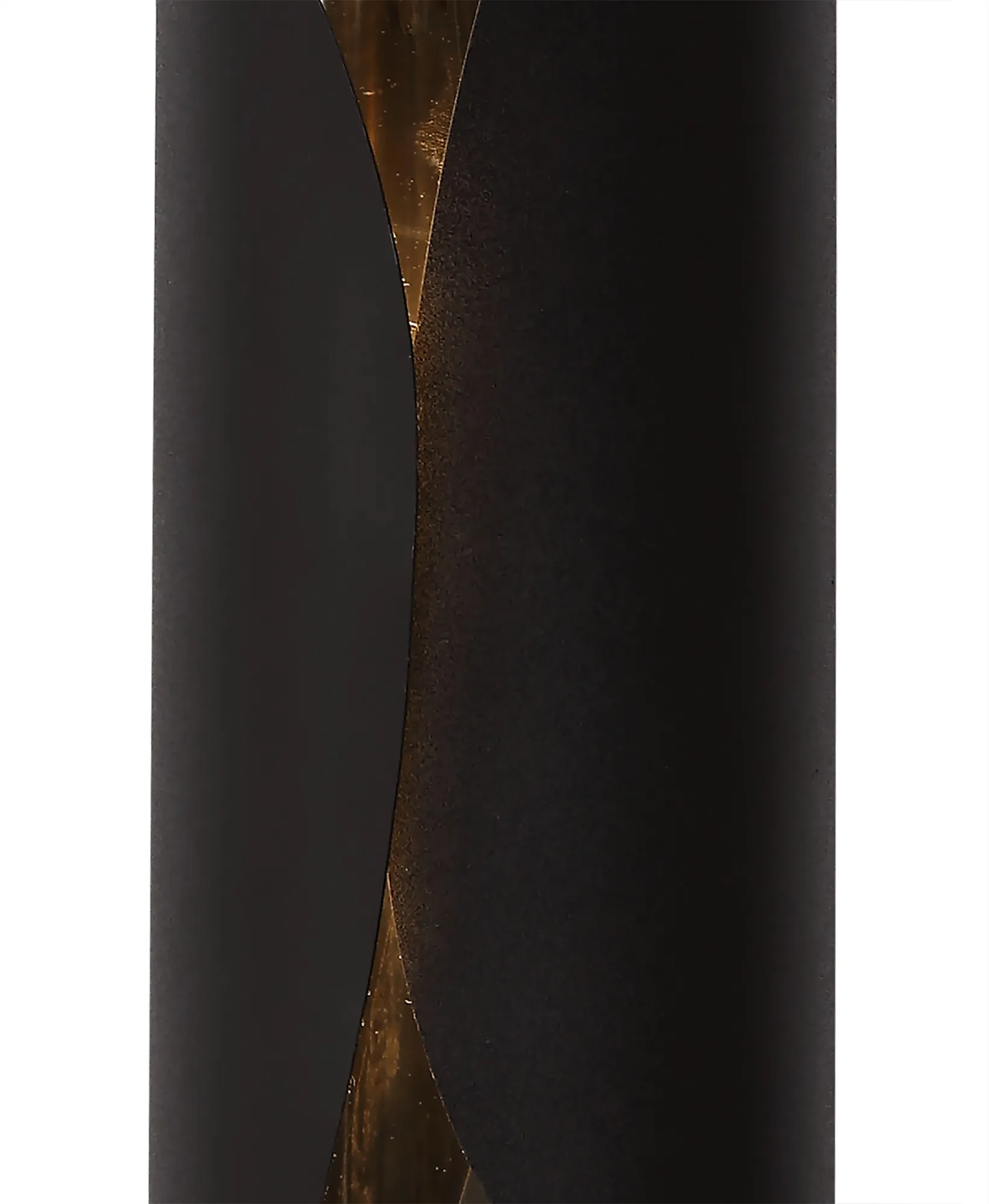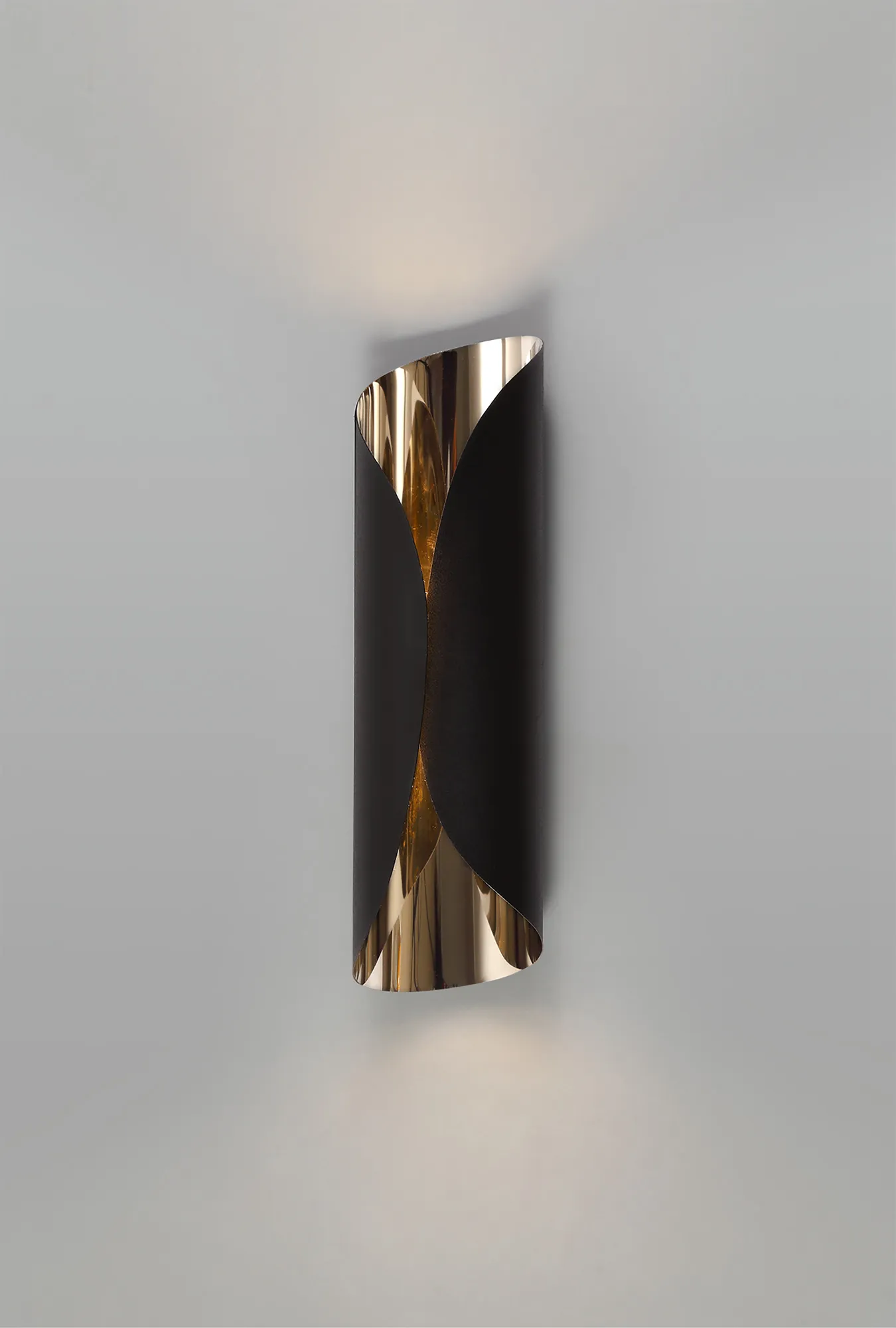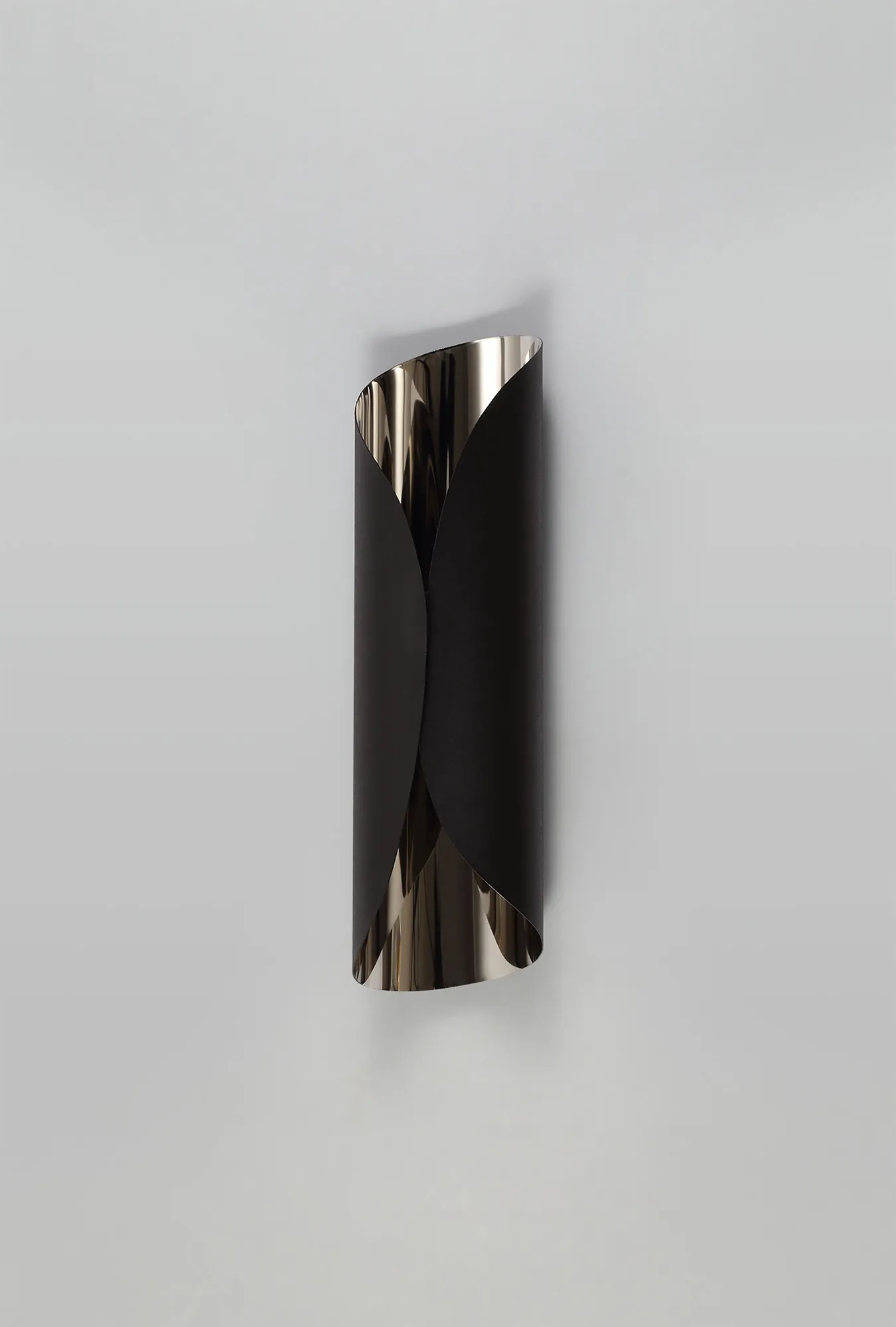 The metal plating of the Masterton LED wall lamp is rolled into a curved overlapping shape creating an original housing for the integral 3000K LEDs. Available with an outer colour finish of either sand black or sand white, the inner coating of both wall lamps is a highly polished chrome, supplying a further augmentation of light reflection.