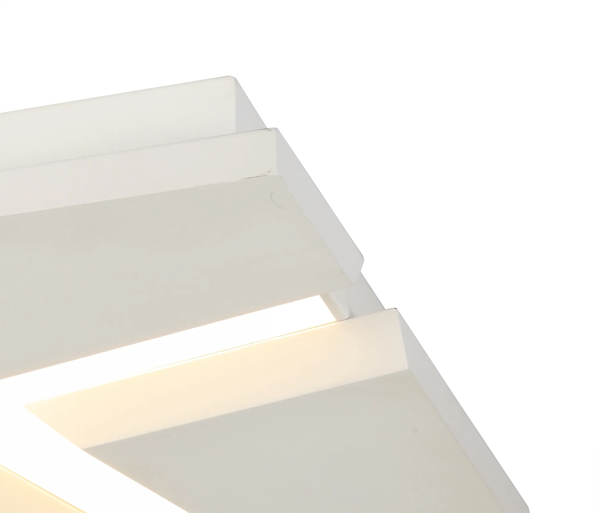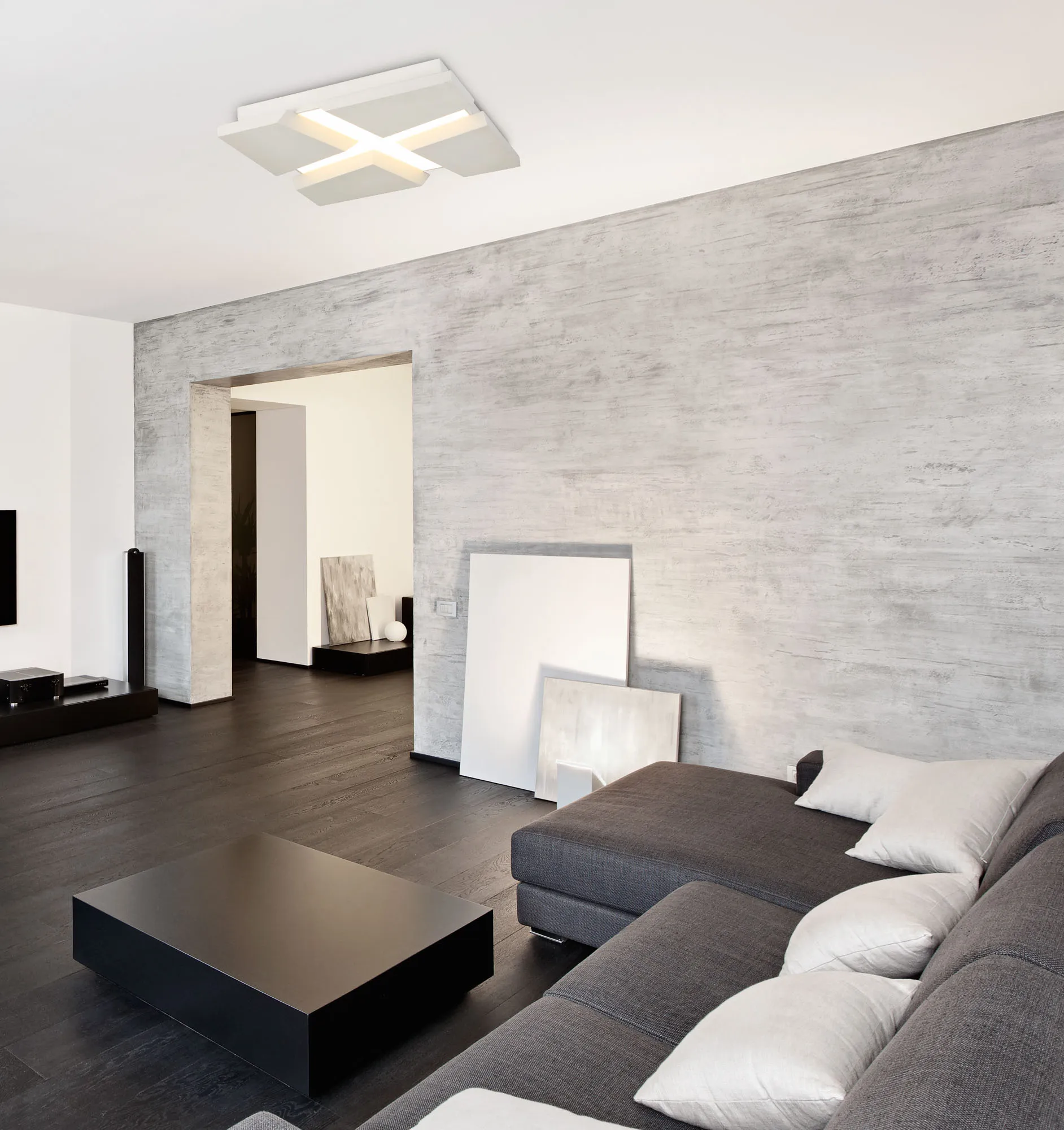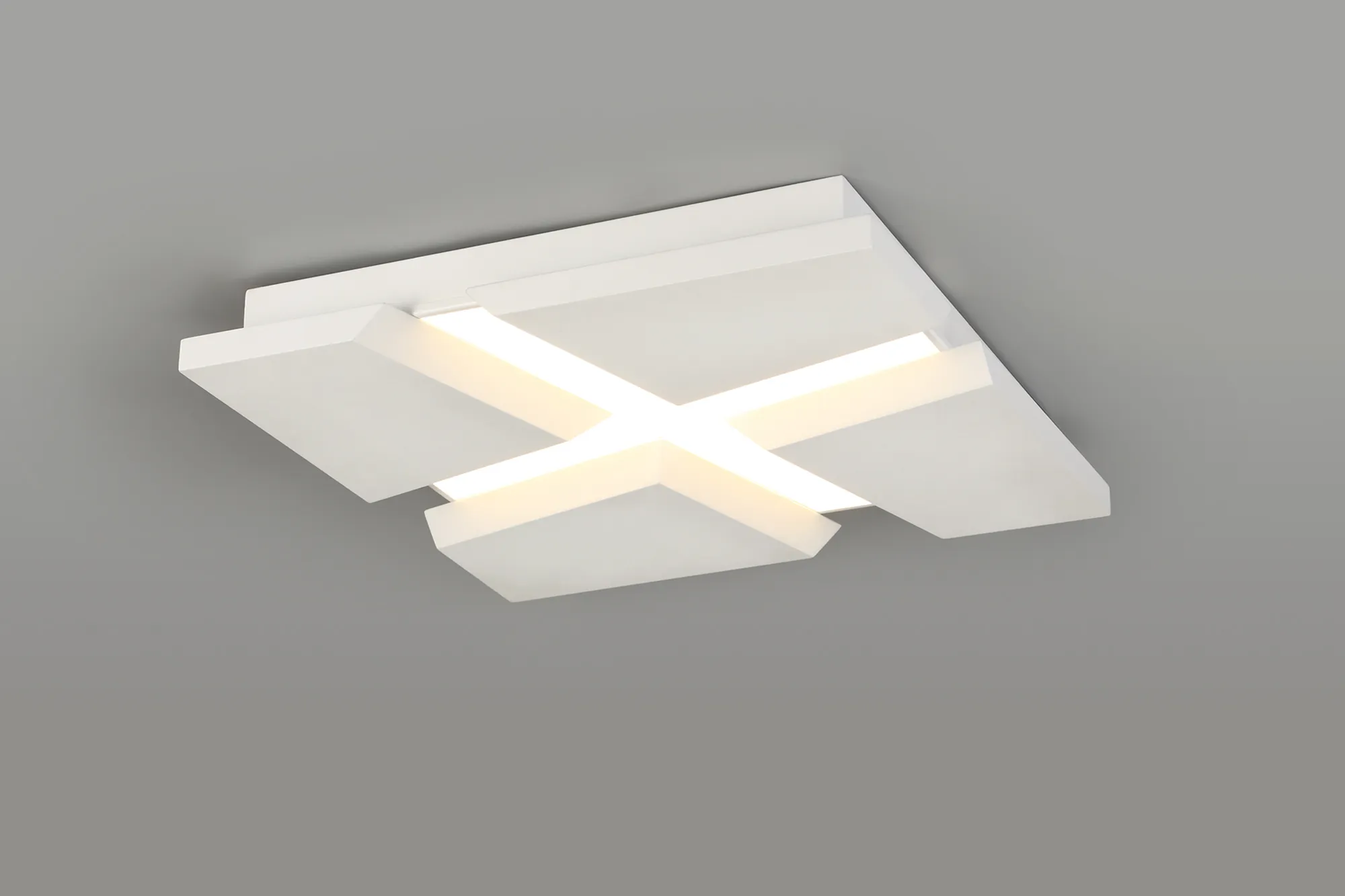 Levin is a high powered 50W 3000K LED flush ceiling light which produces an impressive lumen output offering ample light in a low ceiling setting. Its edgy design has a square outline with a setback angled cross cut out to project the light from the integral LEDs. The sand white colour is the final finishing touch to this futuristic modern style.