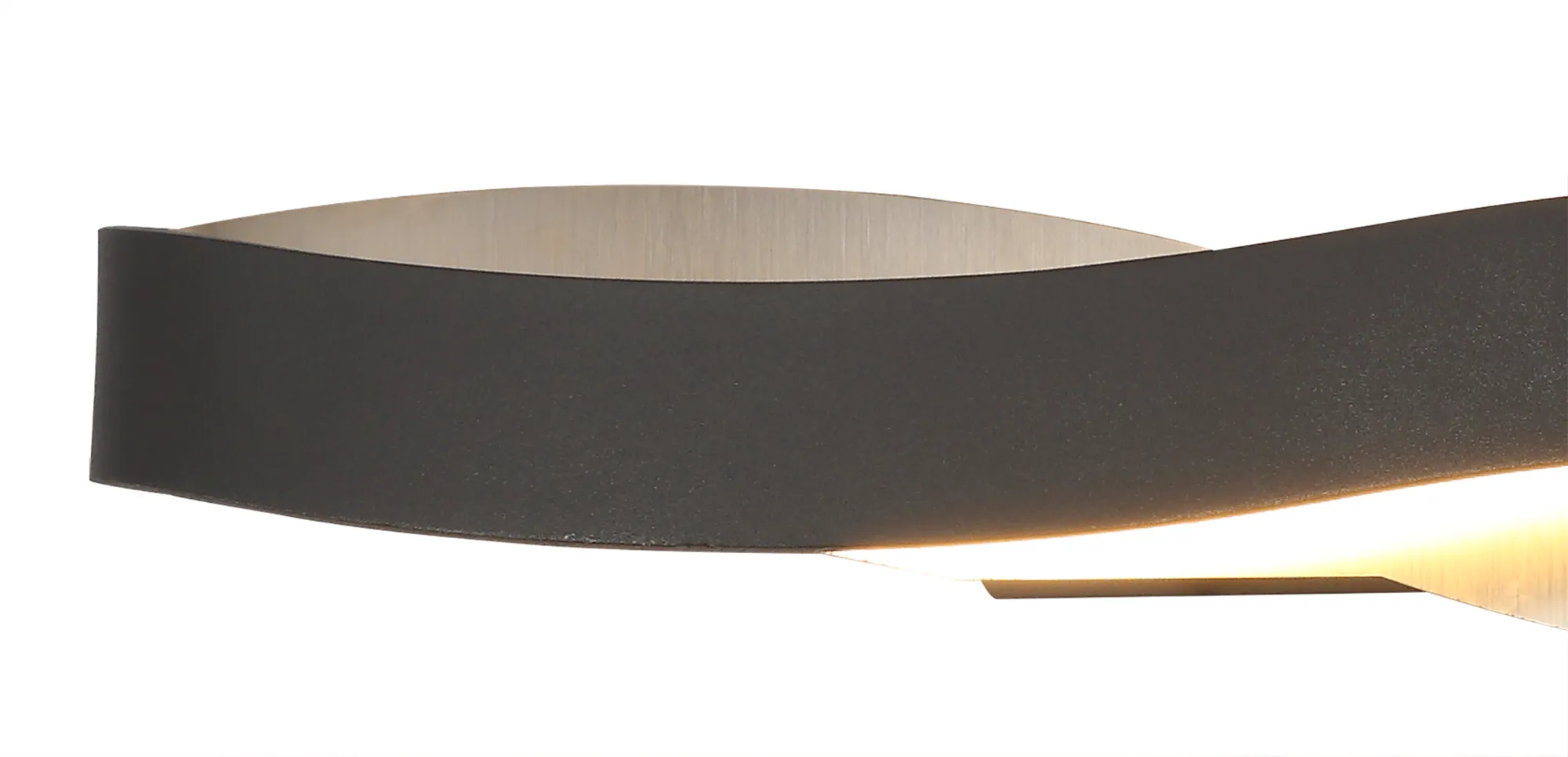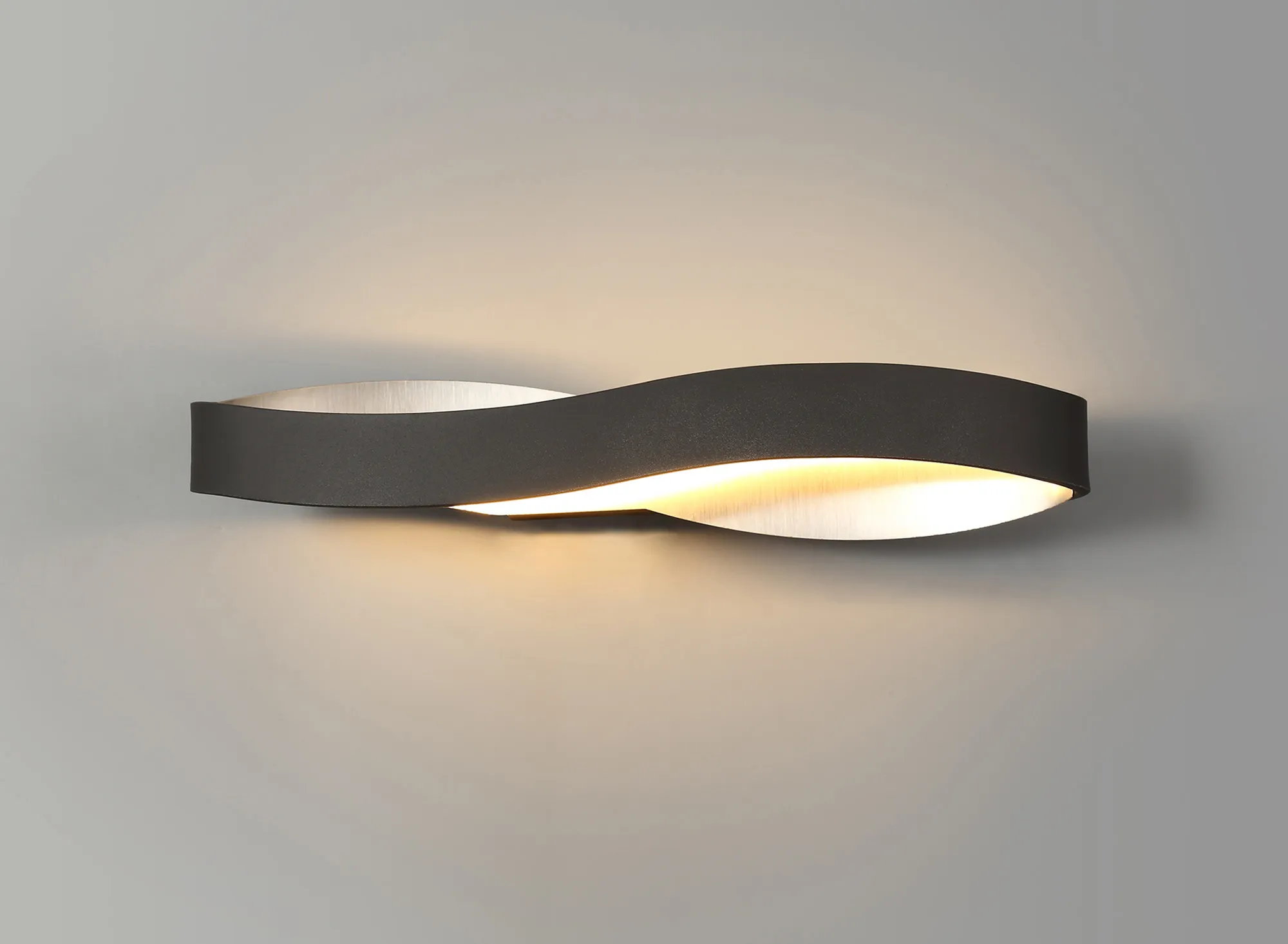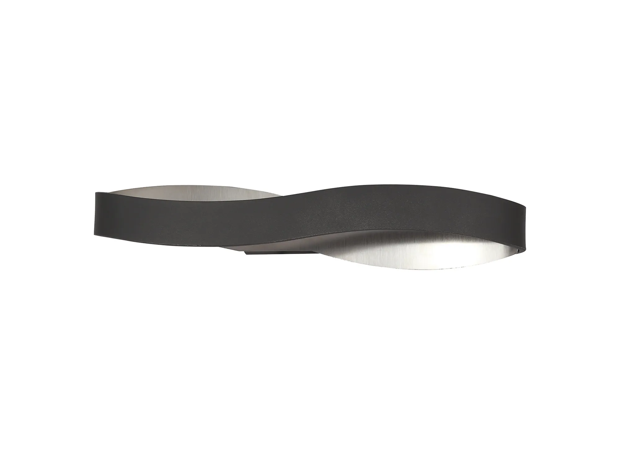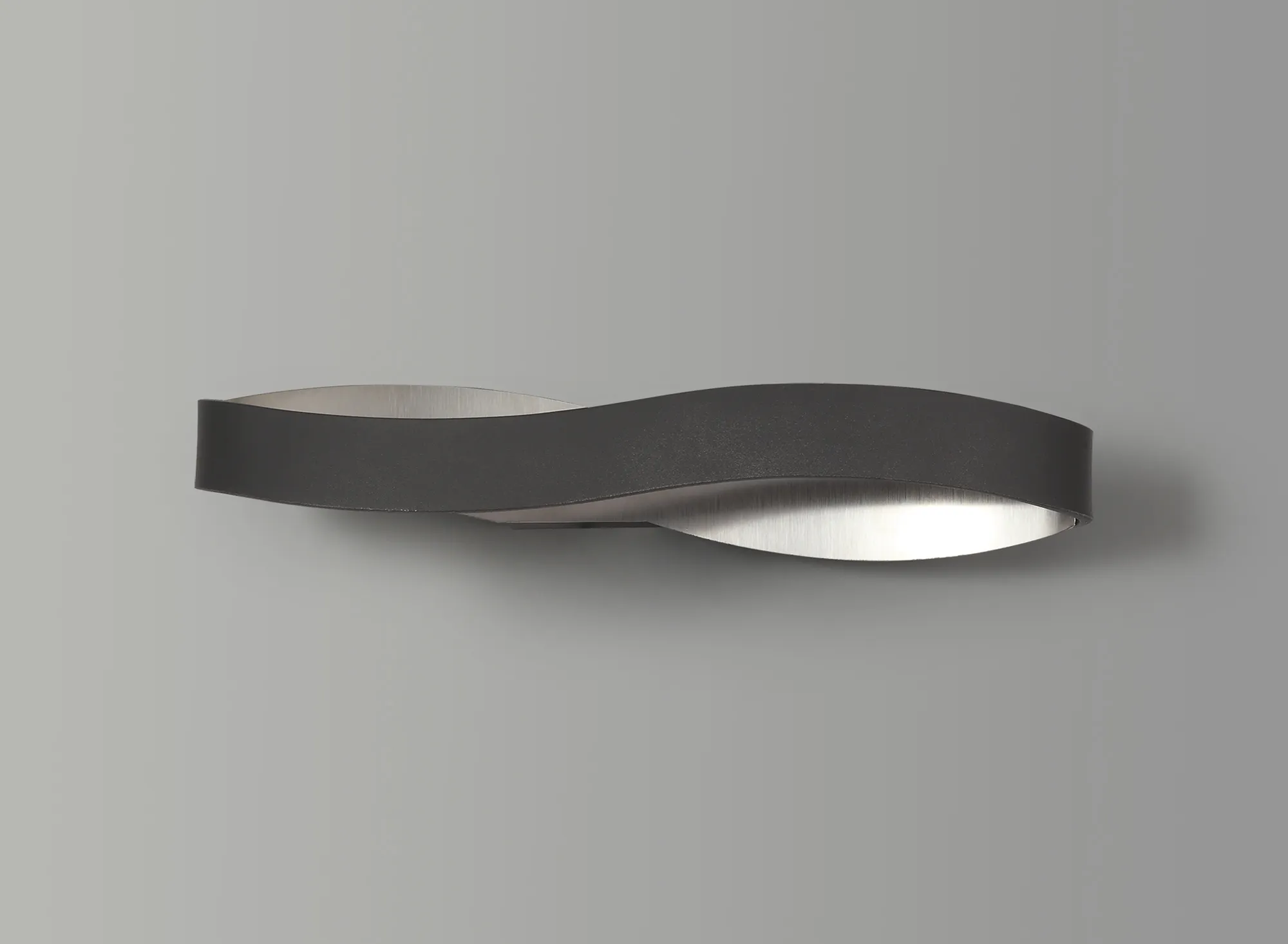 Parrs is a looped ribbon, band shape available in either a sand anthracite and satin nickel or sand white with polished chrome finish to form the ultimate modern wall lamp. The integral 3000K LEDs sit within the inside of the protruding frame which disperses the light in two directions through the fixtures open form generating a pleasing ambience.