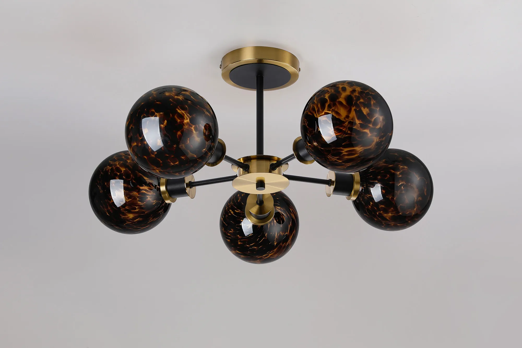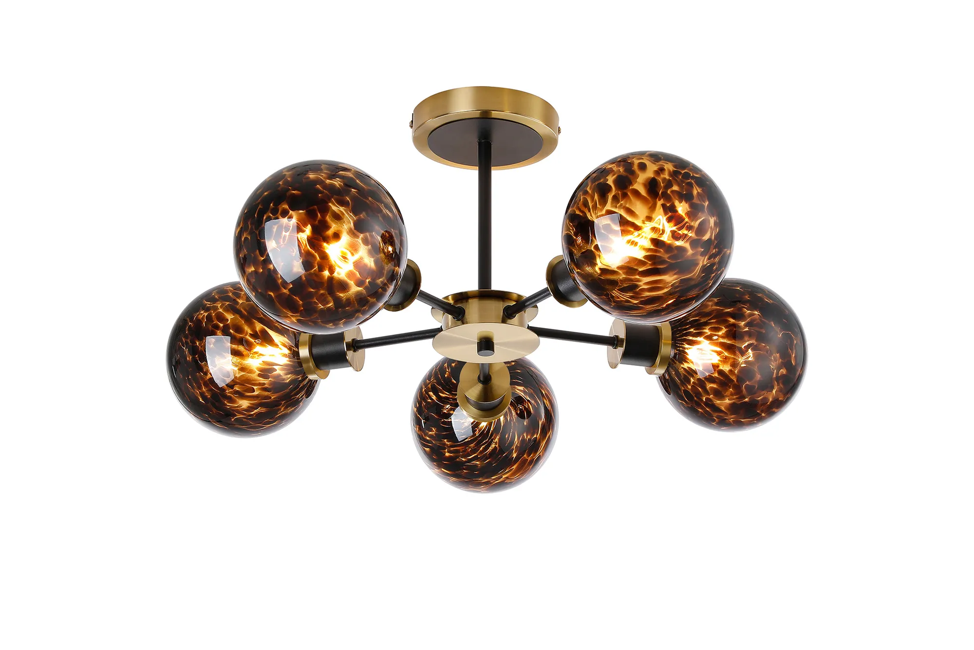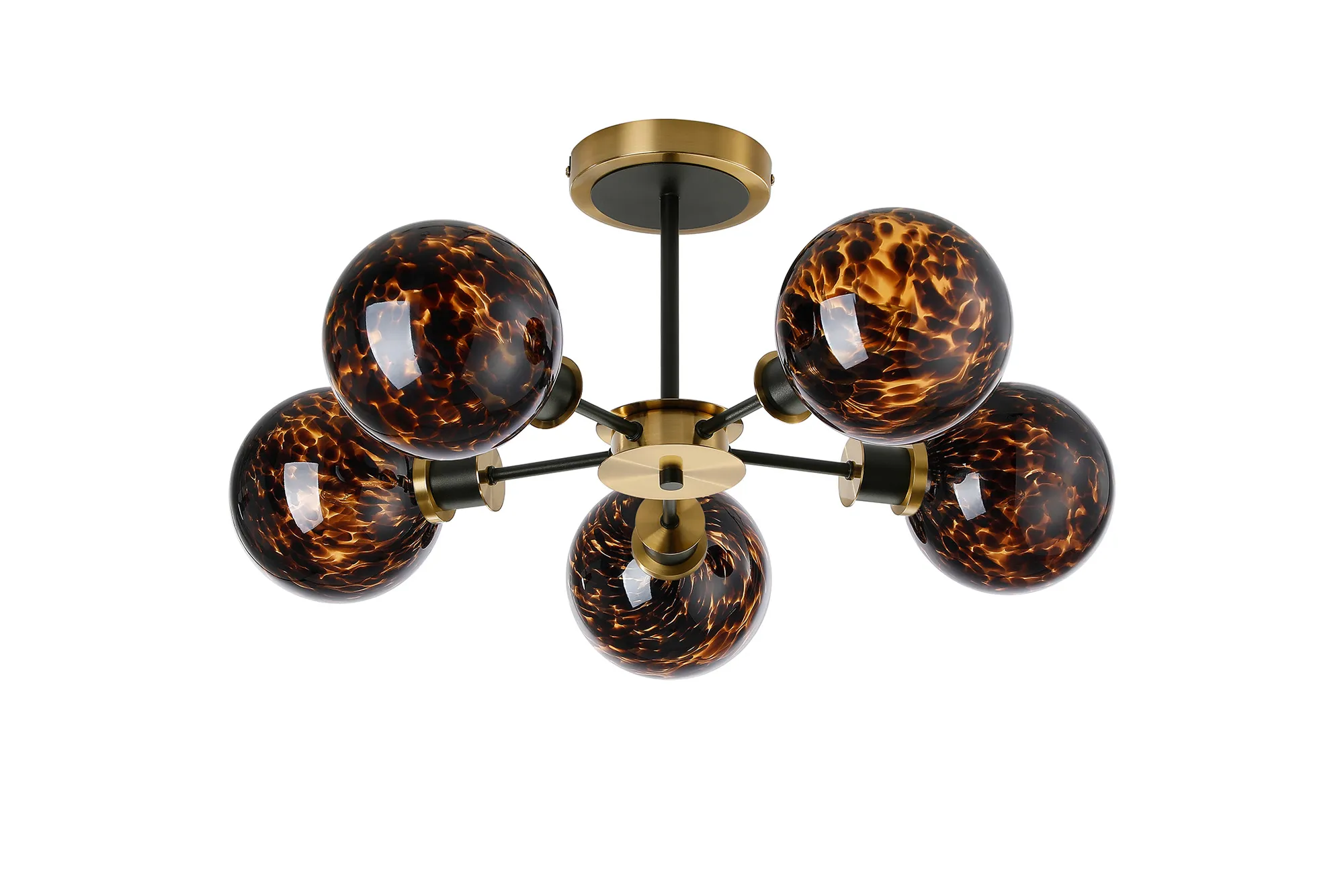 OTHER Fernie 52cm Semi Ceiling, 5 Light E14 With 15cm Round Brown & Amber Tortoise Shell Glass Shade, Brass & Satin Black