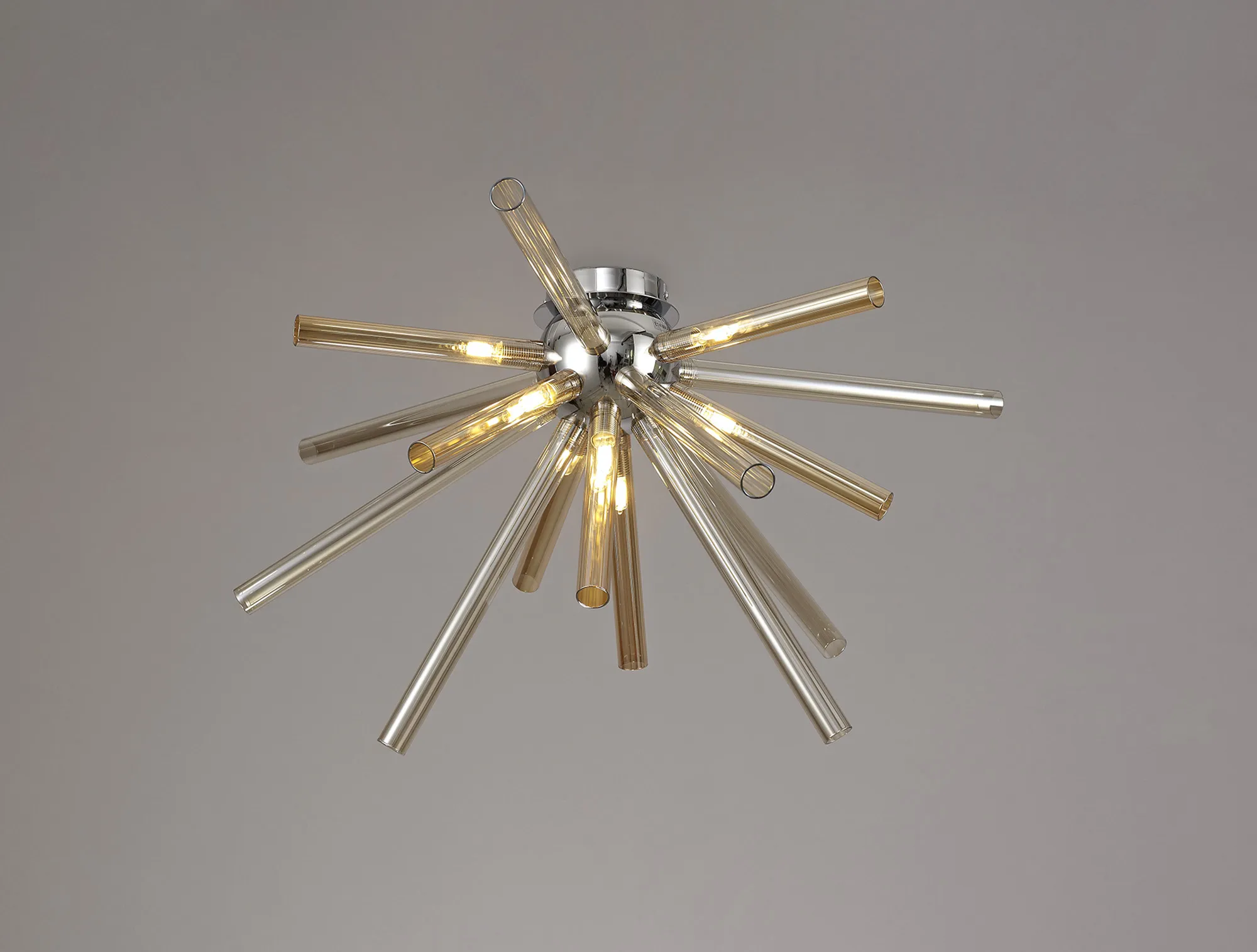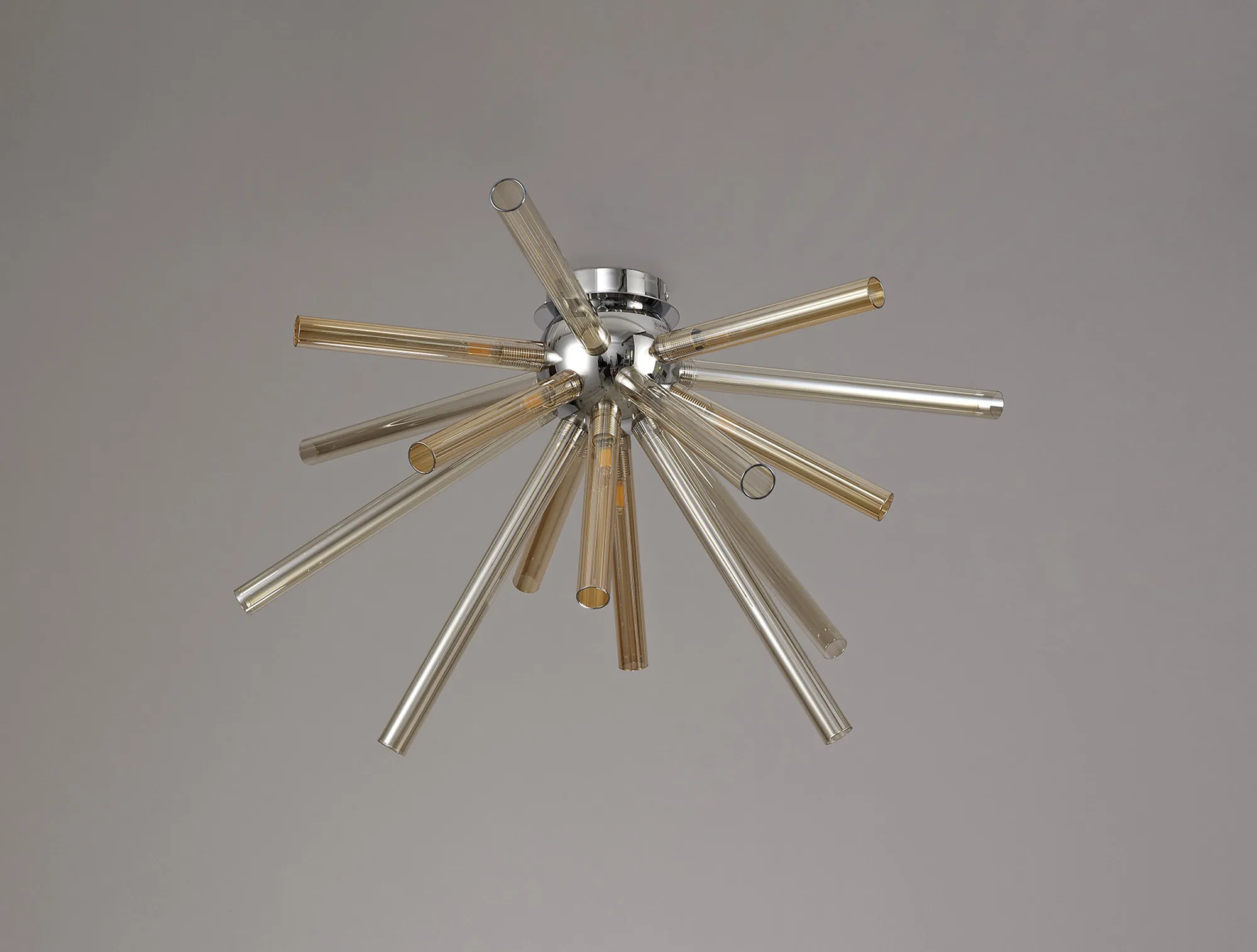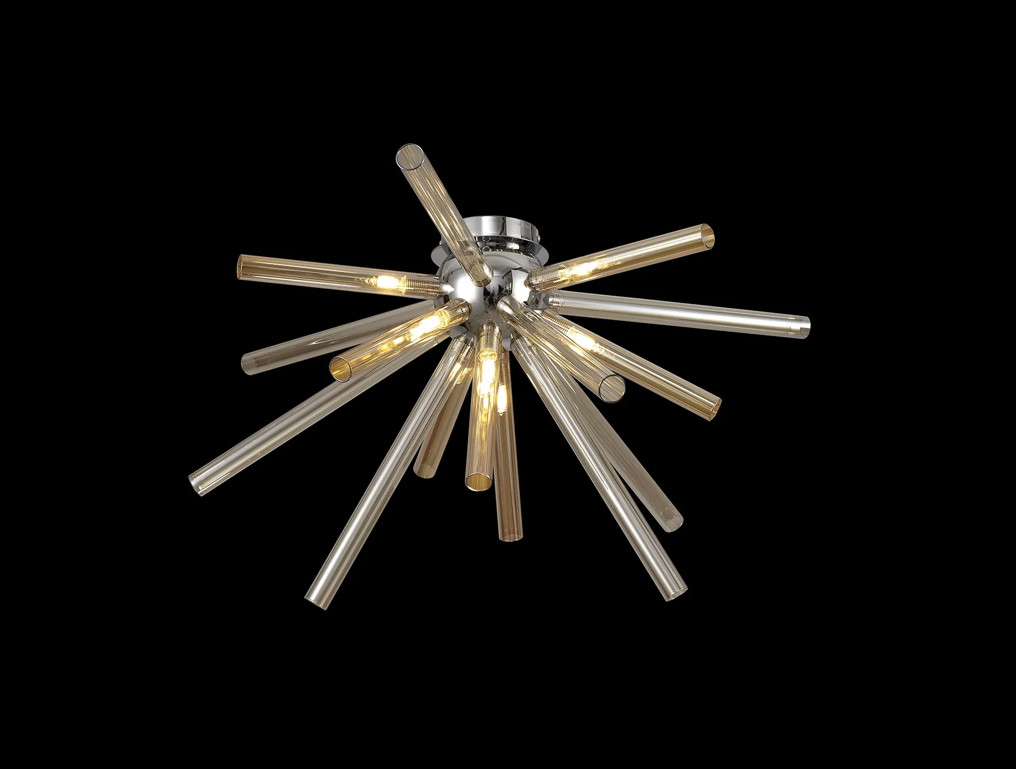 Parakai has an abundance of narrow glass tubes in various sizes which are cleverly arranged into a sputnik composition, devising a larger three dimensional effect around the polished chrome central orb frame. This statement design is applied to both a sixteen light pendant and an eight light semi-flush ceiling fixture, with each G9 lamp holder situated within the glass tubes. In order to supply an option for multiple colour schemes each polished chrome item is available with either amber/champagne, chrome/clear or smoked frosted glass pieces.