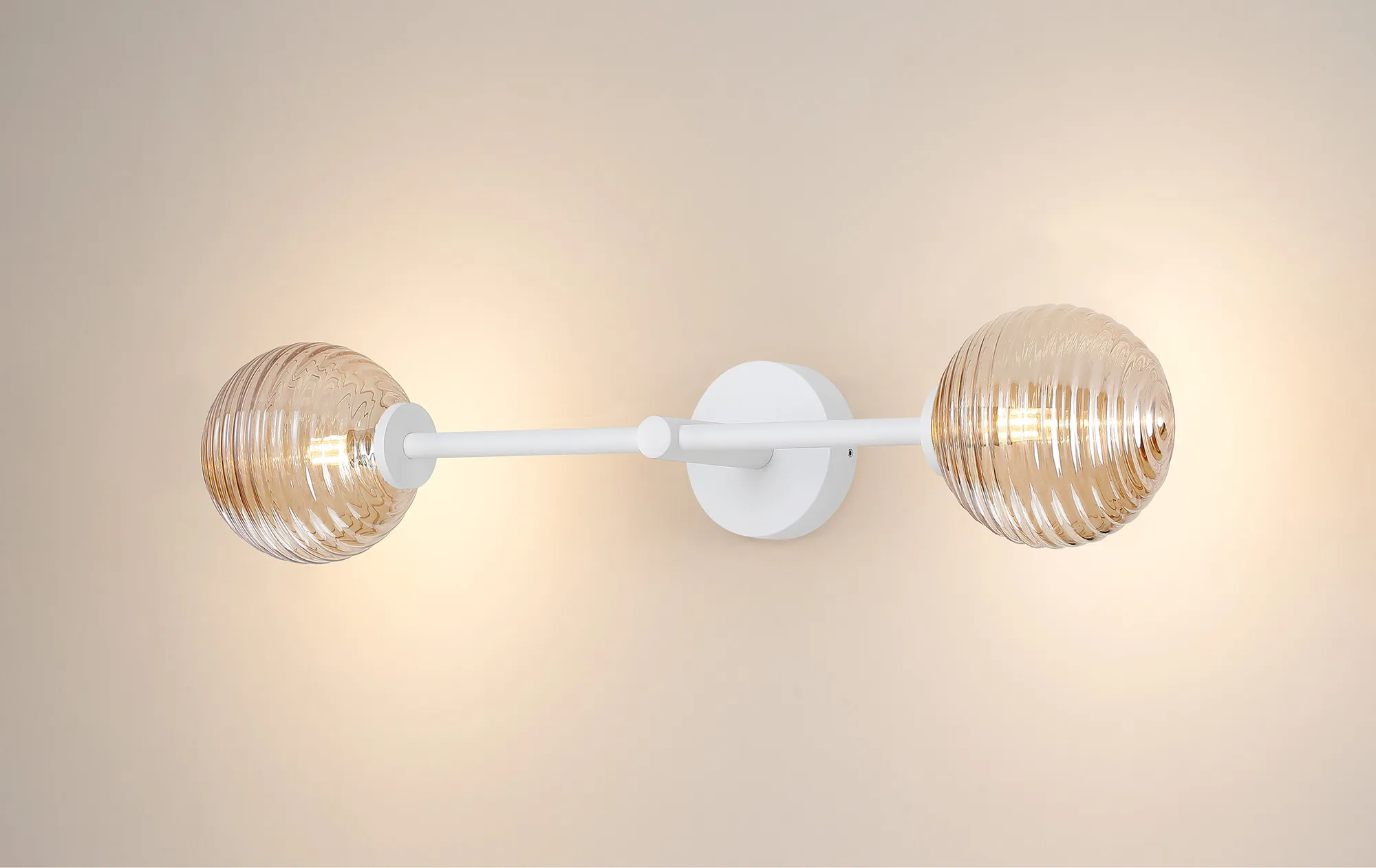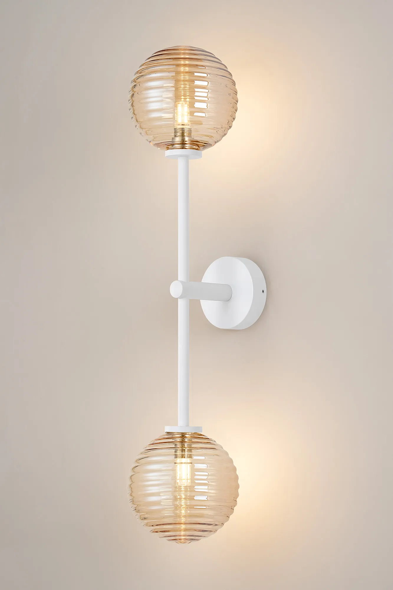OTHER Nova Tall Arm Wall Light, 2 Light G9, IP44, Satin White/Amber Ribbed Round Glass