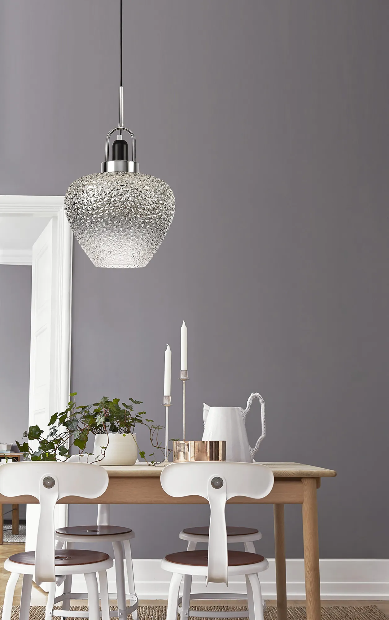 While the design of the singular pendant itself is simplistically traditional it allows the stunning glass shade to stand out as the main feature. Formed into an unusual brandy glass shape, Roskill provides a dazzling effect when illuminated through the three dimensional prismatic moulding which, when paired with the Smoke Plated to clear ombré finish, furthers the fittings discernible presence in any given setting.