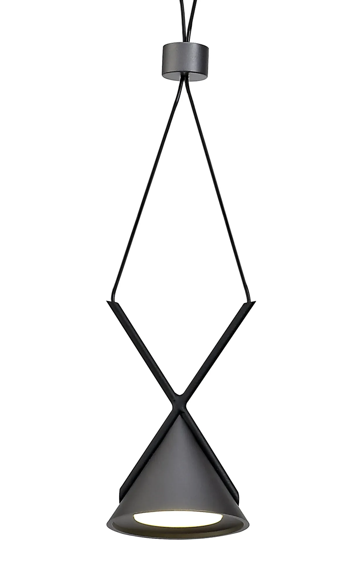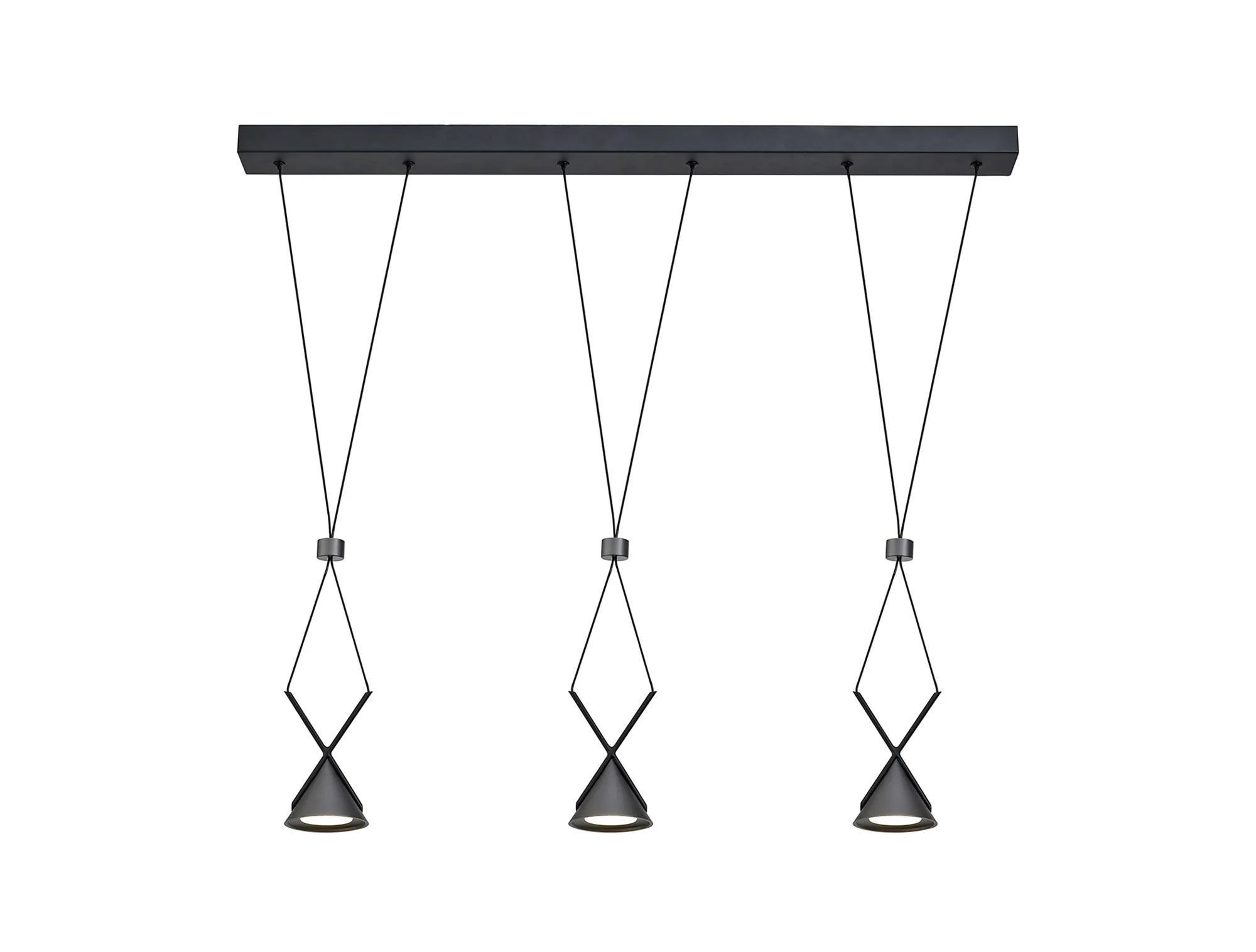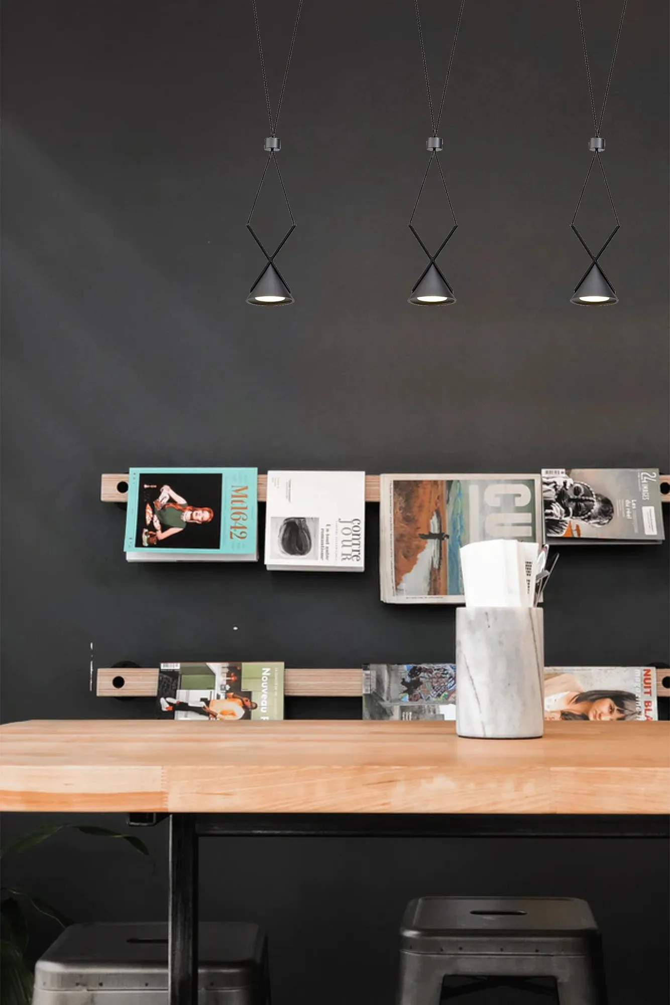 Auckland is a modern collection that uses a theme of triangular shapes, this range sits small cone shades which house the integral LEDs inside the bottom of a cross shape. The two suspension cables for each shade are held together by a small cylinder that can be slid along the cables to create shapes along the drop that seamlessly coordinate with the style of the frame. The three light linear pendant is perfect for use in a modern kitchen or dining room to be set above a table or worktop whilst the single pendant and wall lamps can be used to build feature in a living area.