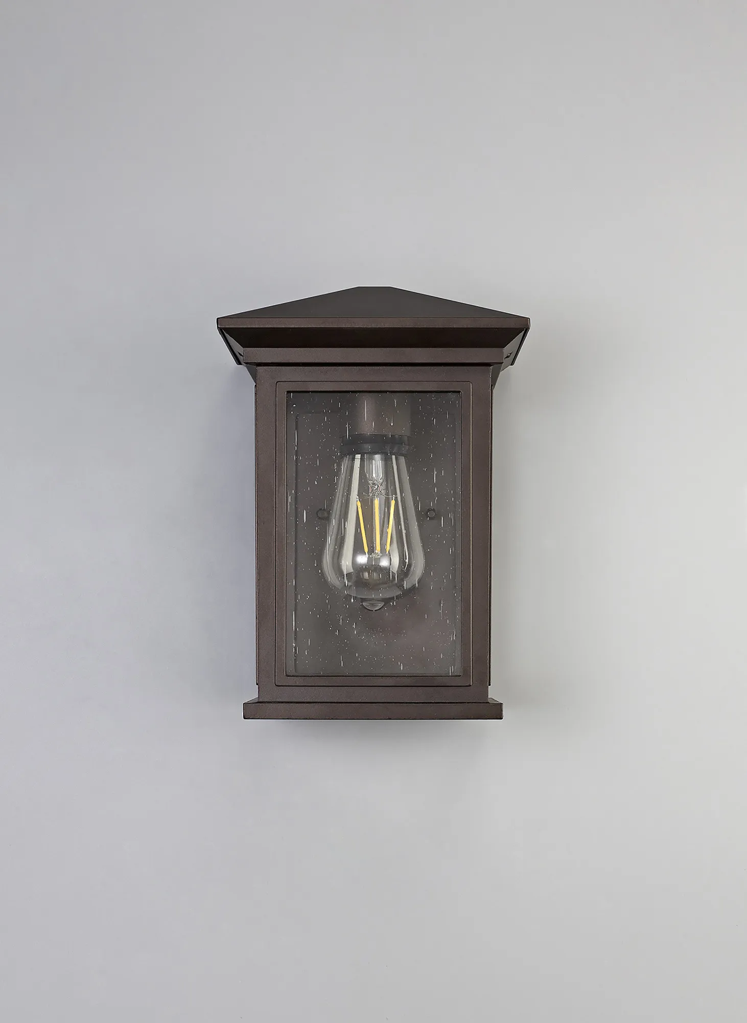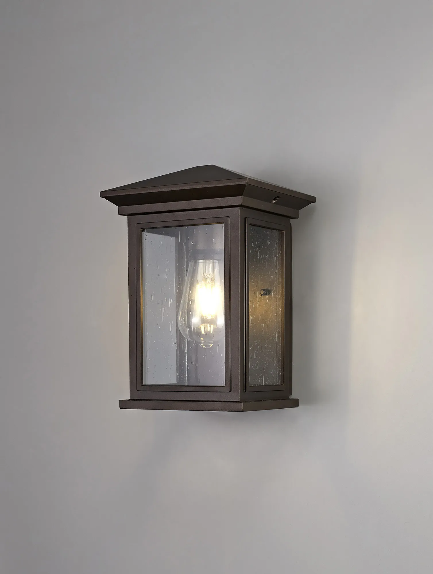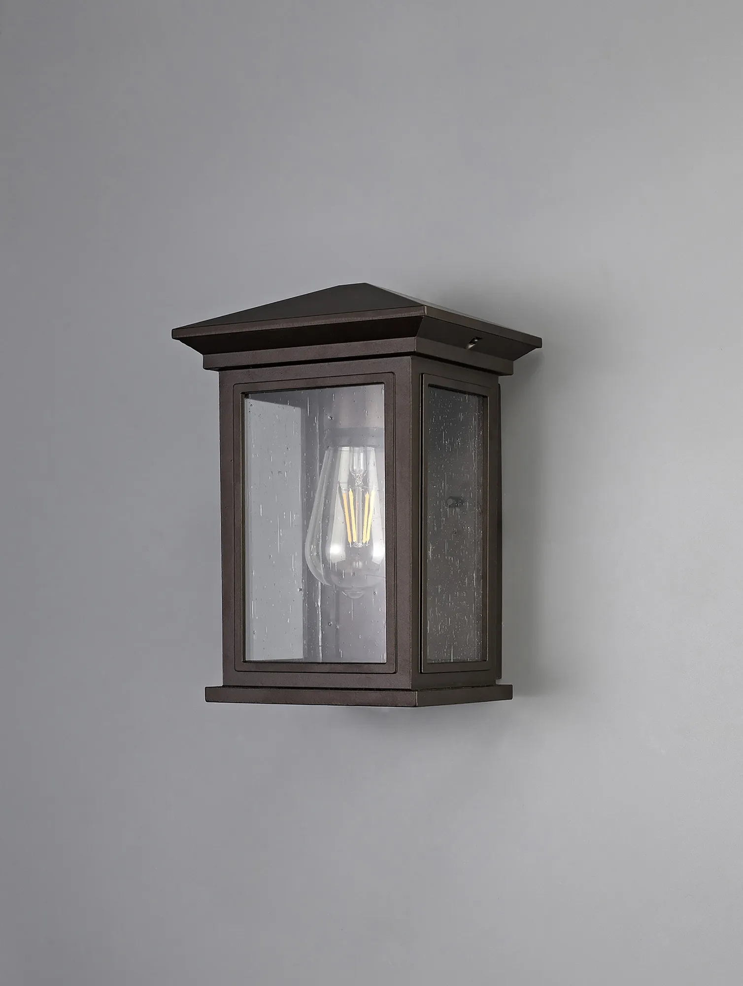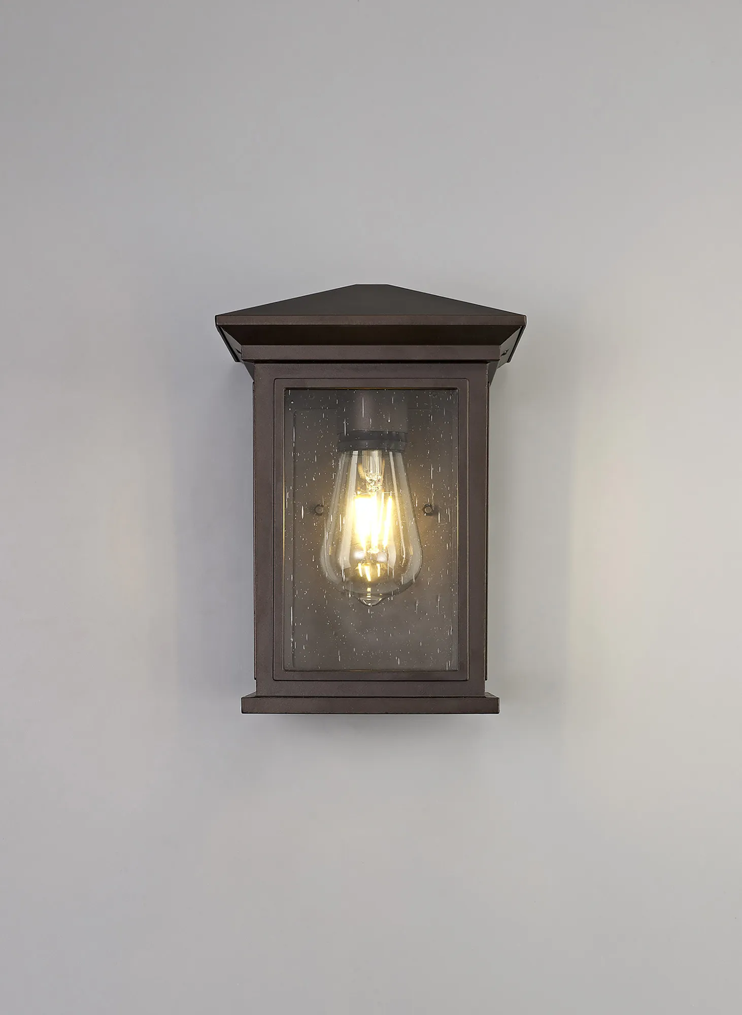 A trio collection of wall lamps, Westport combines design aspects from both glass display cases and vintage lanterns. Available in either an anthracite, antique bronze or silver grey colour finish the transparent glass panes clearly display the E27 lamp used, which is ideal when the fixture is being used along with a decorative lamp. With an IP54 rating the seeded effect of the glass subtly mimics raindrops, compatible for an outdoor fixture.