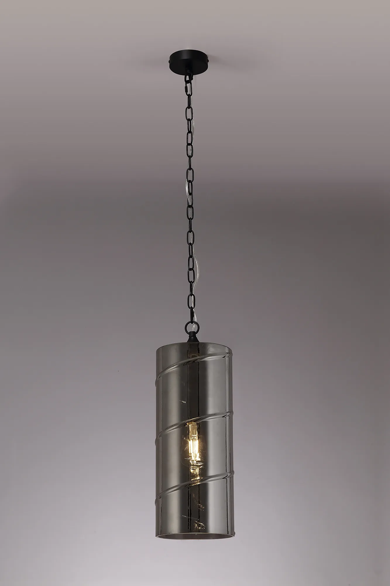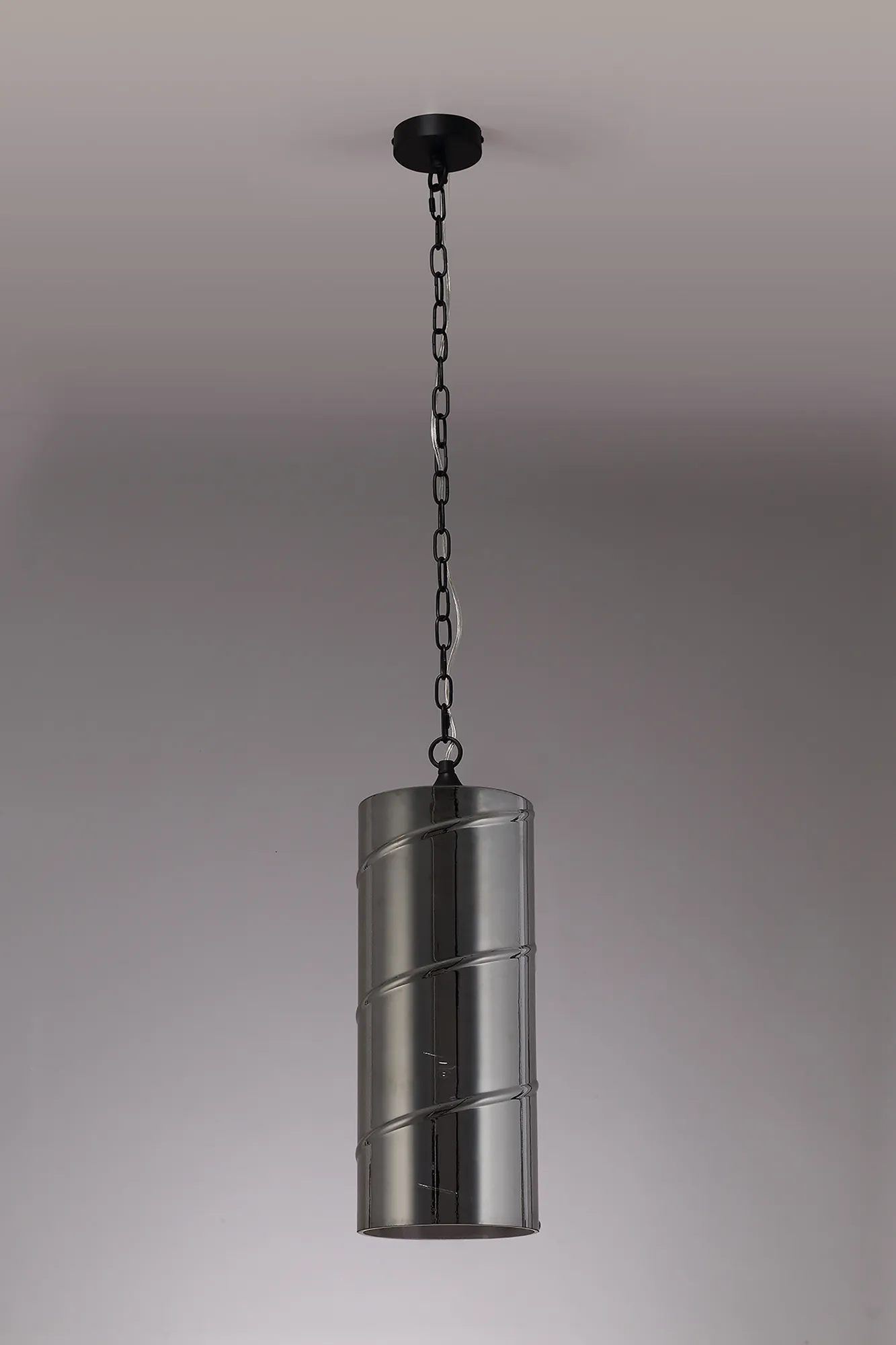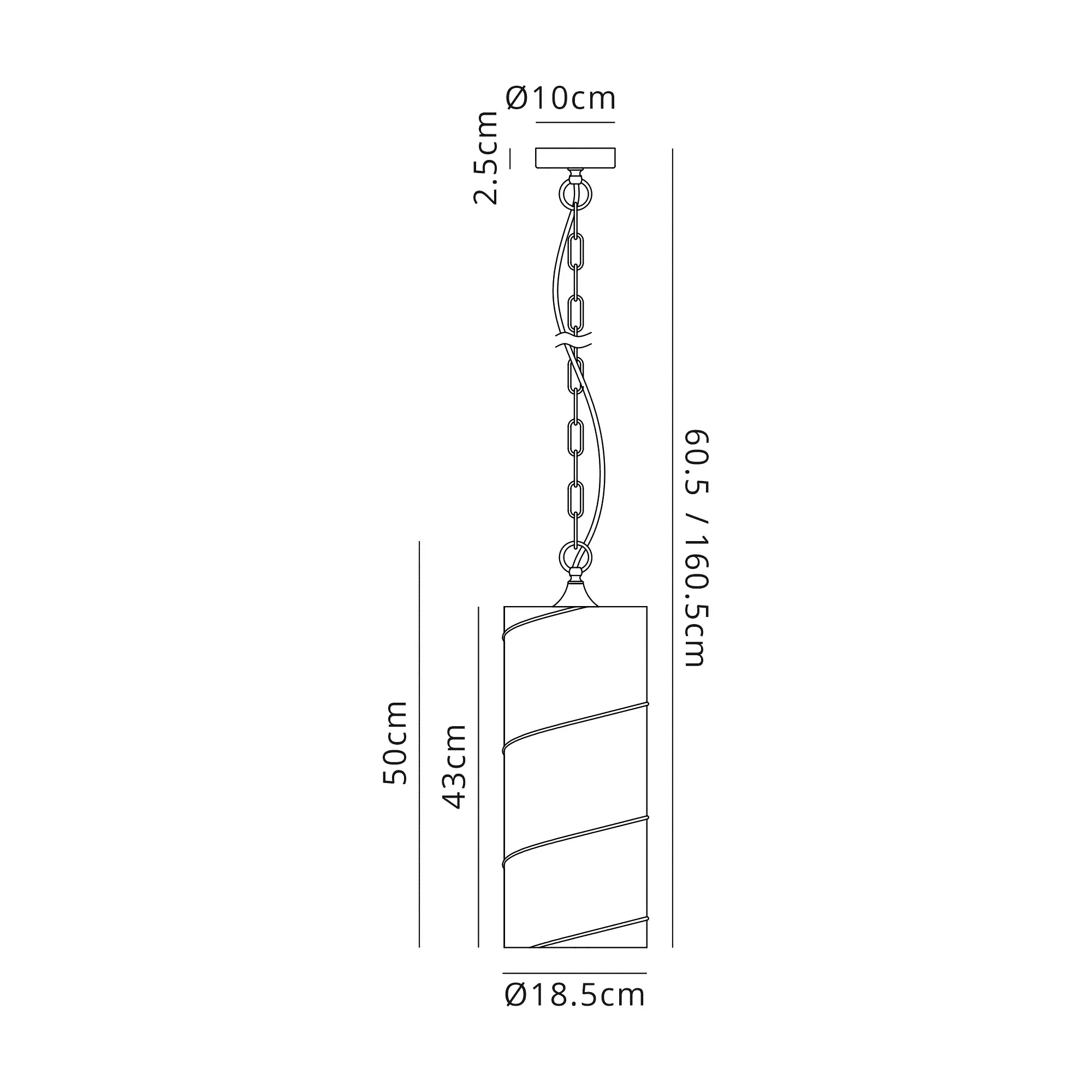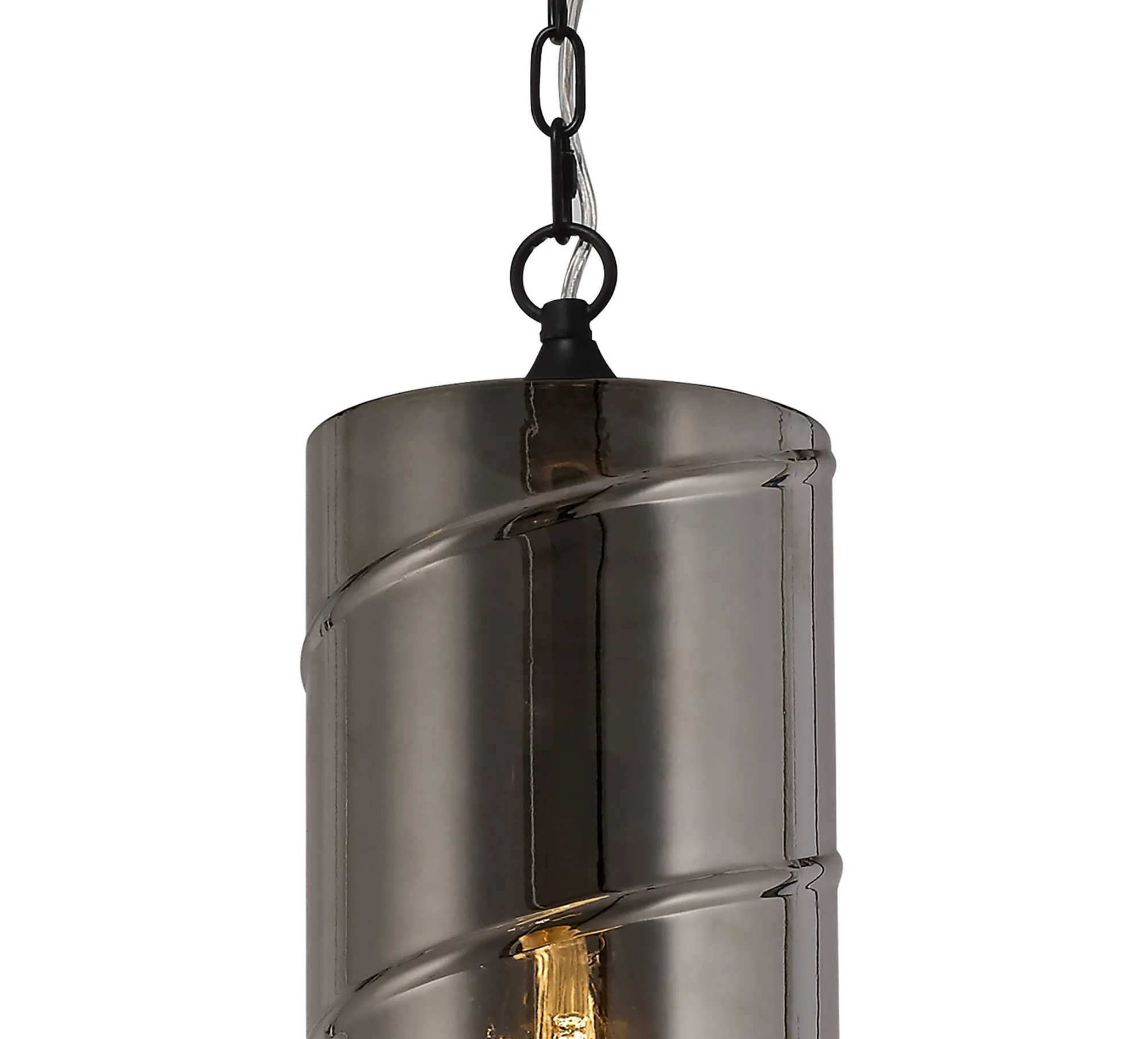 These cylindrical glass pendants present an inspired moulding creating a three dimensional spiral protrusion, extending around the shade. The three different frame colours available in the Ramsay range correspond the colour tint used for the glass itself; antique brass with amber glass, matt black with smoked glass or polished chrome with clear glass.