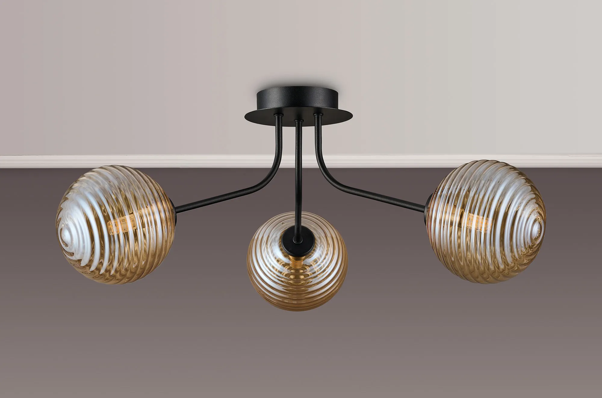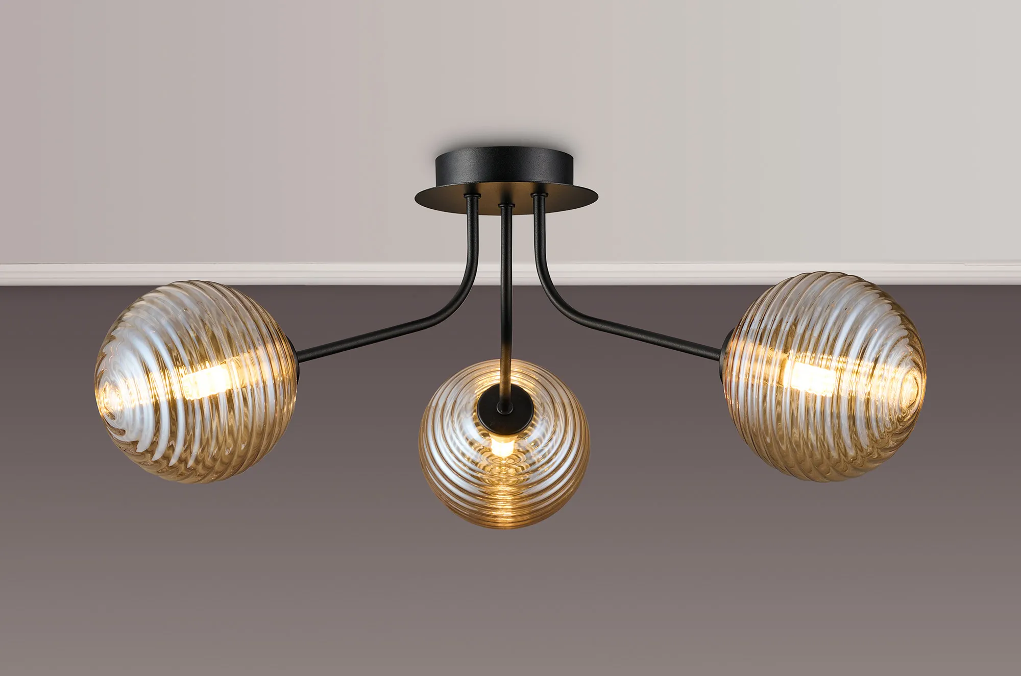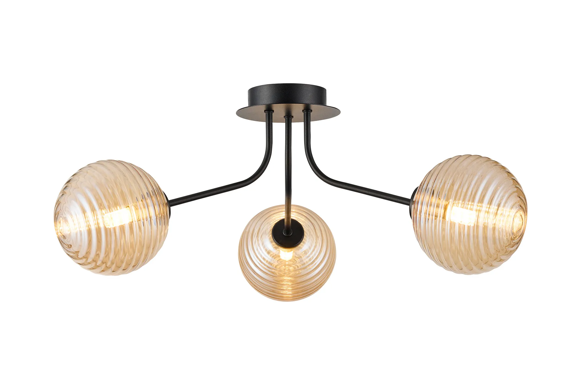 OTHER Duncan Semi Flush Light, 3 Light G9, Satin Black/Amber Ribbed Round Glass Shade