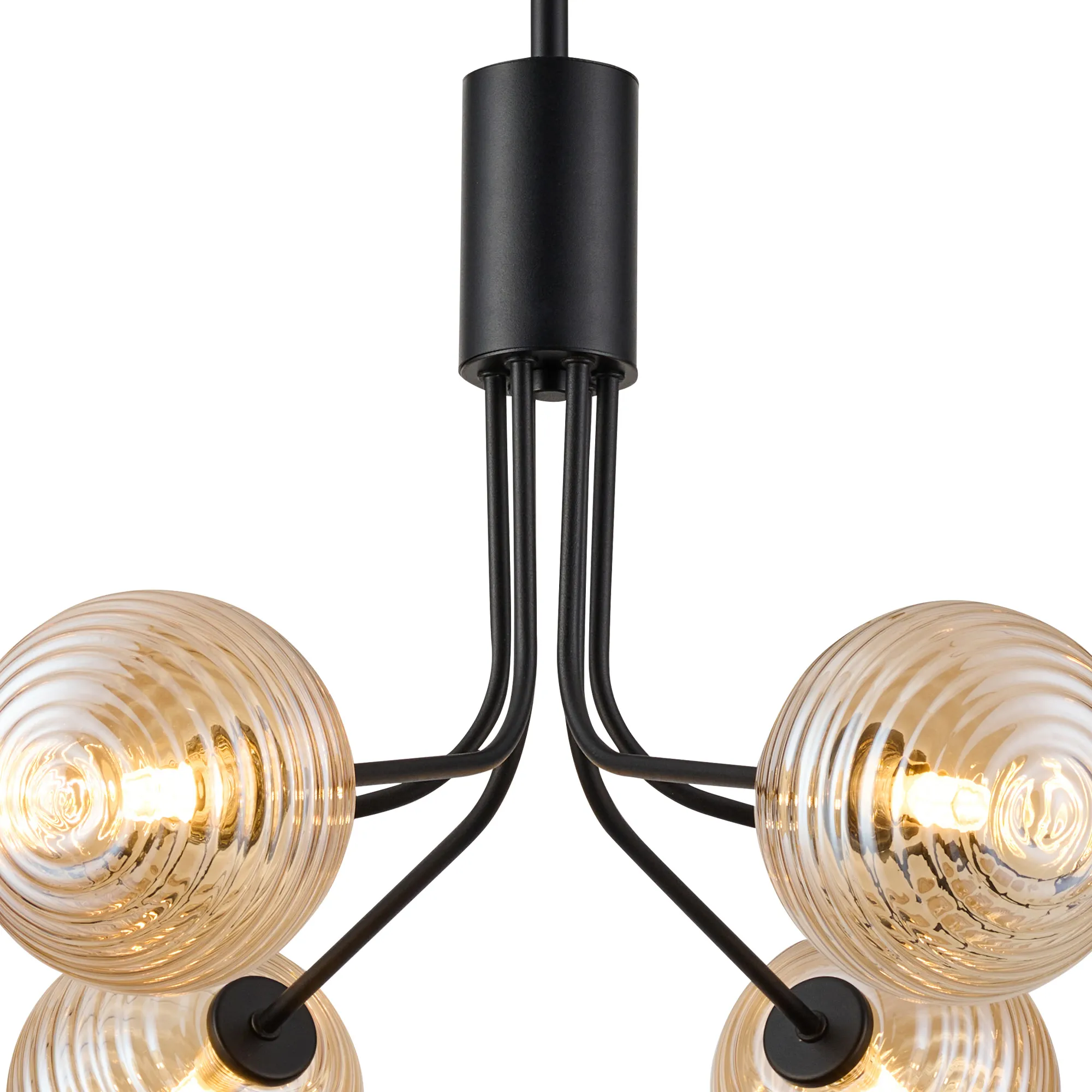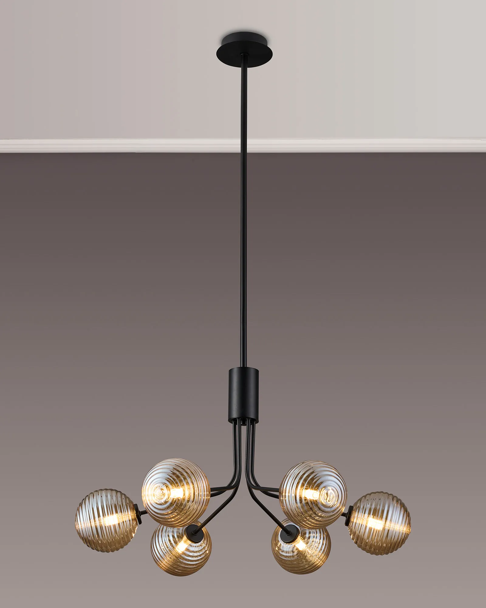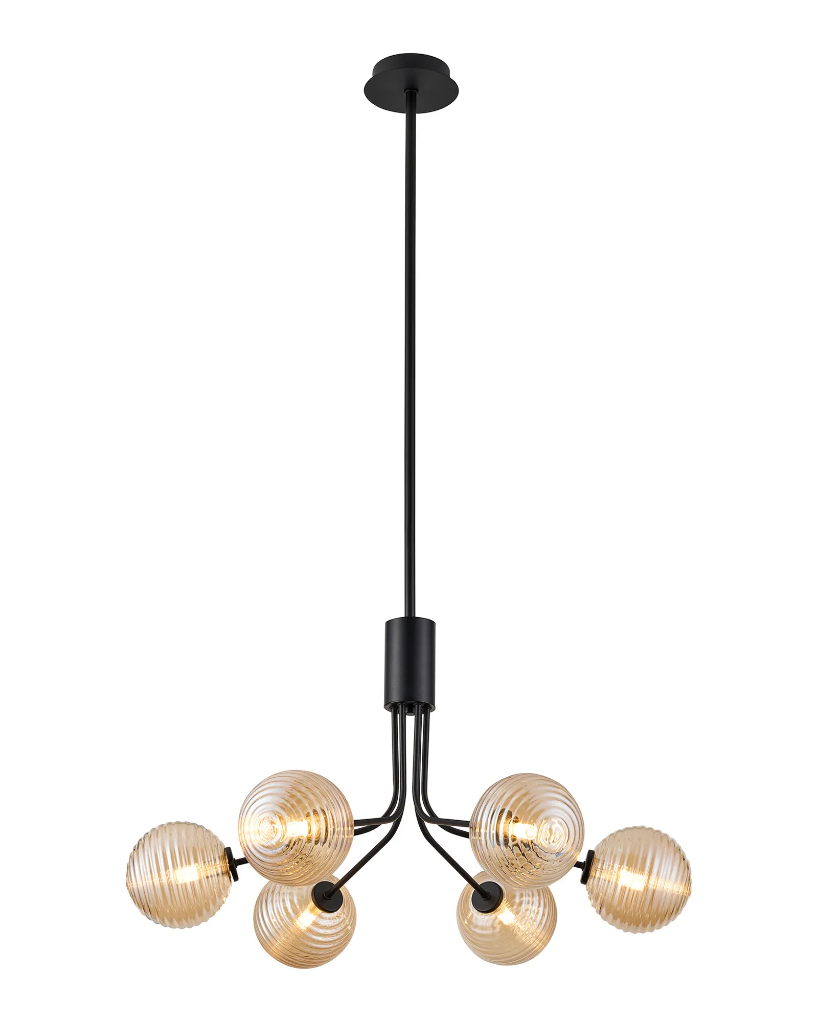 OTHER Duncan Fixed Pendant, 6 Light G9, Satin Black/Amber Ribbed Round Glass Shade