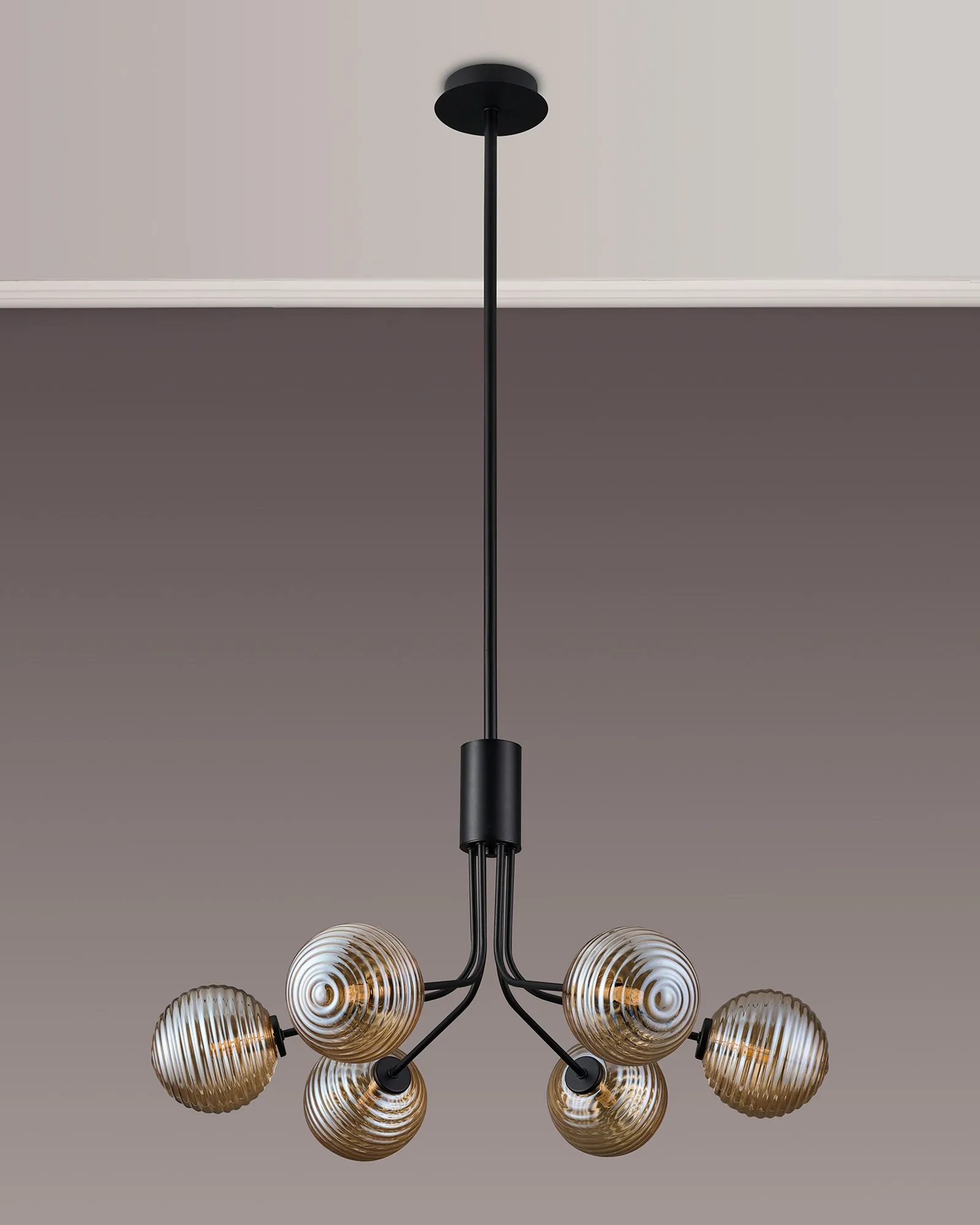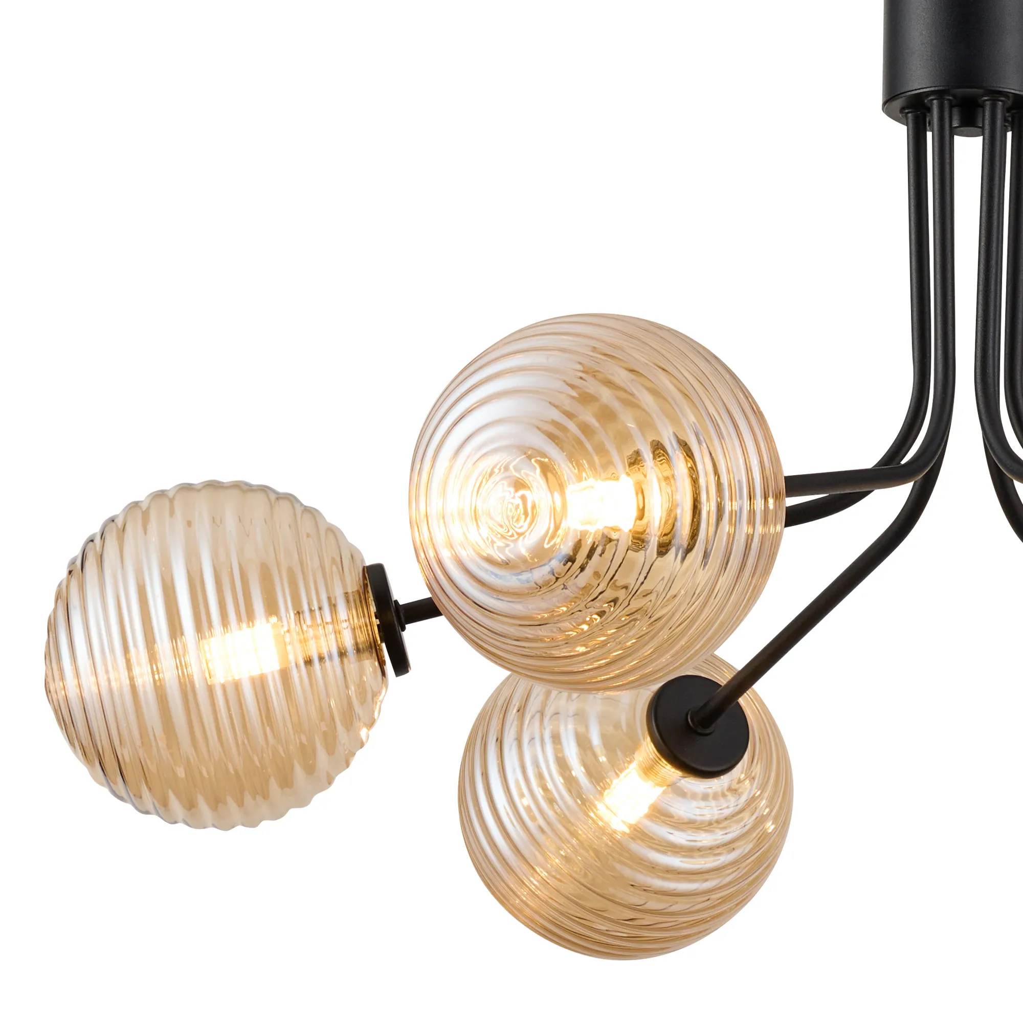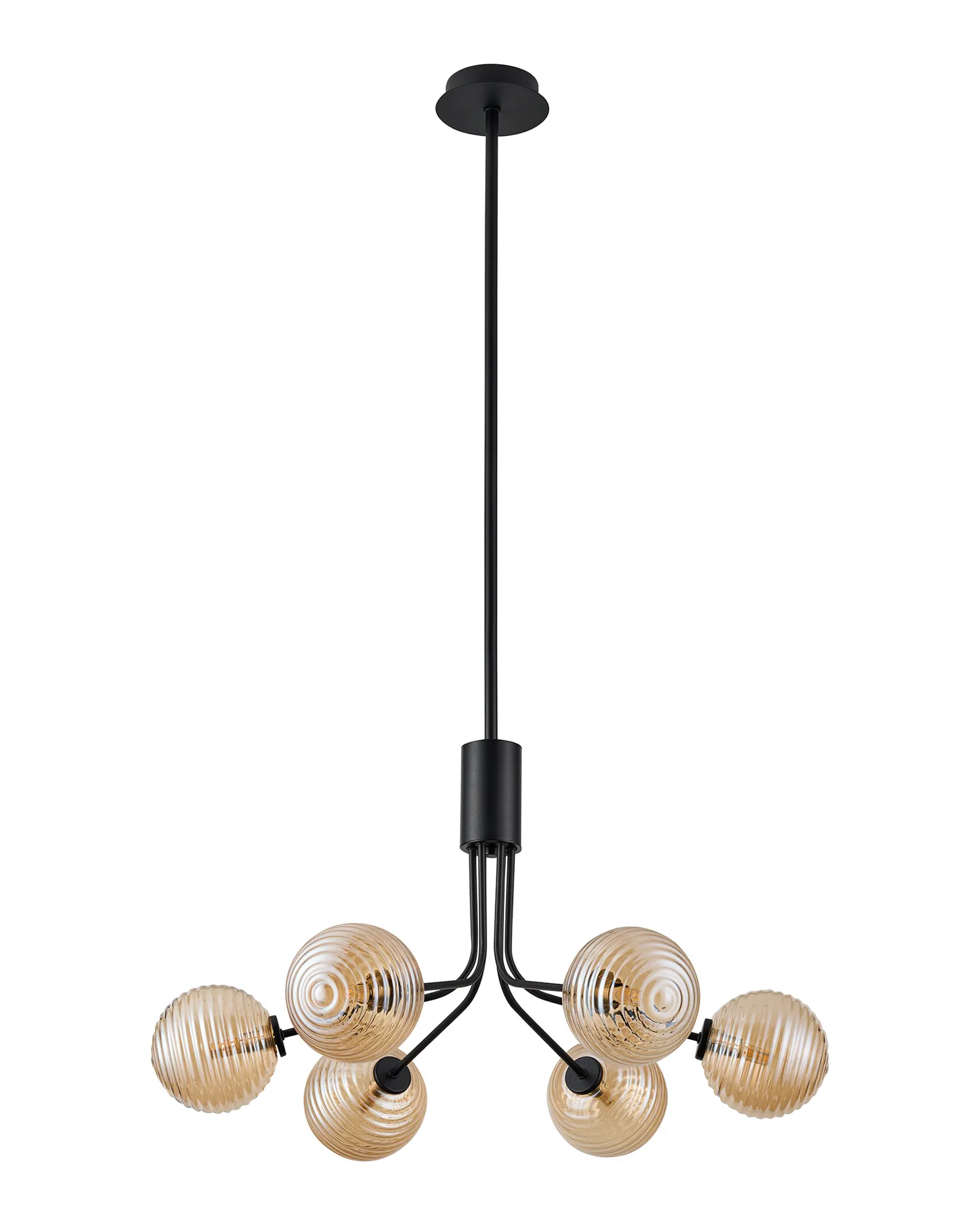 OTHER Duncan Fixed Pendant, 6 Light G9, Satin Black/Amber Ribbed Round Glass Shade