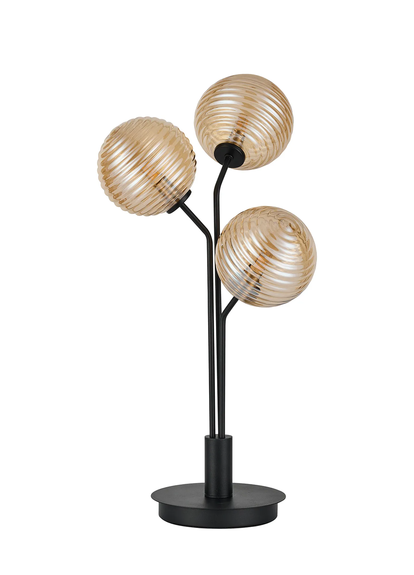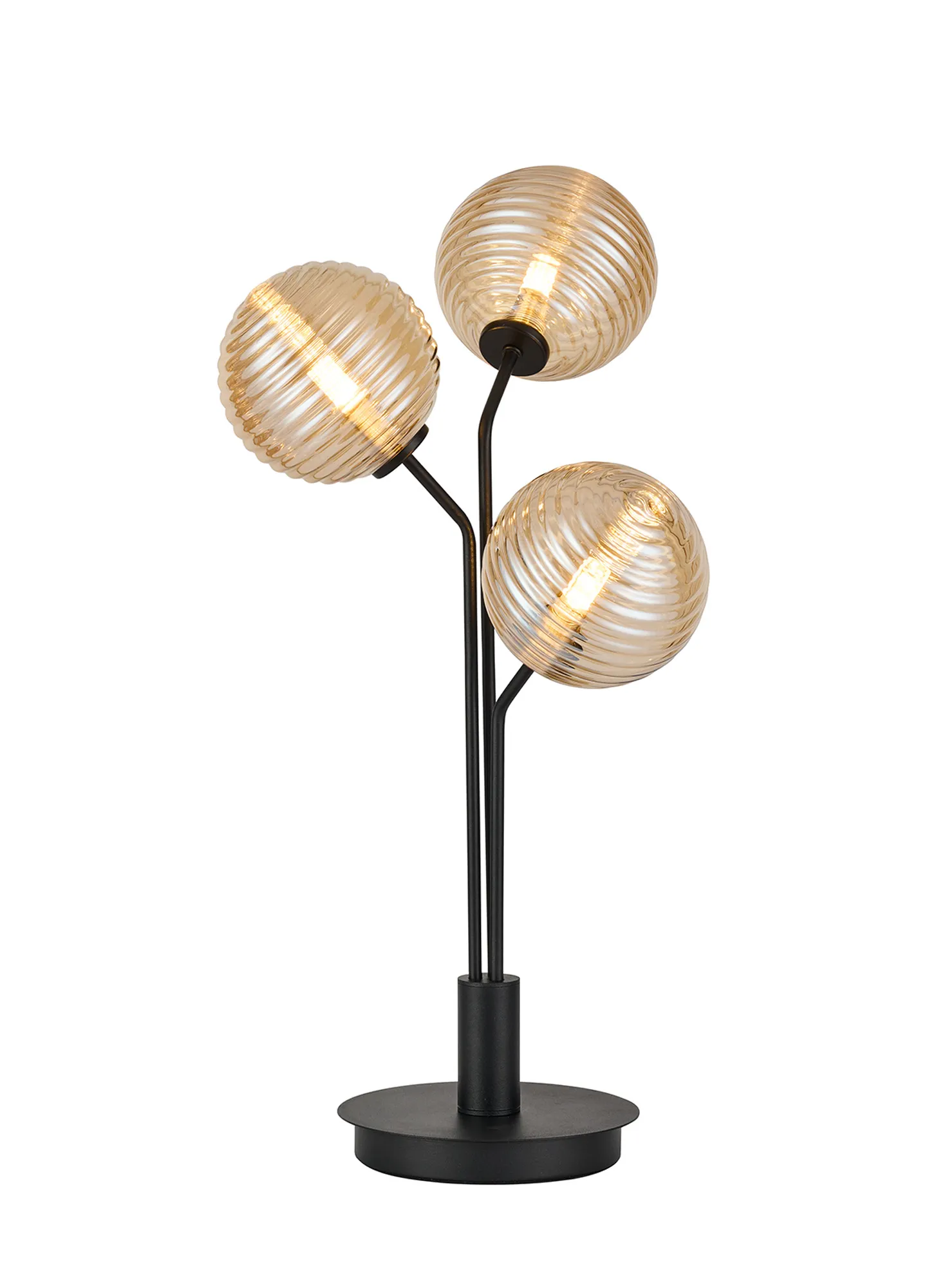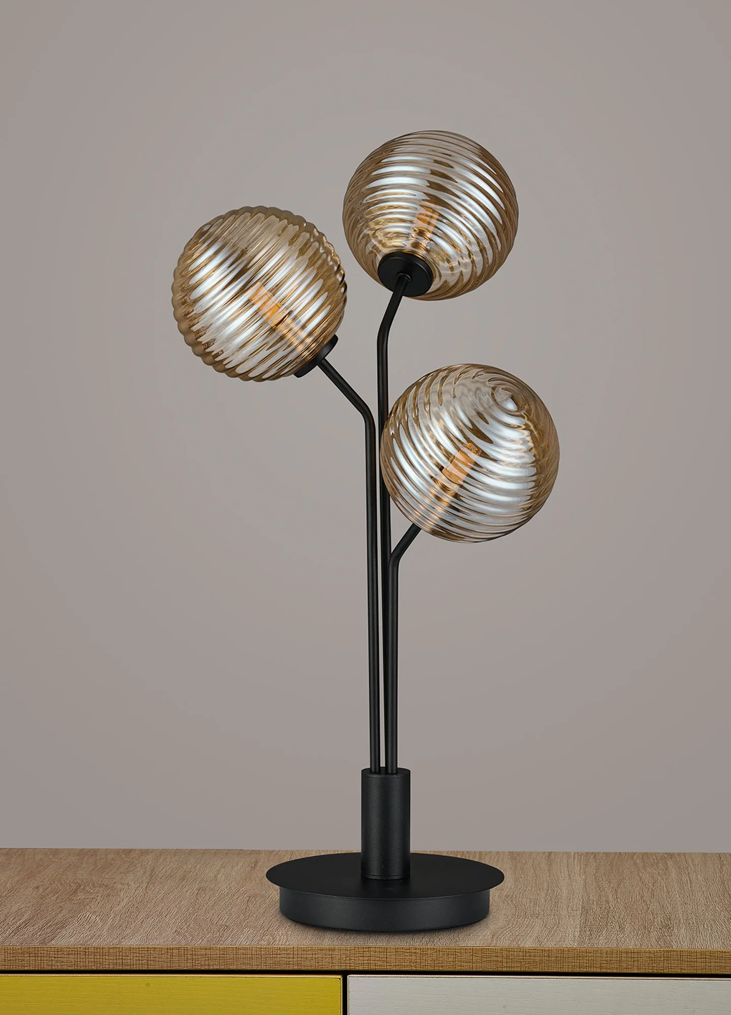 OTHER Duncan Table Lamp, 3 Light G9, Satin Black/Amber Ribbed Round Glass Shade