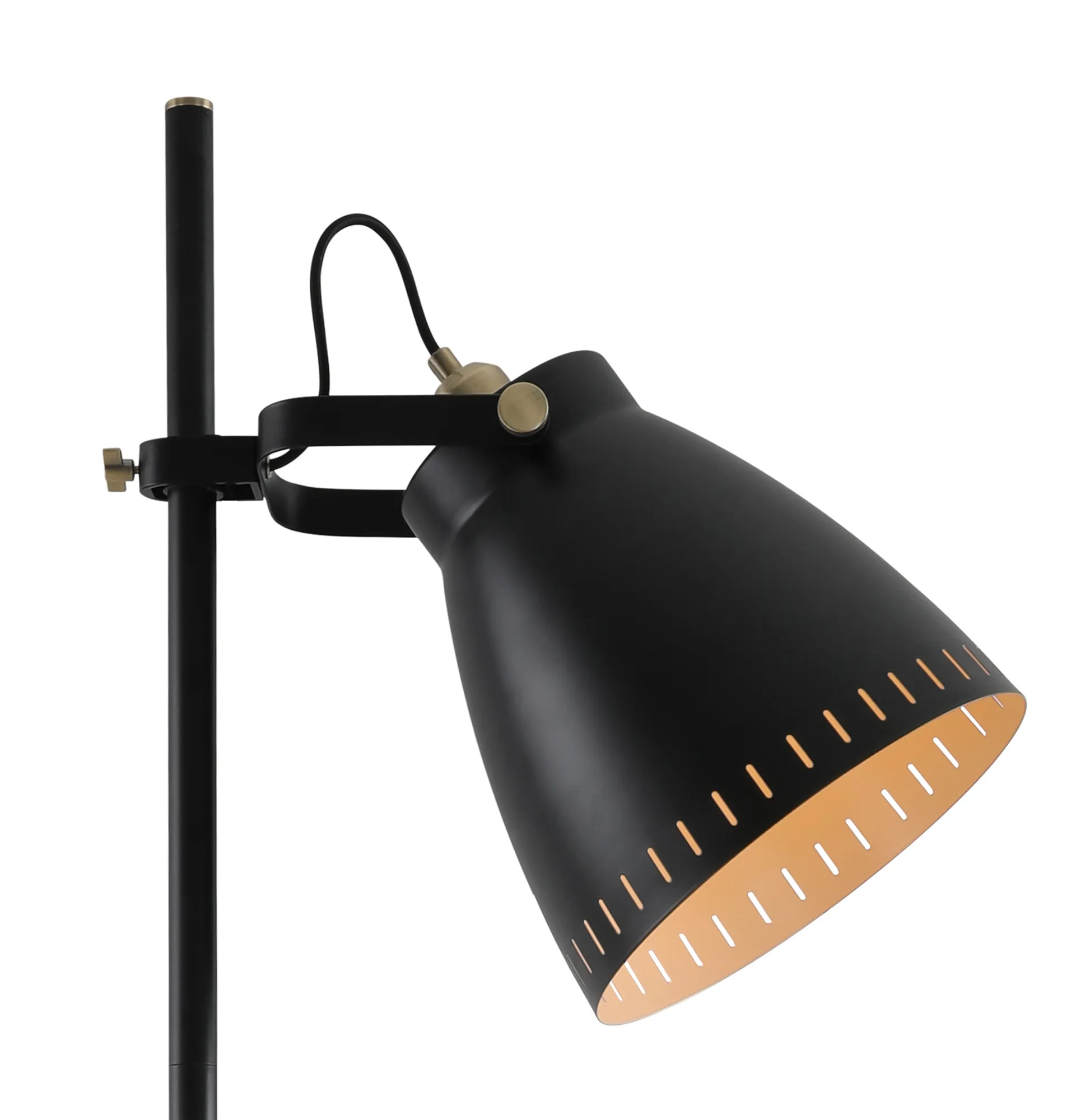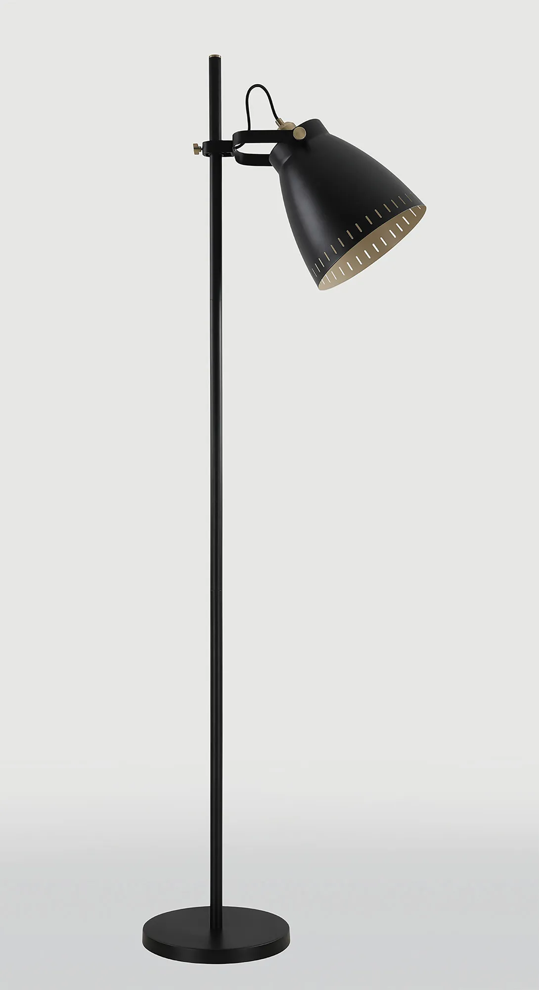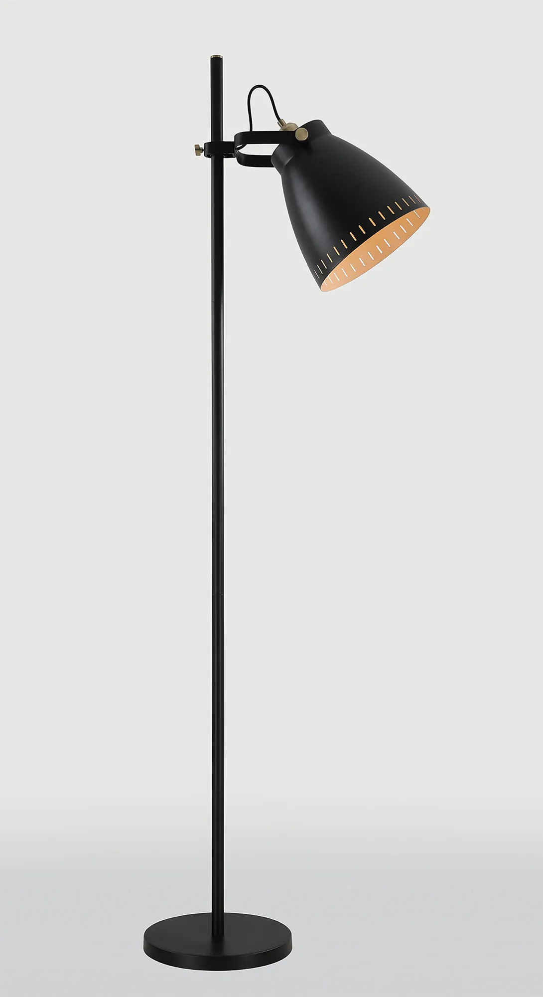 Marton is a comprehensive range which awards a number of original features to a classic design concept. A familiar metal, narrow domed shade houses the E27 lamp holder on a selection of pendants and matching wall, table and floor lamp. Our designers have given these adjustable fixtures a modern twist firstly with the colour finishes of each component. The majority of the fittings have a matt black finish with the lamp holders and adjustable bolts coated in antique brass. The most unique colour is on the inside of each shade which has a khaki finish; in order to further accentuate this whilst also adding another feature, the edge around the outer rims of the shades have small oval cut outs to display the inner shade and create fascinating shadows when illuminated.