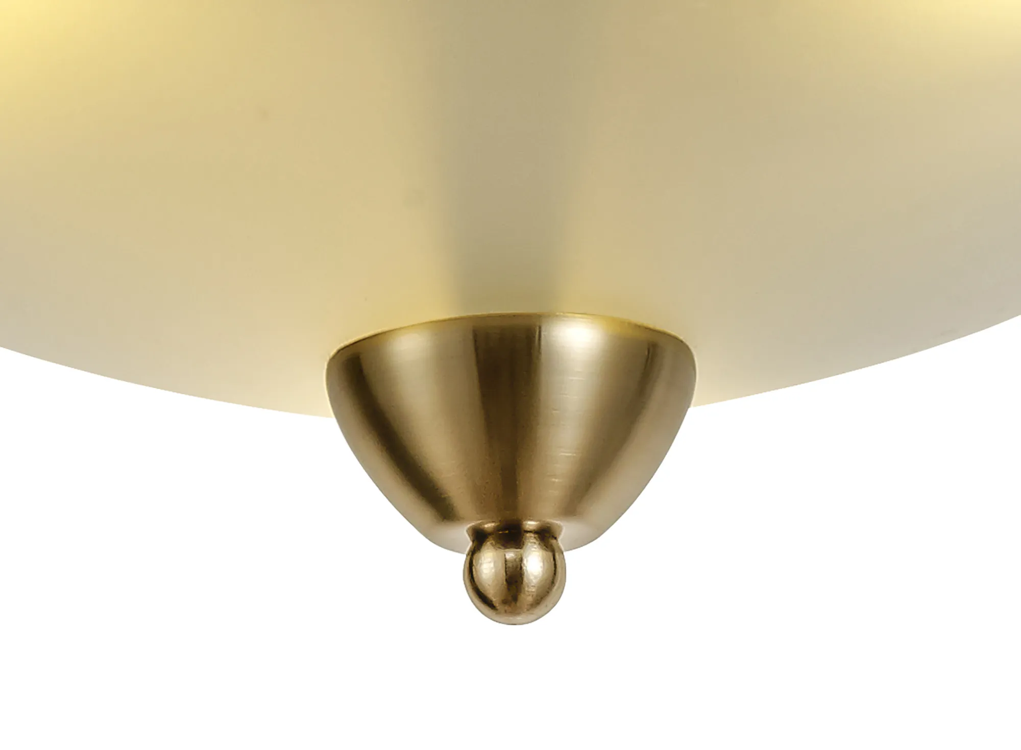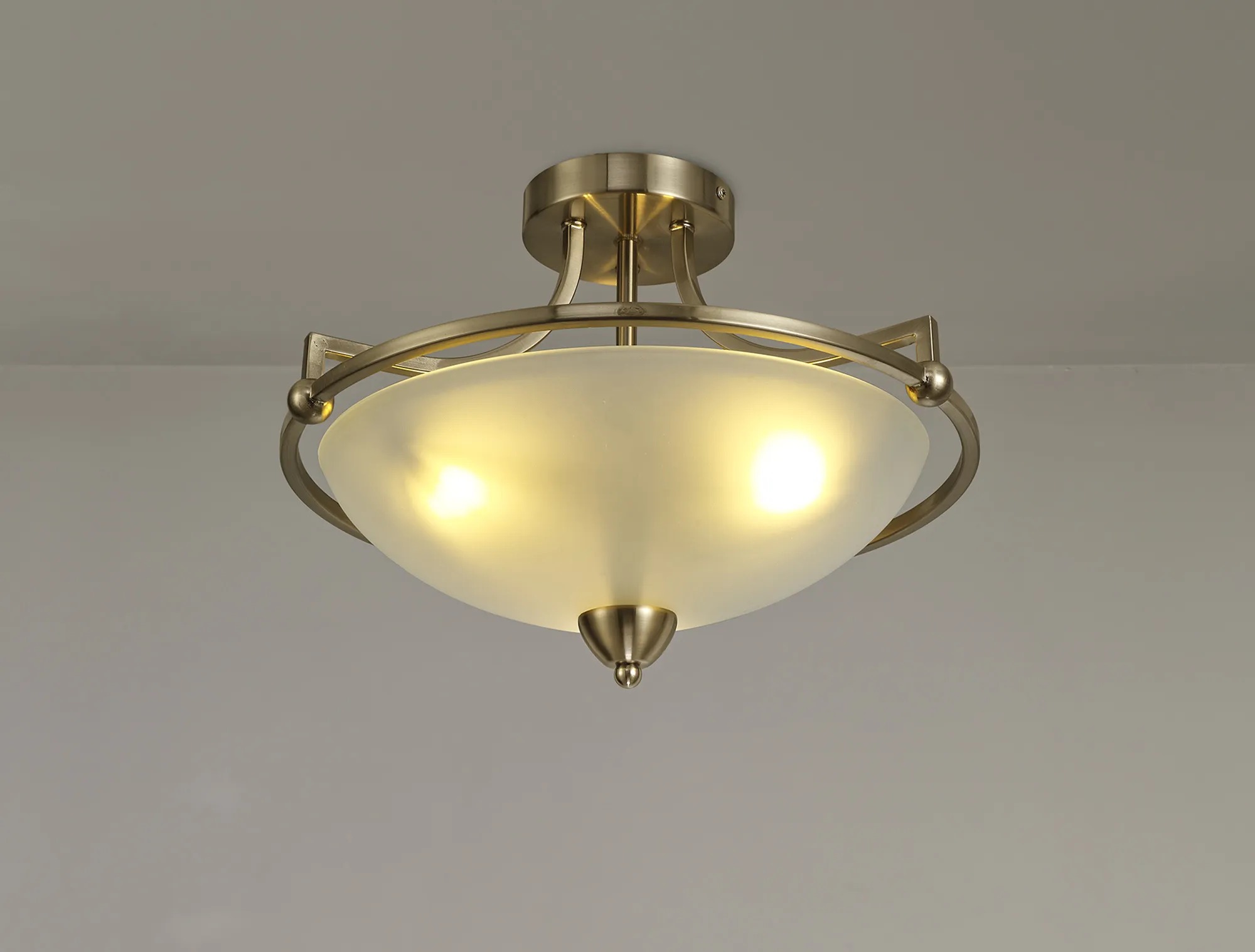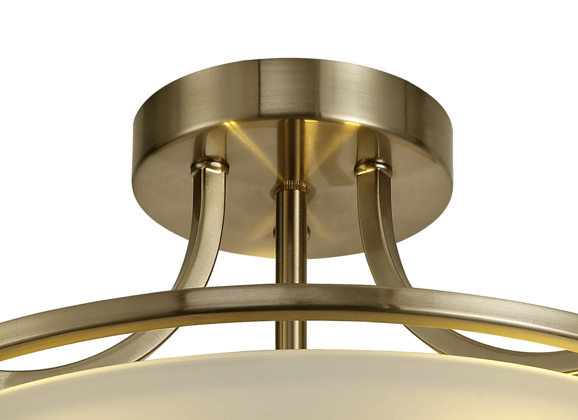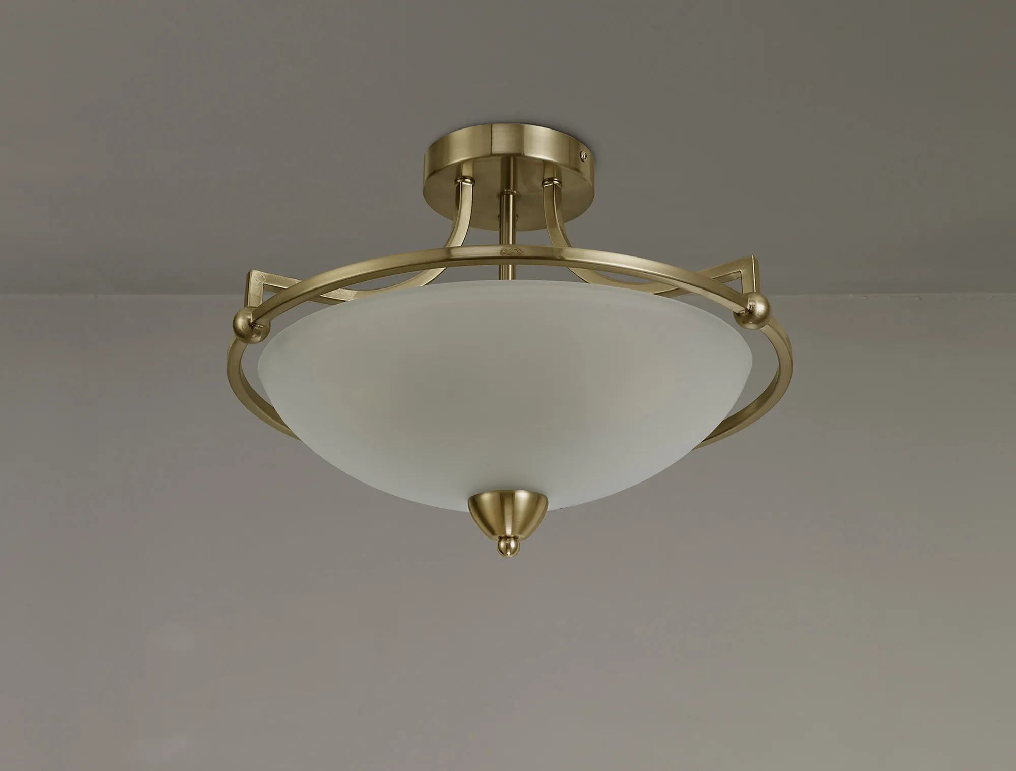 Macraes is a contemporary semi flush ceiling light available in a satin nickel or antique brass colour finish. The 35cm frosted glass conceals the E27 lamp holders gently filtering the light emitted from the chosen lamp used.