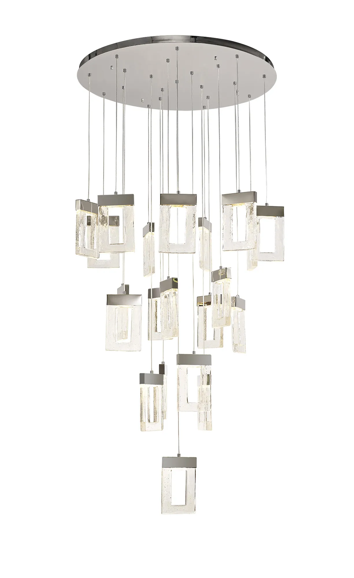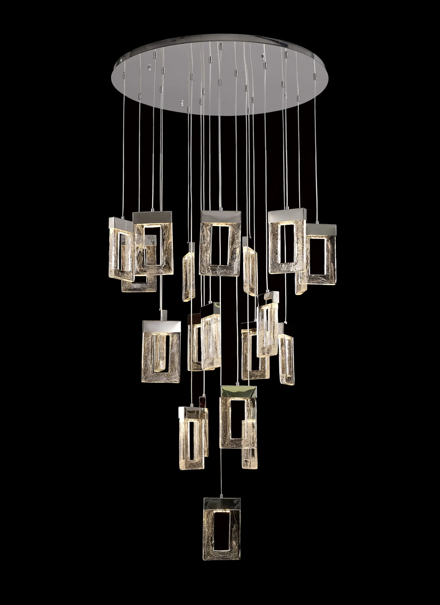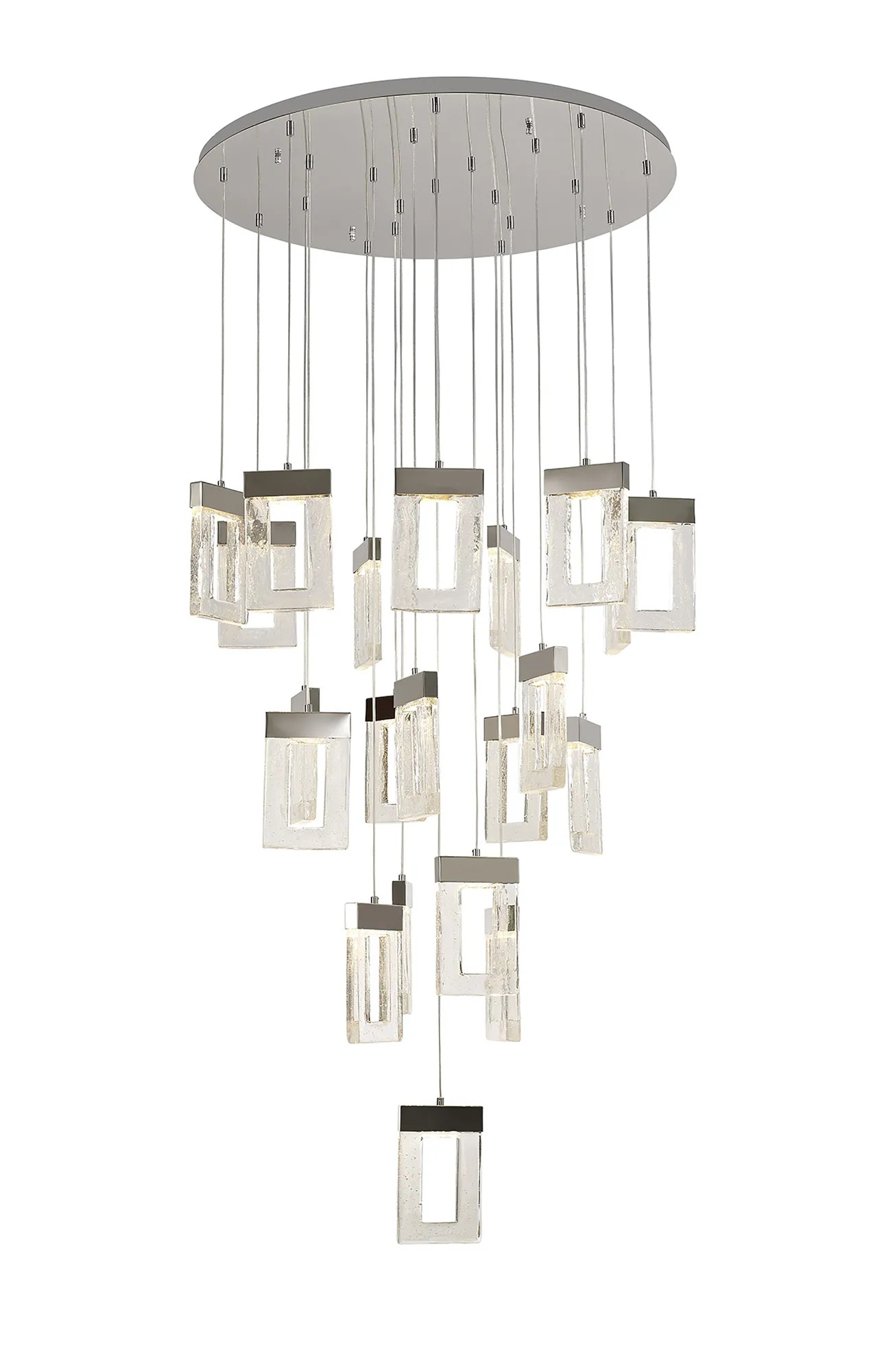 The Riverhead range includes a multiple LED pendant which hosts a combination of inventive design concepts boasting an individuality within the lighting market. Each drop sees a rectangular glass piece with a central cut-out, moulded to replicate frozen water. The glacial effect looks even more captivating when illuminated by the integral 3000K LEDs which are situated within the polished chrome cap above every glass. With a drastic maximum 5m drop this Riverhead piece will make a grand impact. Due to its popularity this range has been expanded to now include a single 2m pendant and complementing wall lamp.