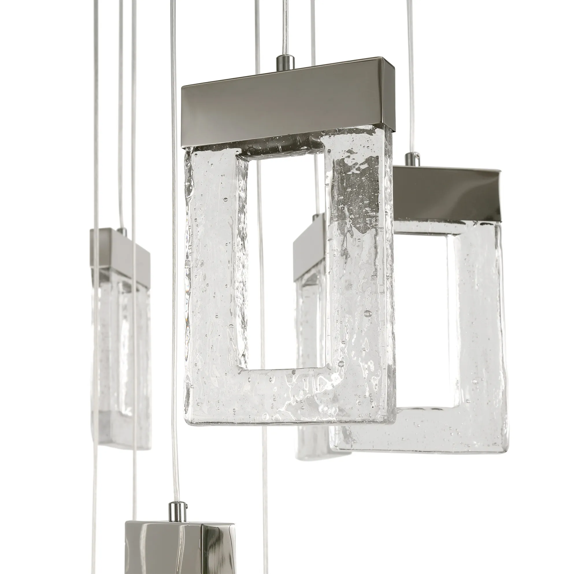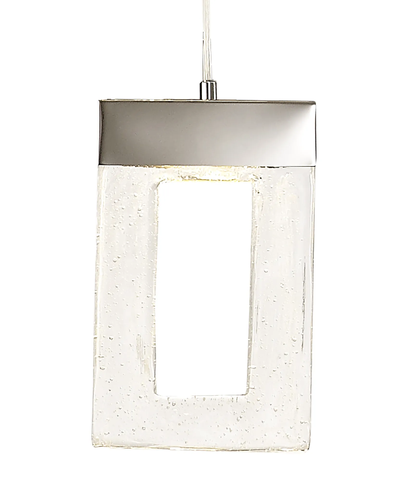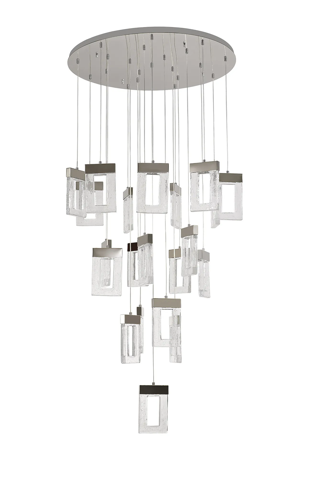 The Riverhead range includes a multiple LED pendant which hosts a combination of inventive design concepts boasting an individuality within the lighting market. Each drop sees a rectangular glass piece with a central cut-out, moulded to replicate frozen water. The glacial effect looks even more captivating when illuminated by the integral 3000K LEDs which are situated within the polished chrome cap above every glass. With a drastic maximum 5m drop this Riverhead piece will make a grand impact. Due to its popularity this range has been expanded to now include a single 2m pendant and complementing wall lamp.